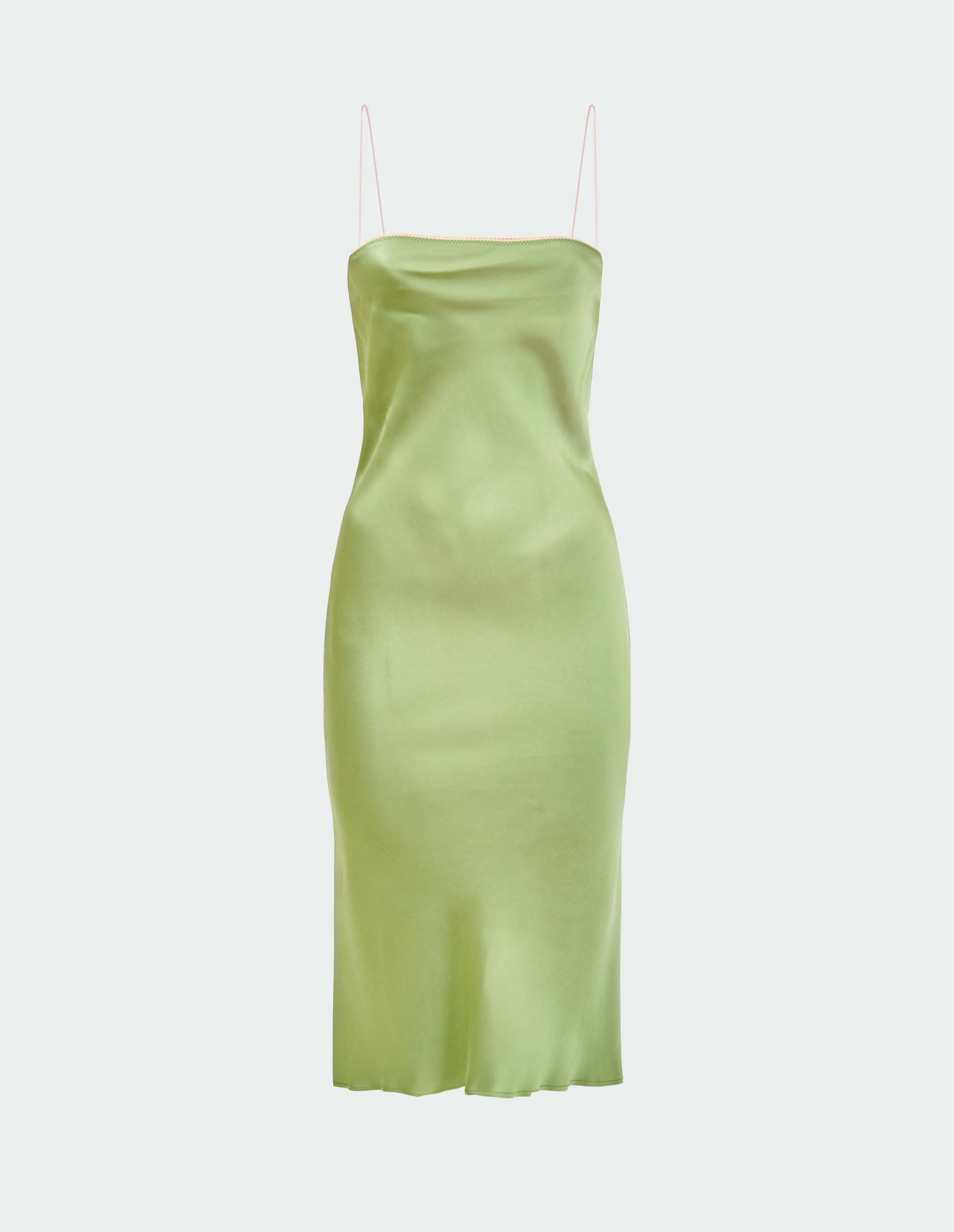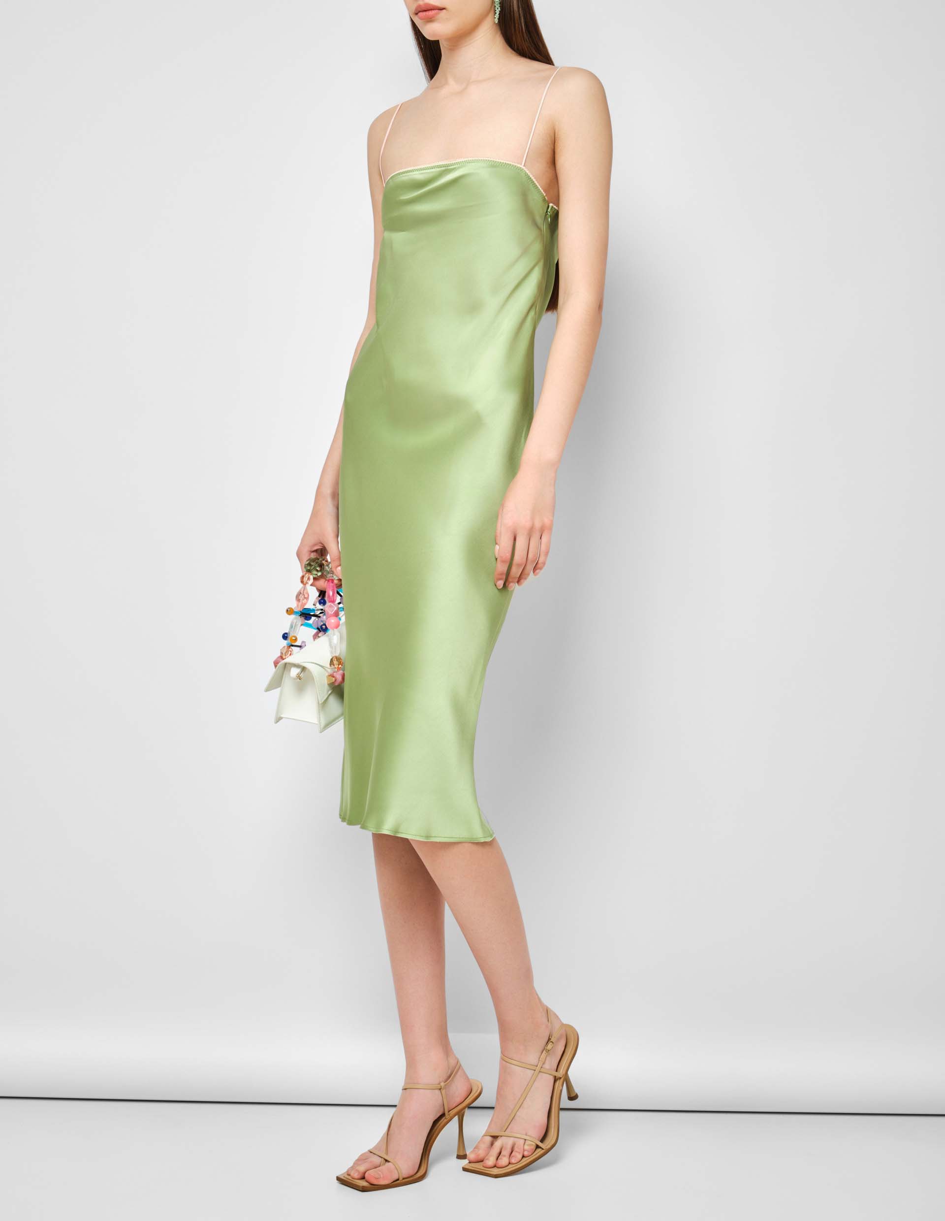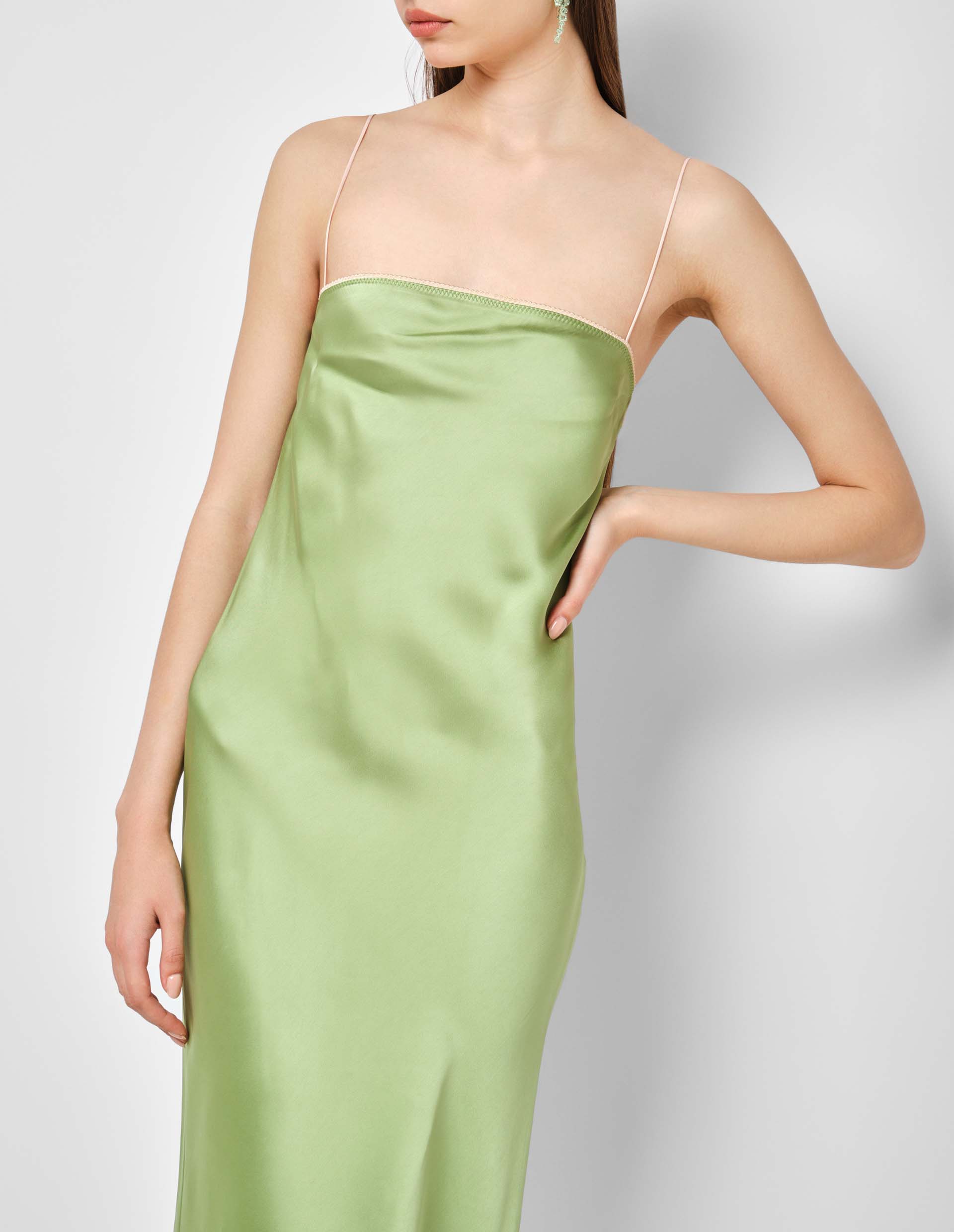 Именно так выглядит чувственная женственность от бренда N°21: платье-миди из роскошного сатина в природном оттенке зеленого Nile Green. Дизайнер выбрал гладкий переливчатый материал на базе 100% вискозы, чтобы подчеркнуть динамичность тона, и утонченные линии верха с изящными бретелями, олицетворяющими итальянскую элегантность.