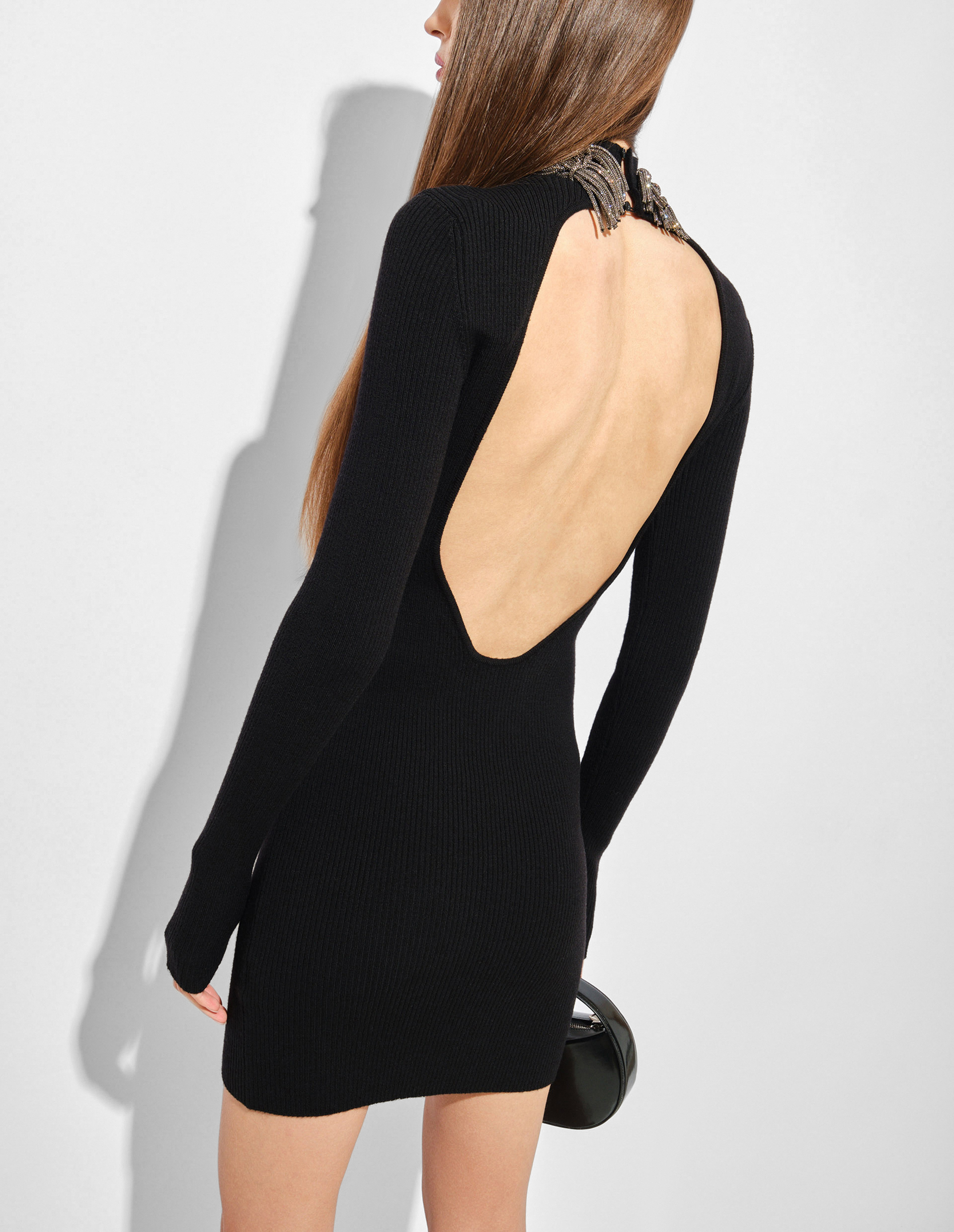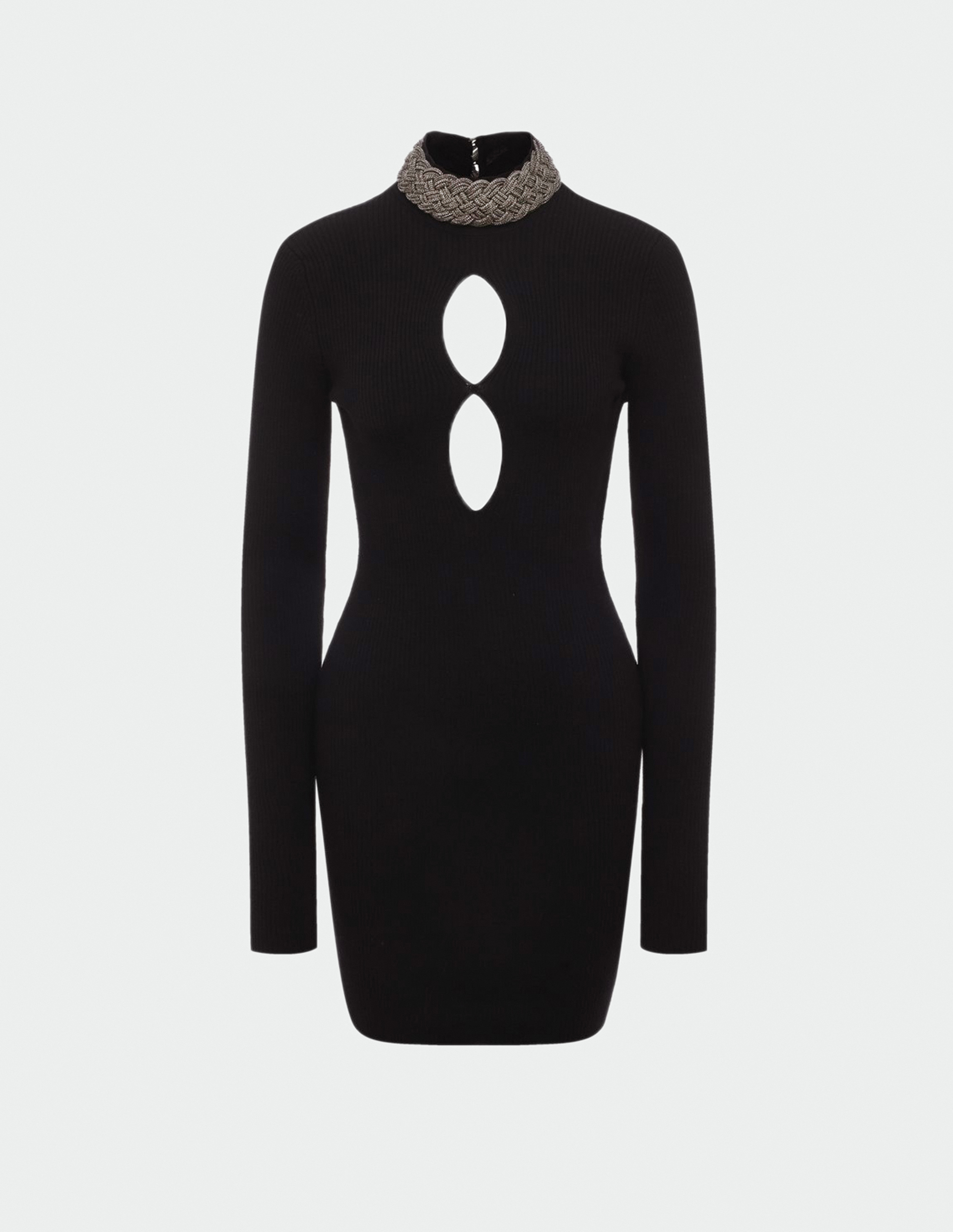 Веря в союз прошлых и настоящих стандартов красоты, прославляя индивидуальность через свои отличительные дизайны, Giuseppe Di Morabito создал это одновременно эффектное и комфортное платье. Оно изготовлено по канонам ремесленного мастерства, прославляющего качество Made in Italy через премиальный материал и точный пошив. Основой ткани с ребристой поверхностью стала натуральная шерсть и лайкра, позволяющая изделию плотно облегать фигуру и играть деликатными переливами. Визуальными элементами, вносящими чувственность, являются фигурные вырезы на груди и открытая спина. Для баланса между пикантностью и сдержанной элегантностью добавлен высокий ворот, украшенный плетеной лентой-чокером со стразами.