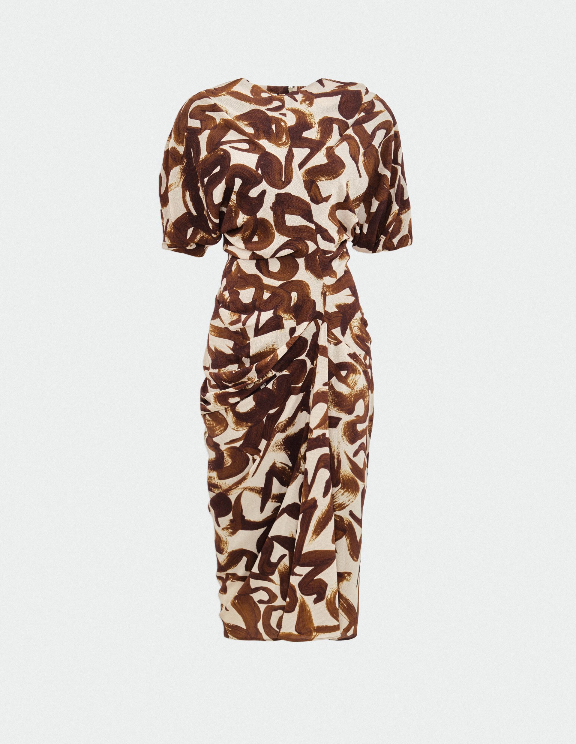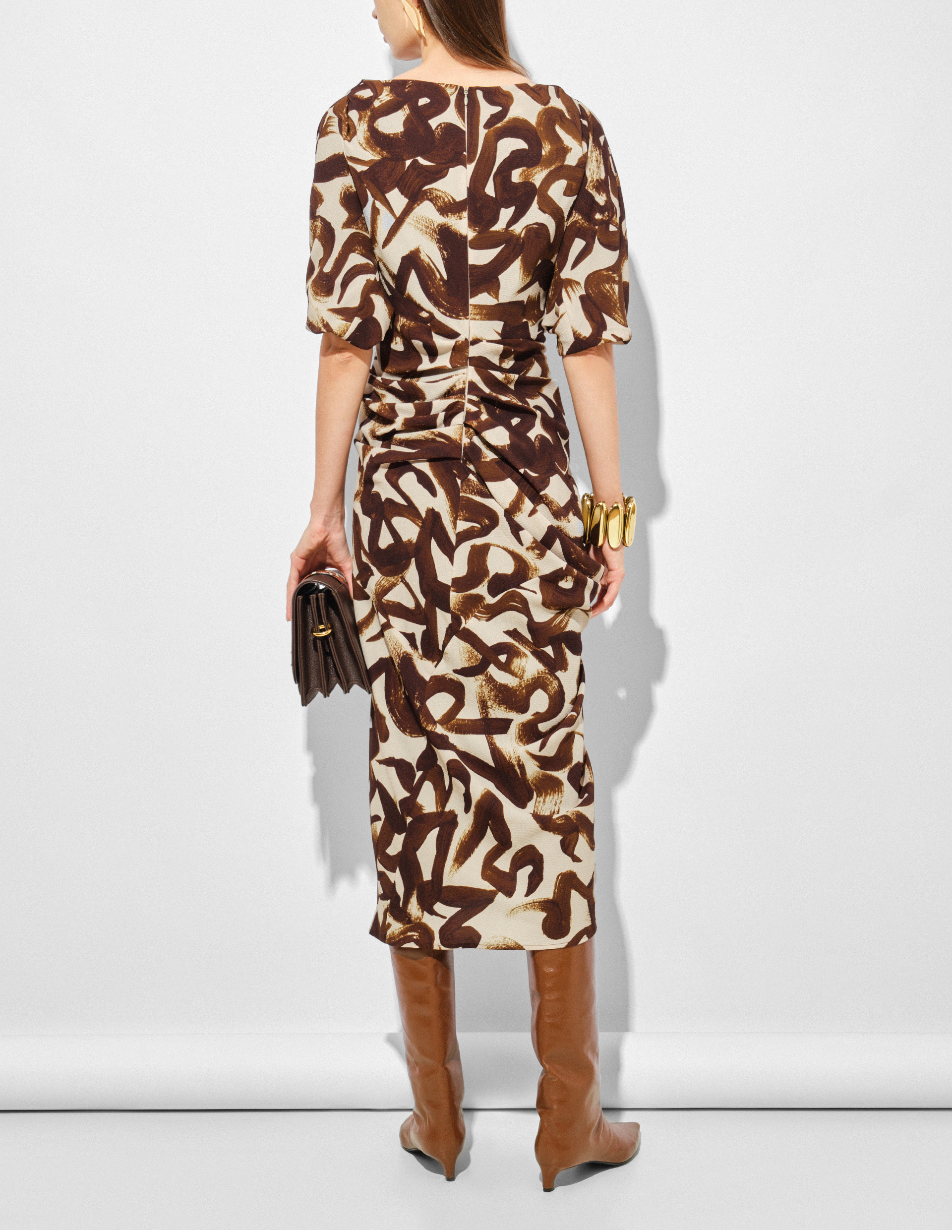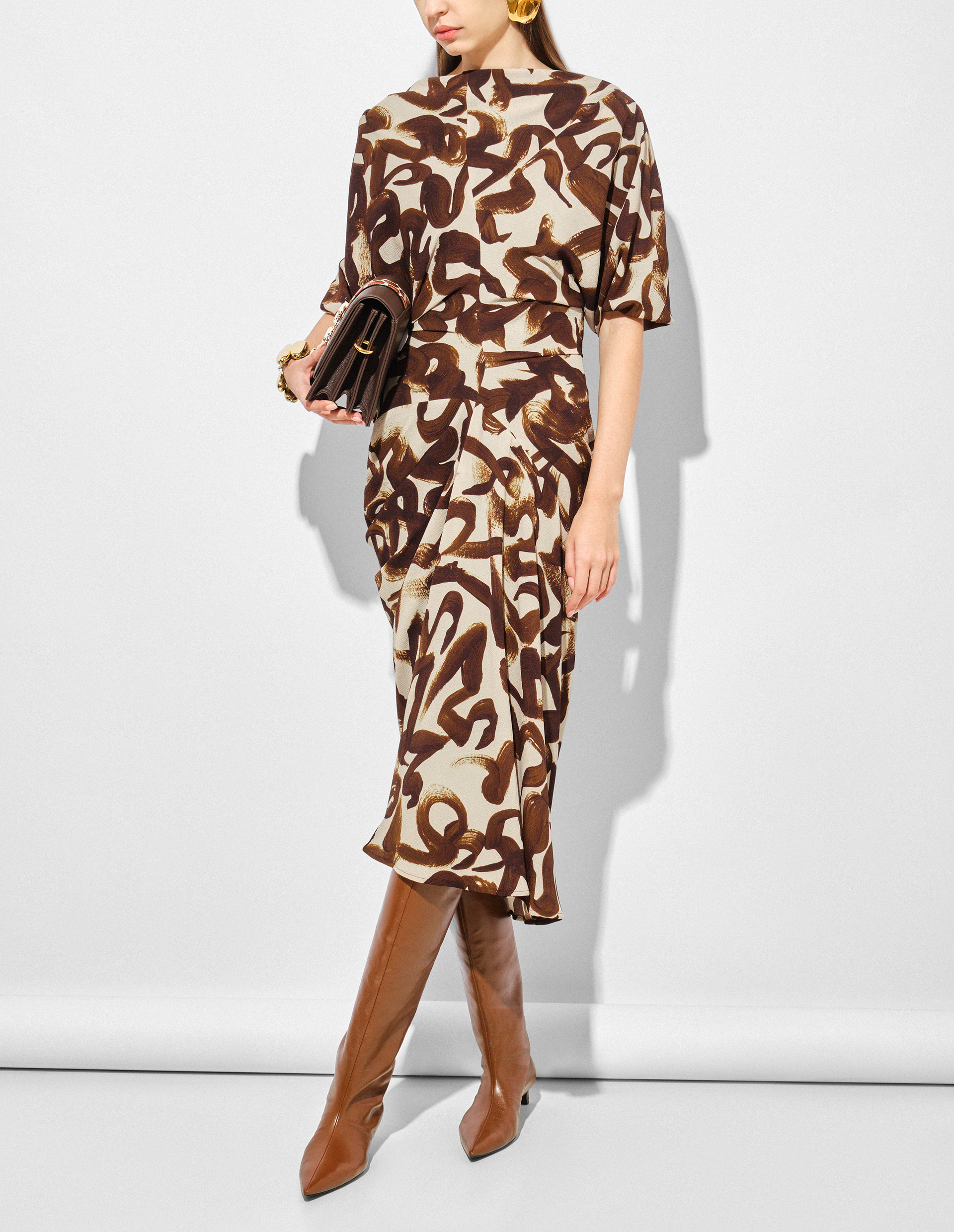 Женственность, одновременно нежная и сильная, вдохновила великого Dries Van Noten на создание этого великолепного платья. Модель отмечена вырезом-лодочкой и сосотоит из асимметричных панелей, соединенных безупречными швами. Креповая ткань также собирается драпировкой спереди и сзади, словно вылепливая силуэт: дерзкий, но одновременно нежный и сильный. Принт в оттенке темной охры, кажущийся спонтанным, на самом деле обдуман и выполнен вручную, напоминая широкие мазки кисти, поверх которых талантливый художник нанес золотые блики. Именно так достигнута абсолютная уникальность и проработка деталей.