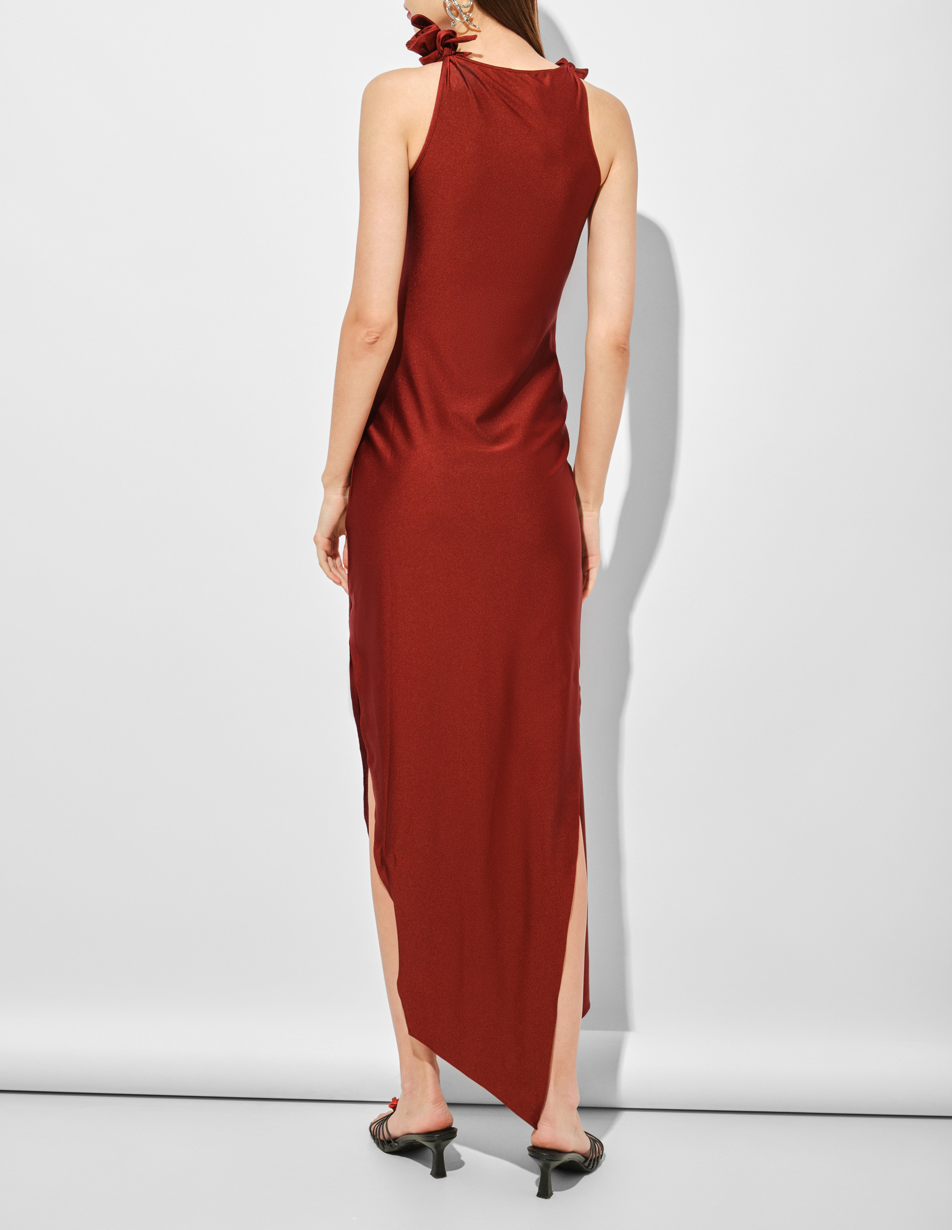 Шикарно, качественно, по-французски красиво — платье Coperni становится узнаваемым отражением эстетики люксового бренда. Скроенное из блестящего эластичного джерси, которое ловит свет днем и ночью, оно отмечено едва заметной асимметрией и разрезом, мягко облегая фигуру, собираясь деликатной драпировкой. Этот Coperni icon design представлен в новом цветовом решении Wine Red, но все также наполнен интересными элементами и вниманием к деталям: динамичный вырез груди акцентирован несколькими тканевыми узелками, создающими форму роз.