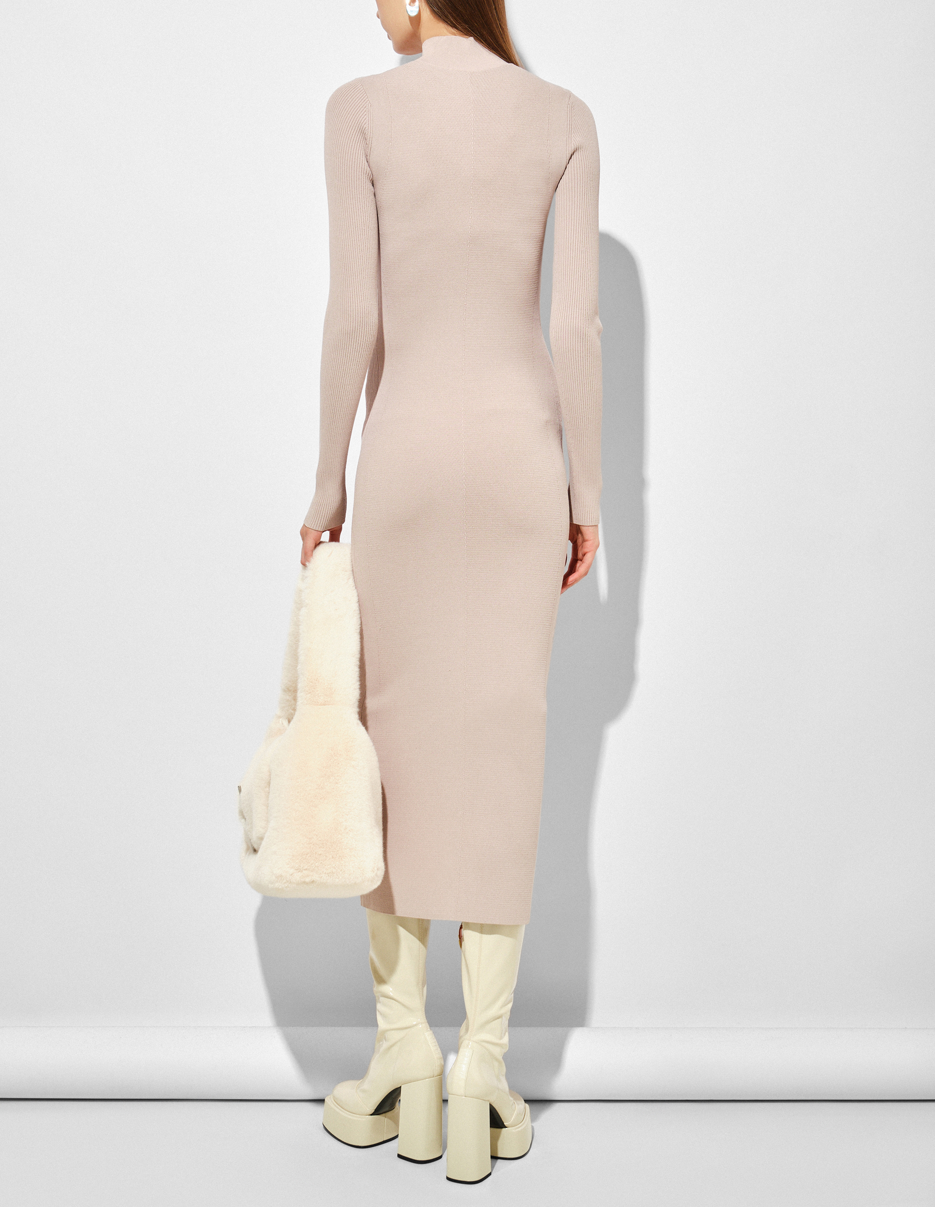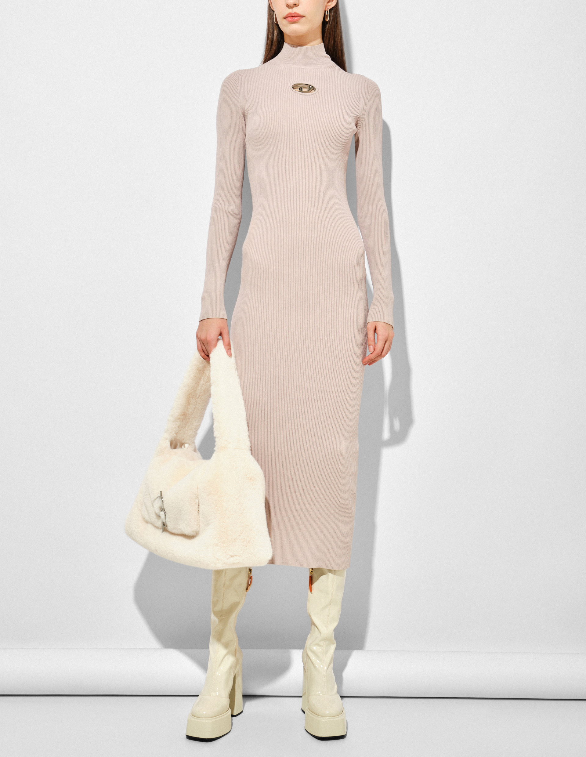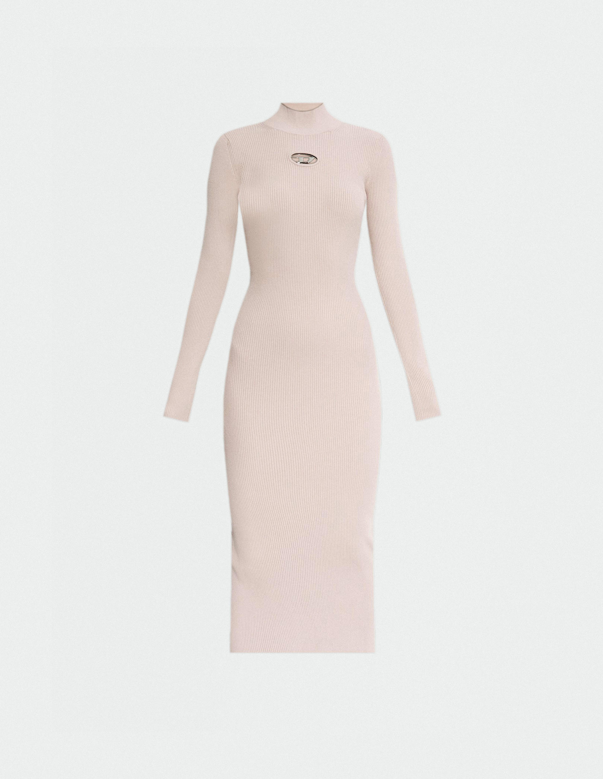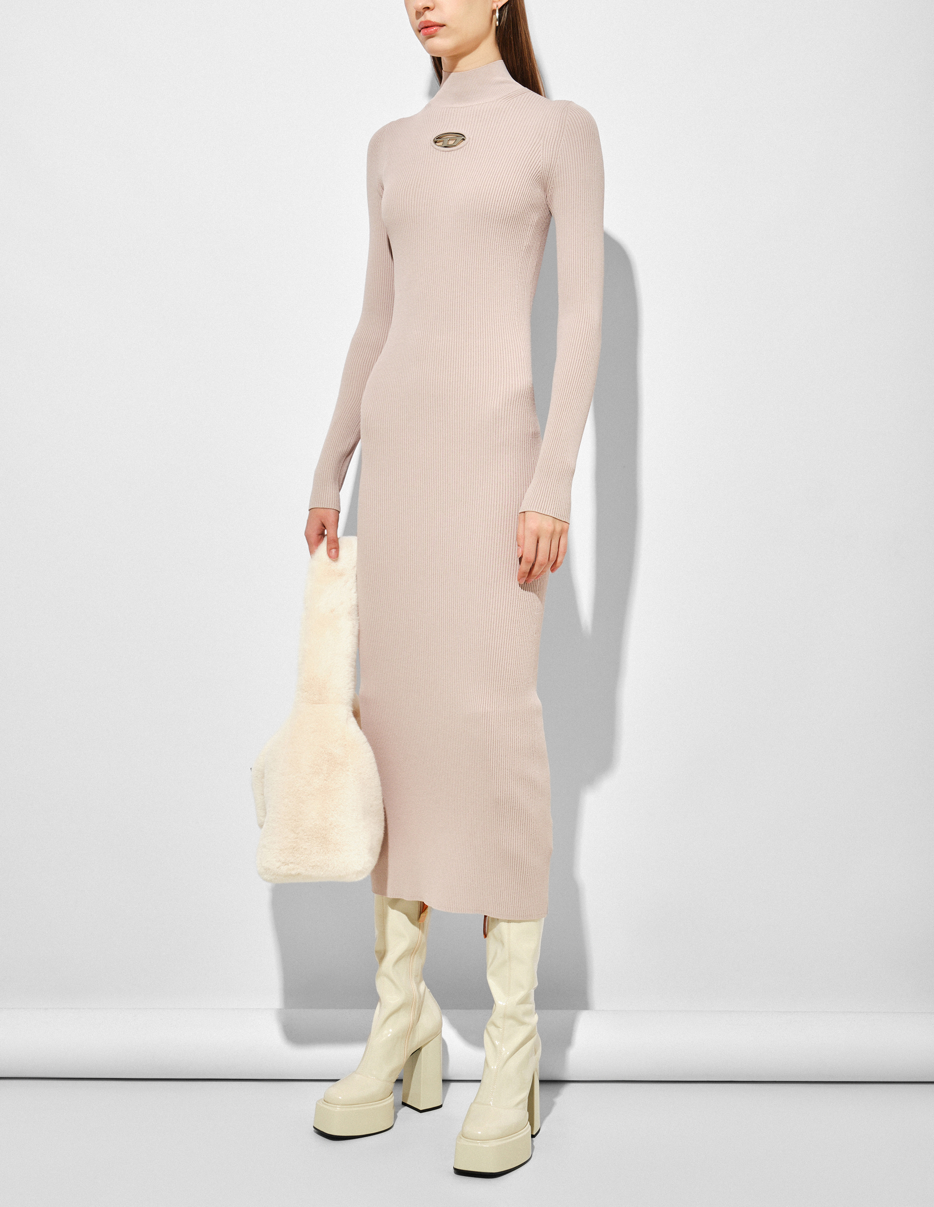 Облегающее платье в оттенке Powder Gray, созданное из ребристого трикотажа на основе растительной вискозы-rayon, обладающей шелковистостью, гигроскопичностью и гипоаллергенностью. Сертифицированное сырье получено из экологически выращенных лесов, подтверждая стремление бренда к устойчивому производству. Миди-силуэт характеризуется воротником-стойкой, длинными рукавами и украшением в виде вшитого в вырез на груди металлического логотипа Oval D с прорезными отверстиями как свидетельство знаковой идентичности Diesel, а также для деликатной демонстрации вашей кожи.