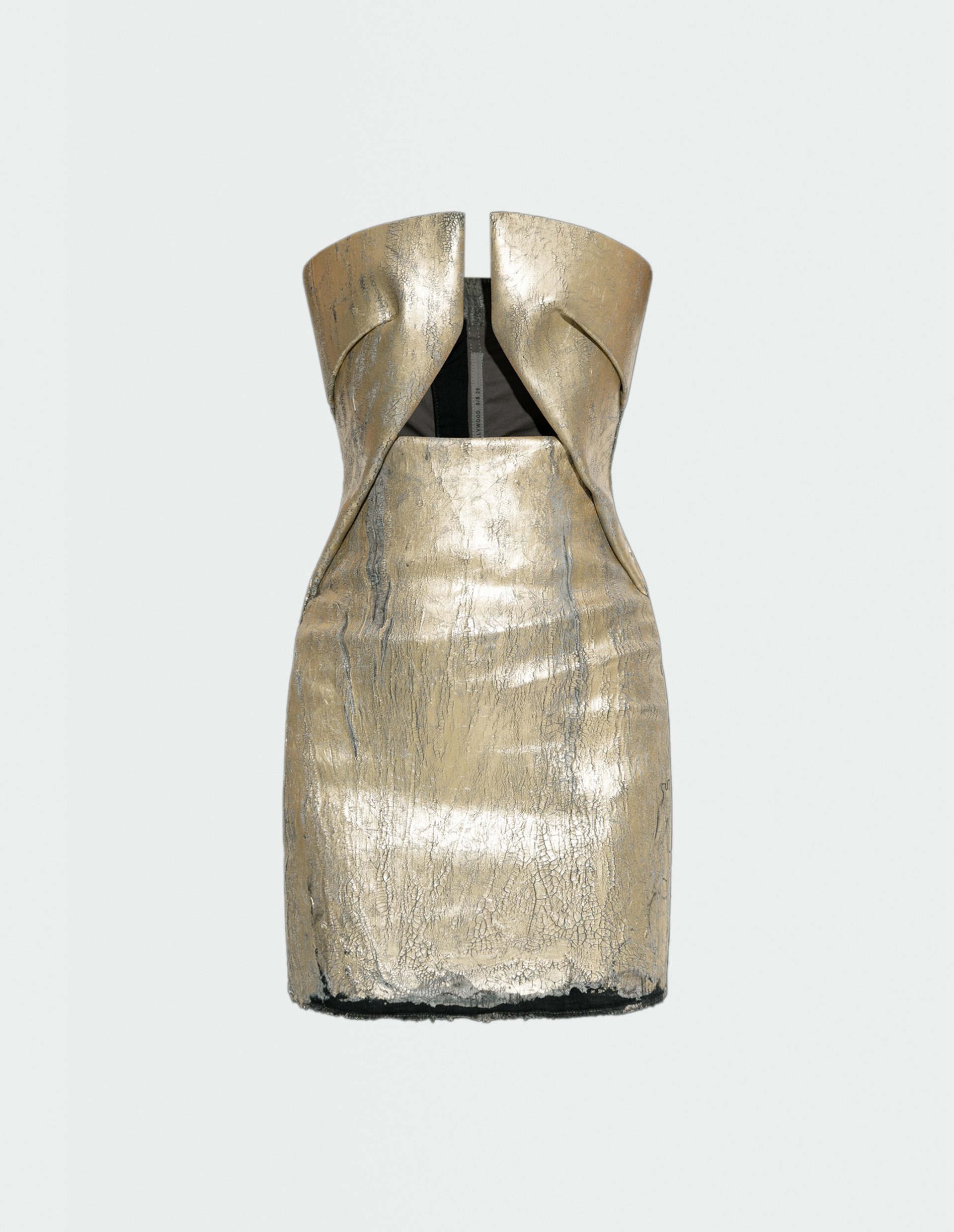 Мини-платье PRONG от RICK OWENS из линейки SS25 HOLLYWOOD — археологический артефакт будущего, золотая кора на теле, трескающаяся под давлением времени. Его укороченный силуэт обнажает саму суть, а геометрический корсетный вырез заковывает тело в архитектурный панцирь.