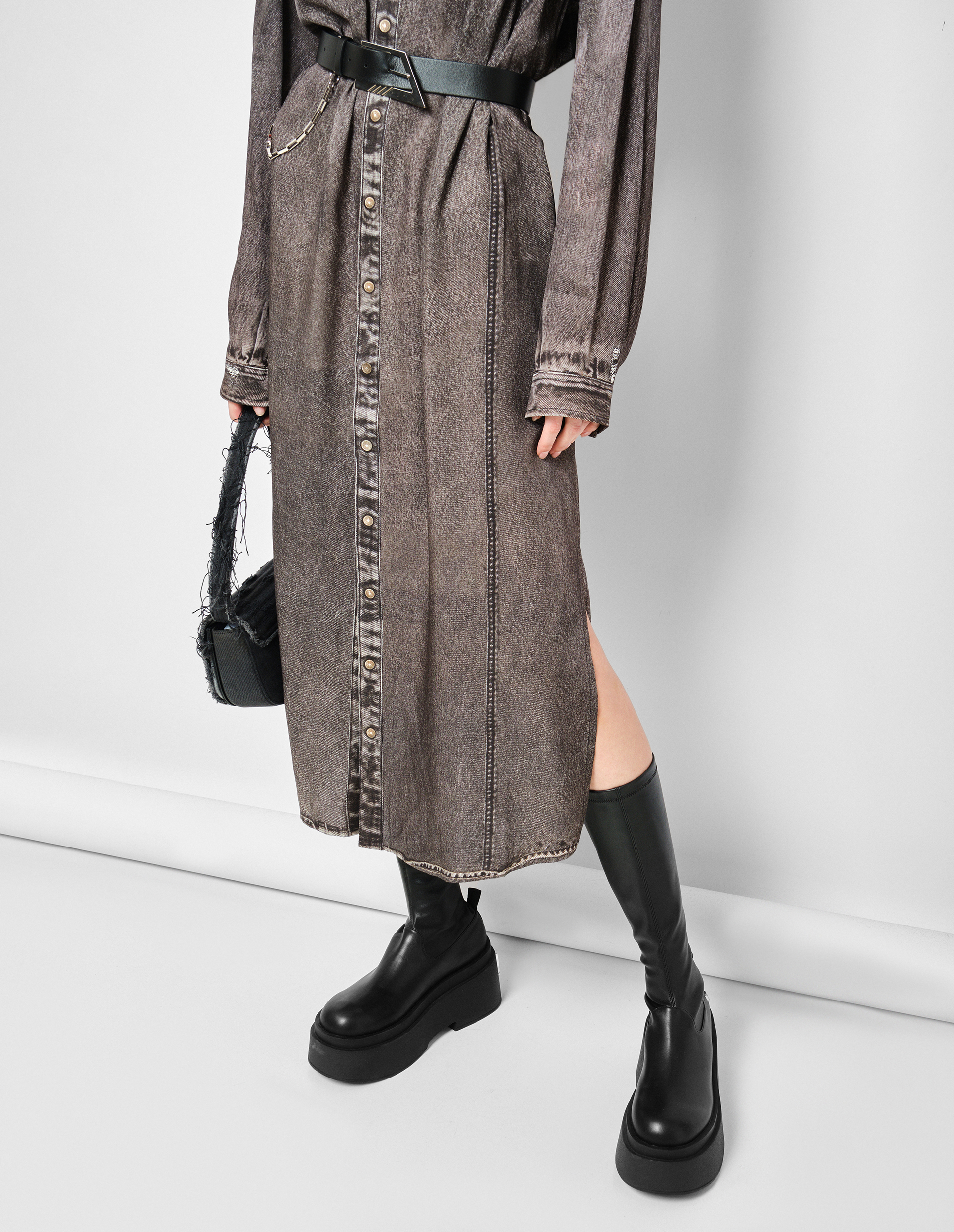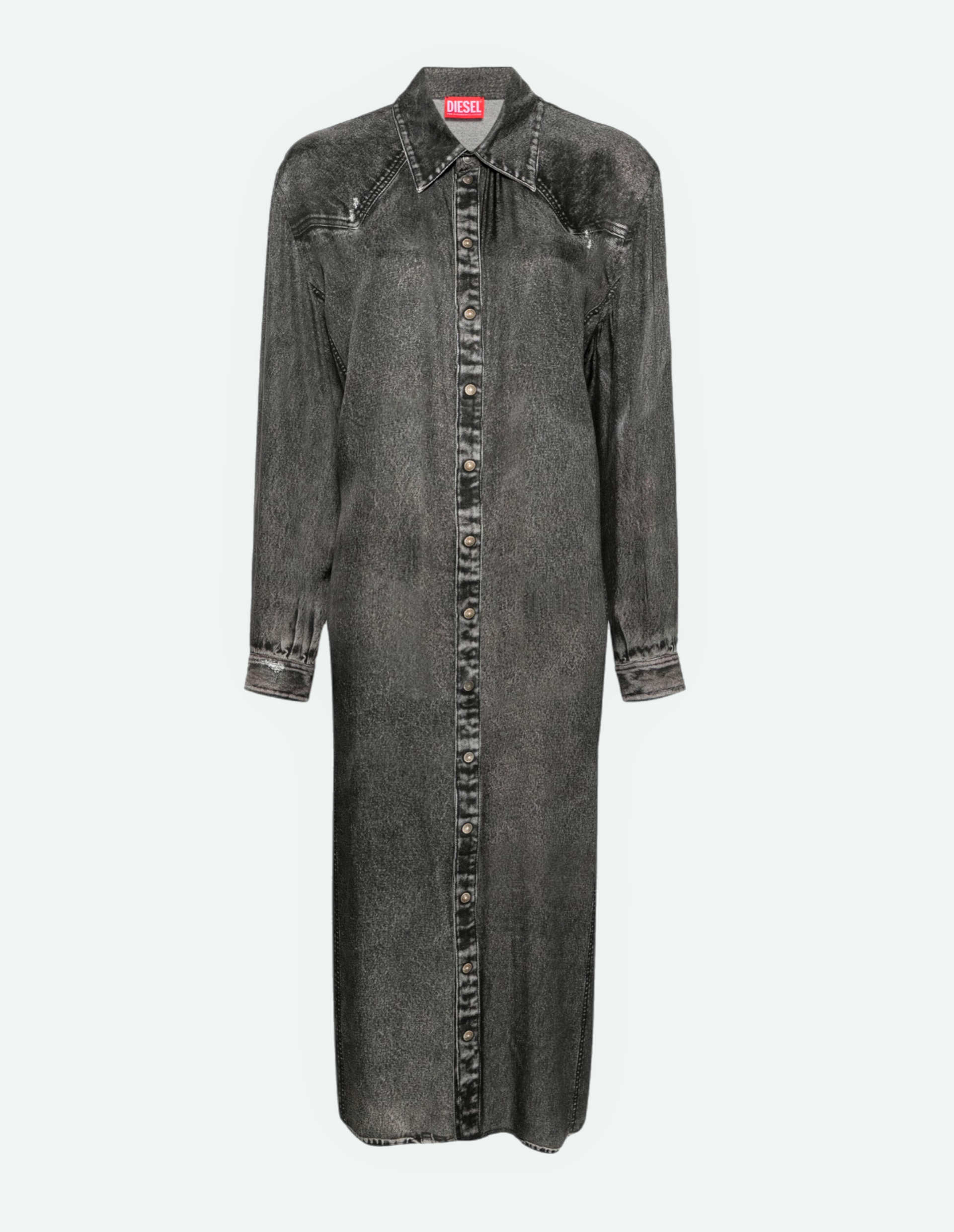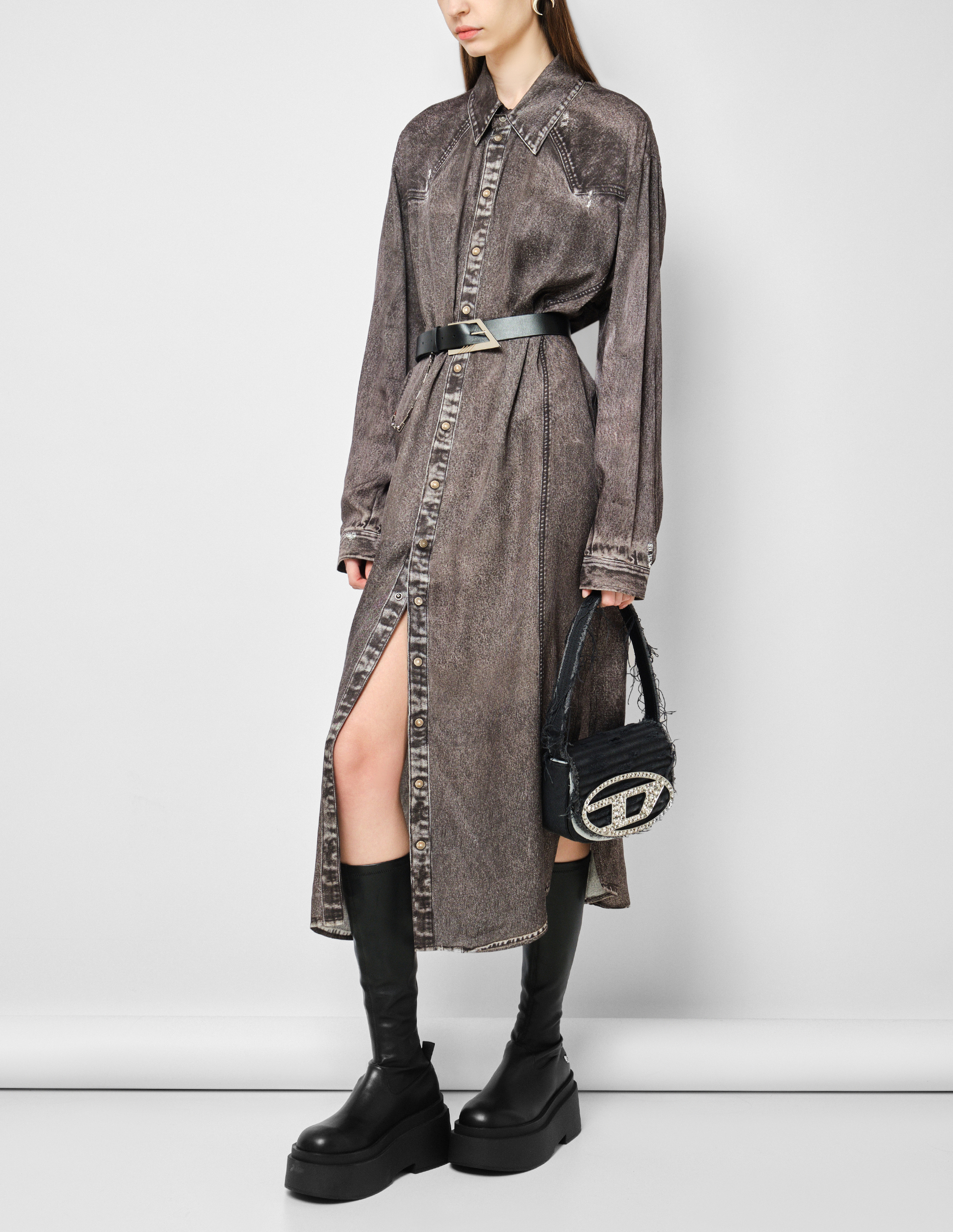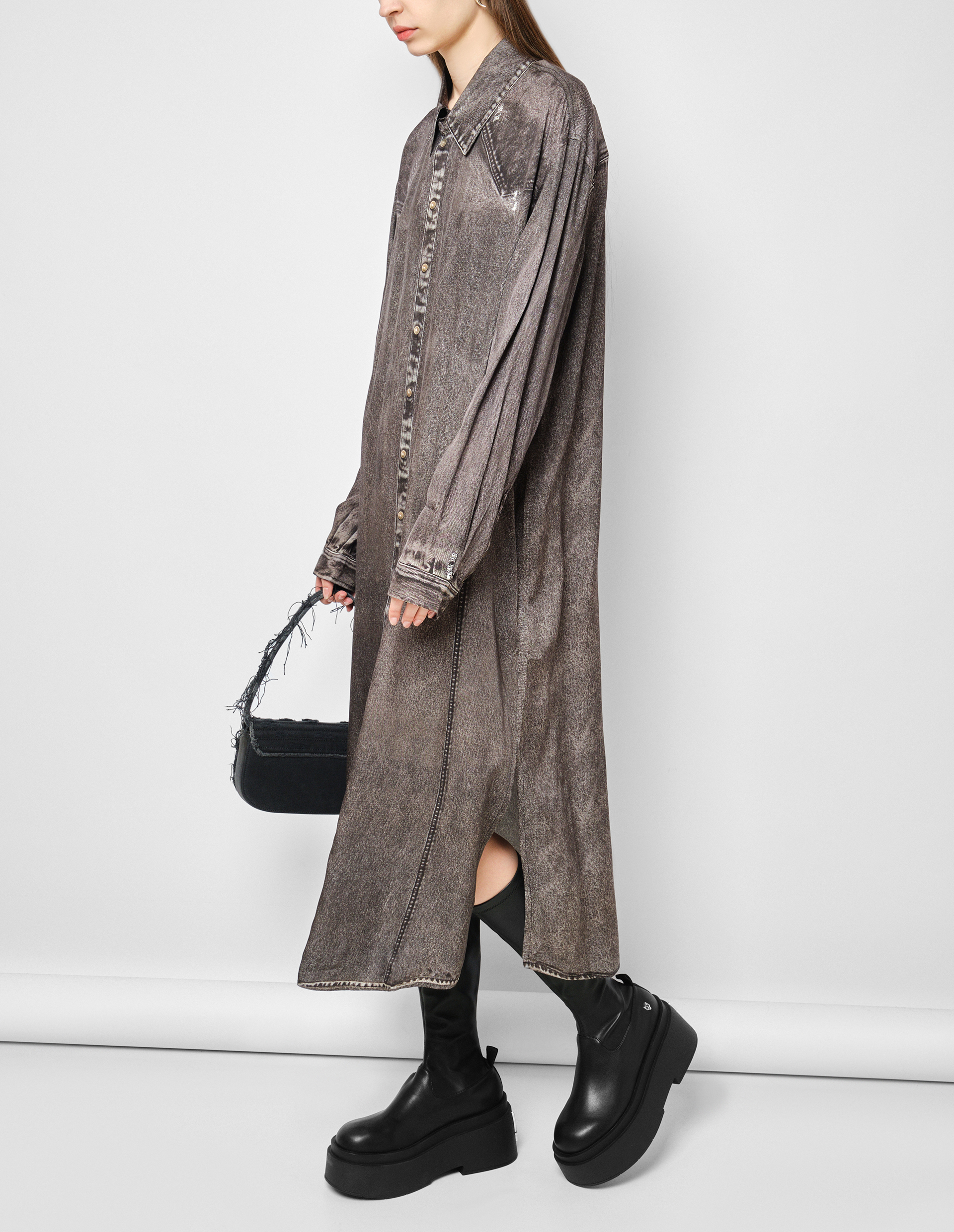 Платье-рубашка D-ALTON-N1. Создано из ткани с твиловым переплетением на базе 100% вискозы. Имеет слегка объемный, расслабленный силуэт с заниженной линией плеч и разрезами по бокам. Удобные кнопки-застежки расположены на пуговичной планке, поверхность которой специально выстирана для создания потертого мраморного вида. На базе темно-серого тона модель дополнена винтажным эффектом. Чтобы его добиться, был задействован высокотехнологичный процесс, включающий ручную шлифовку покрытия, чтобы придать каждому изделию эксклюзивный вид потертости.