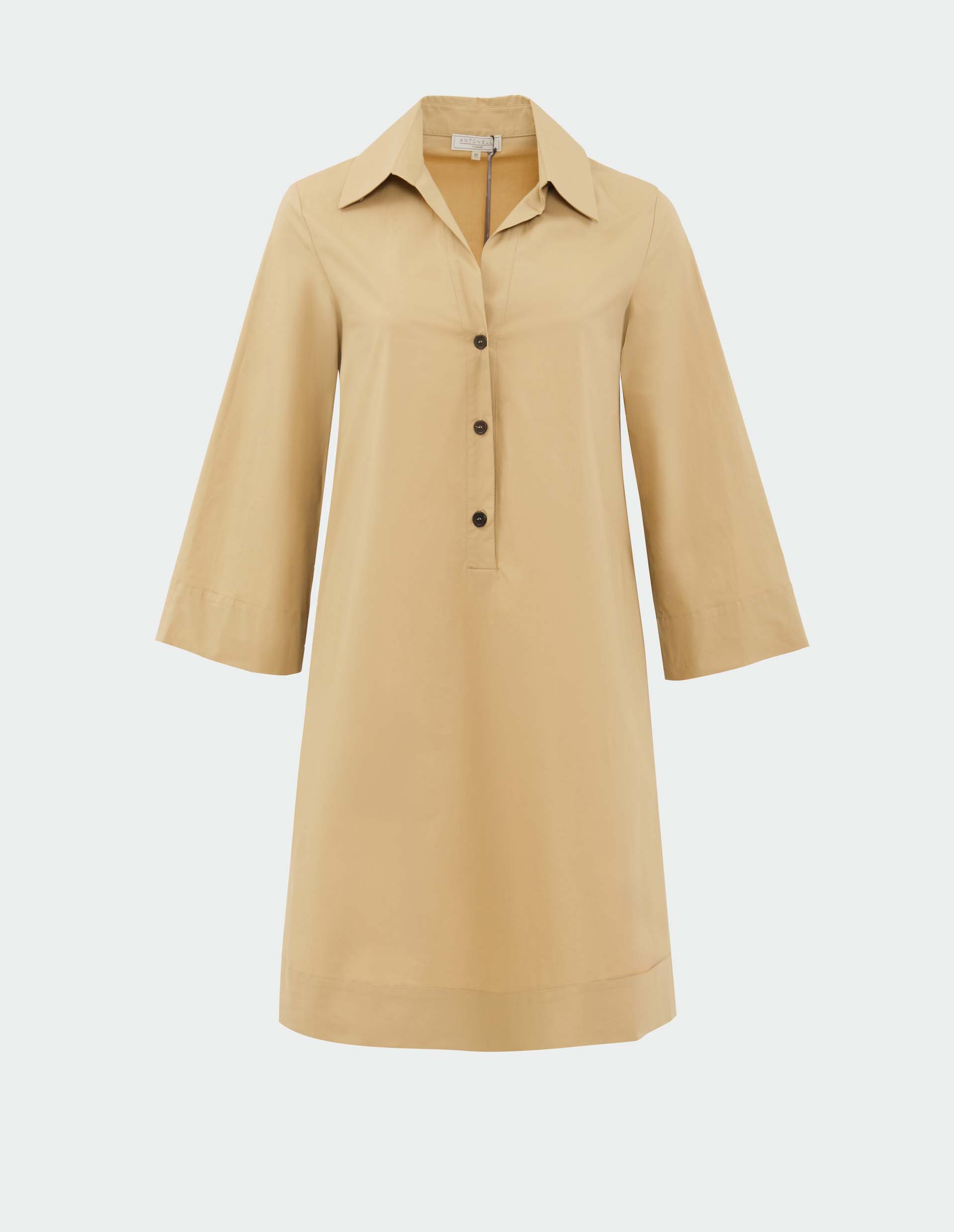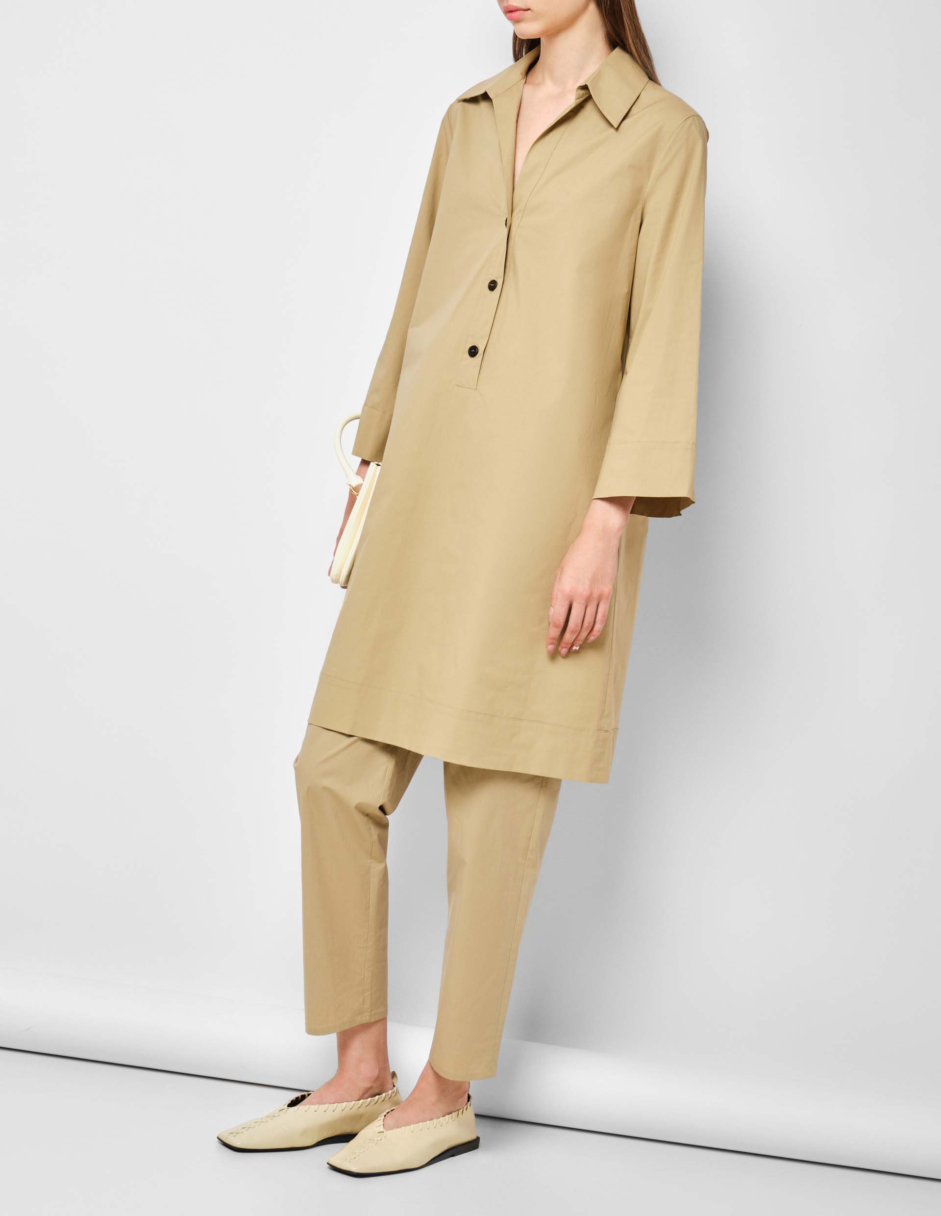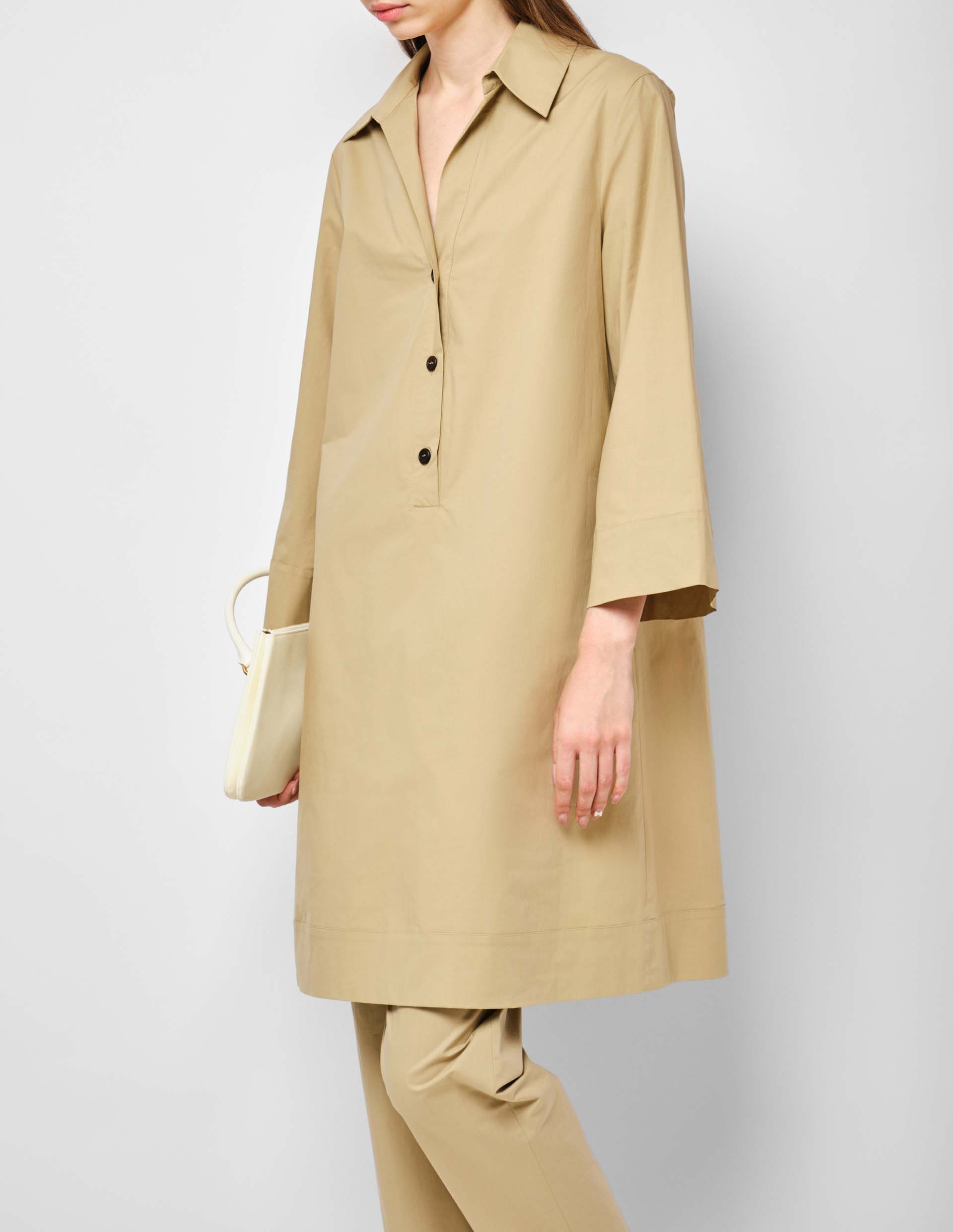 Antonelli Firenze представляет безупречное платье-рубашку, созданное из сочетания органического хлопка и эластана. В ней отражается новое определение современной элегантности и традиционно высокое качество итальянского мастерства. Модель демонстрирует роскошную мягкость, гипоаллергенность натуральных волокон и практичность, подаренную свободным силуэтом. Платье дополнено длинными рукавами с широкими манжетами и роговыми пуговицами на груди, играющими роль функциональной эстетики. Это повседневно-шикарная вещь в природном оттенке Warm Sand, которая поднимет ваш гардероб на новый уровень.
