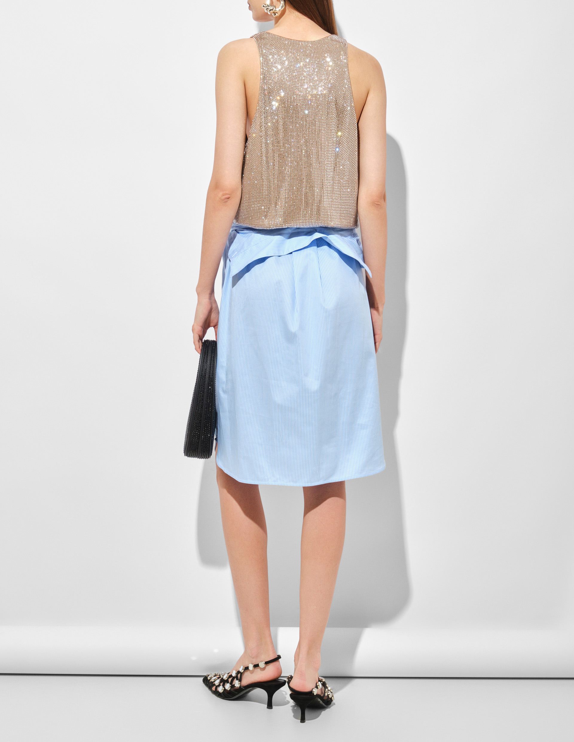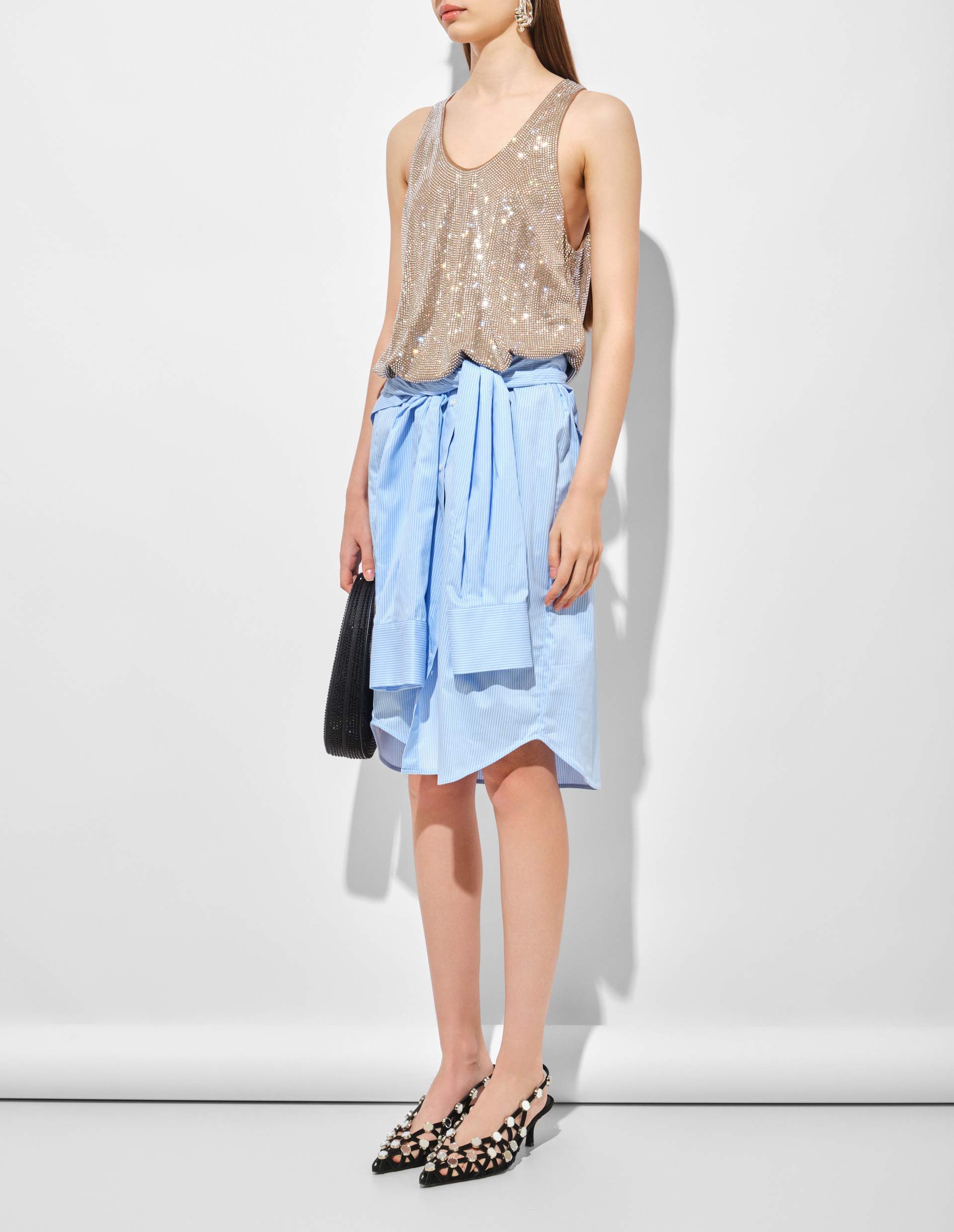 Комбинированное платье Giuseppe Di Morabito — искусное соединение двух миров в одном силуэте. Его верхняя часть - бежевый топ - украшена мерцающими кристаллами, ставшими отличительной чертой бренда, добавляющими драматизм и шик. Низ модели представлен полосатой рубашкой в бело-голубых тонах. Она становится отсылкой дизайнера к его любимым драпировкам и сложным деталям, но переосмысленным через современную призму и чувственность, чтобы создать уникальное изделие-загадку, притягивающее взгляды.