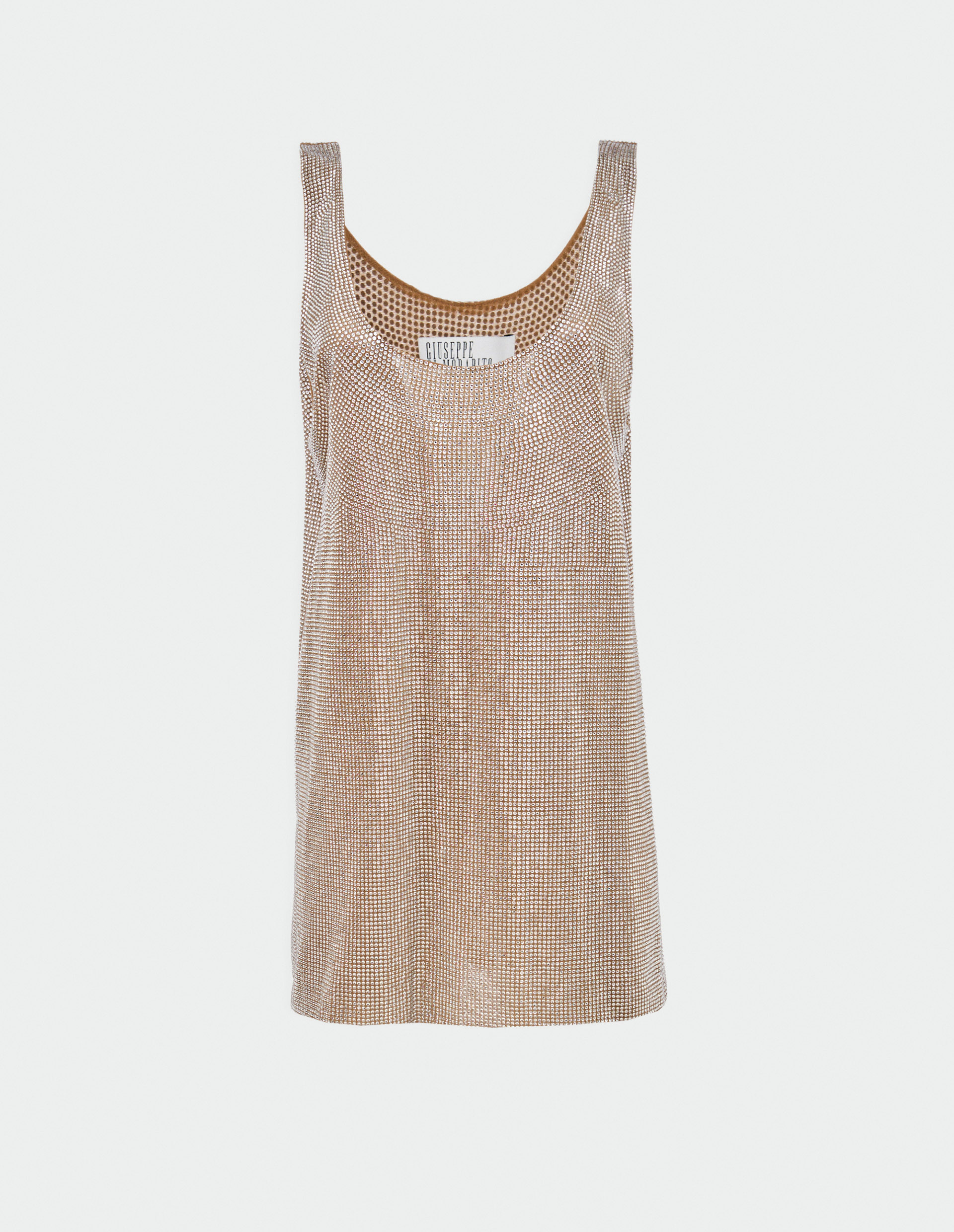 Невероятный баланс между экстремальной женственностью и сдержанной сексуальностью воплощает собой изящное платье от модного дома Giuseppe di Morabito полностью задекорированное горным хрусталем. Модель с U-образным вырезом и широкими бретелями, открывающие часть спины, сшили из легкой сетки из прочного полиамида и тянущегося эластана, расшитой сверкающими кристаллами, для самых блестящих выходов.