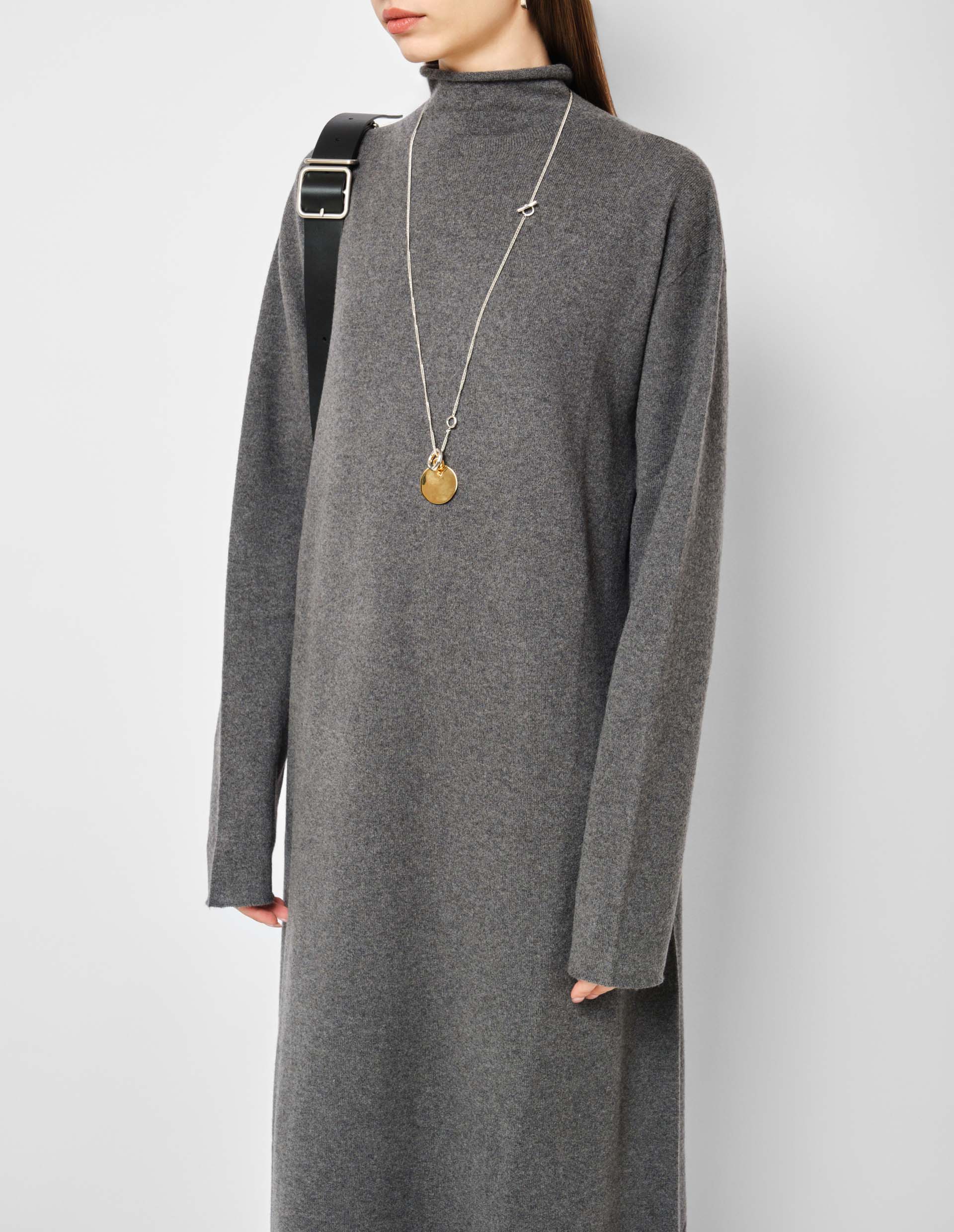 Серое кашемировое платье Jil Sander — это исследование новых форм и возможностей через сочетания лучших материалов и актуальных силуэтов. Объединив мягкий и нежный кашемир со свободным дизайном платья-свитера, дизайнеры создали изысканное изделие, которое чувственно струится по телу, бережно соприкасаясь с кожей, оставляя прострастраноство для легкости и расслабленности. Высокий воротник, длинные рукава, прямой силуэт, женственная длина макси и меланжевый эффект серого трикотажа — все говорит об исключительном стиле и роскоши.