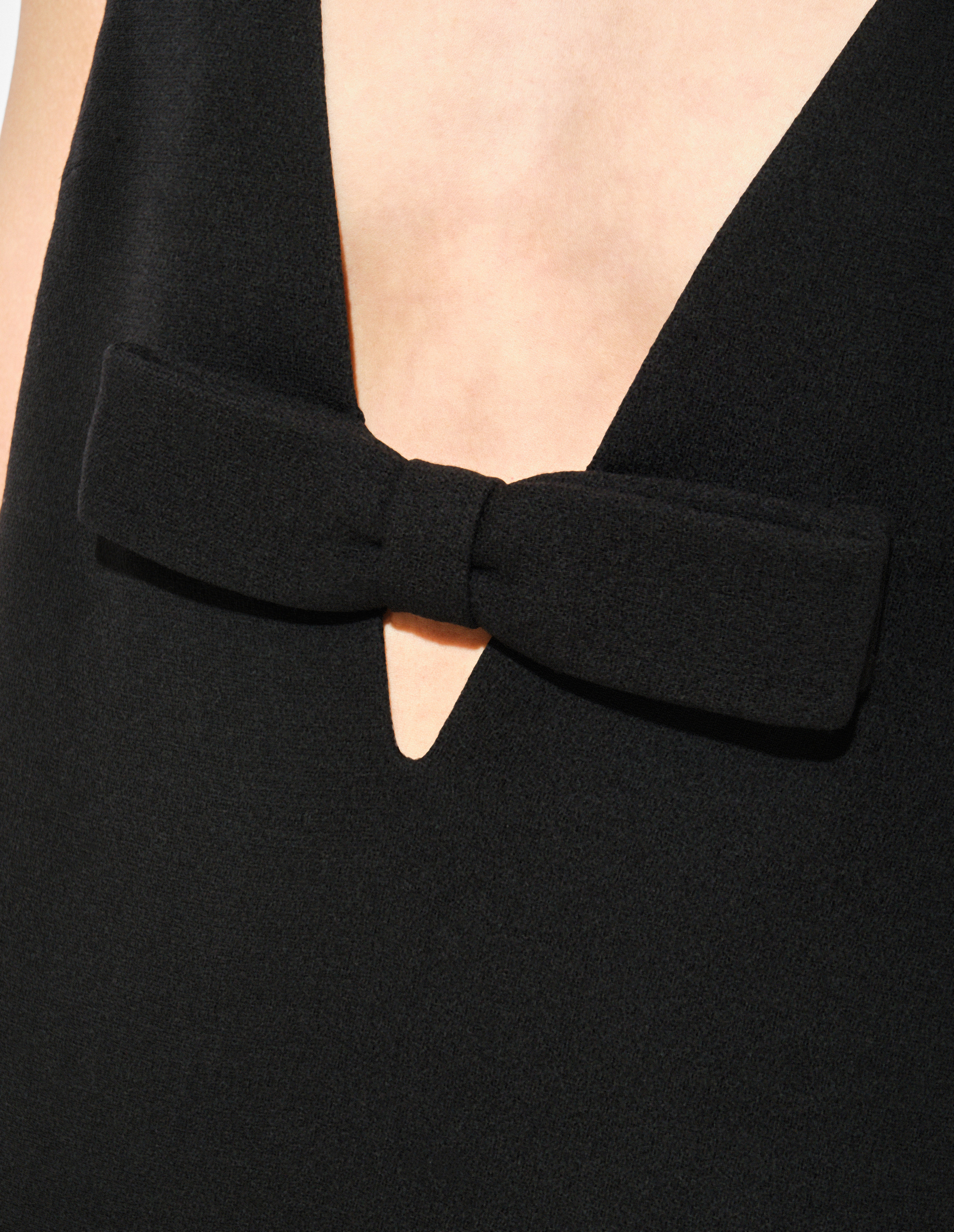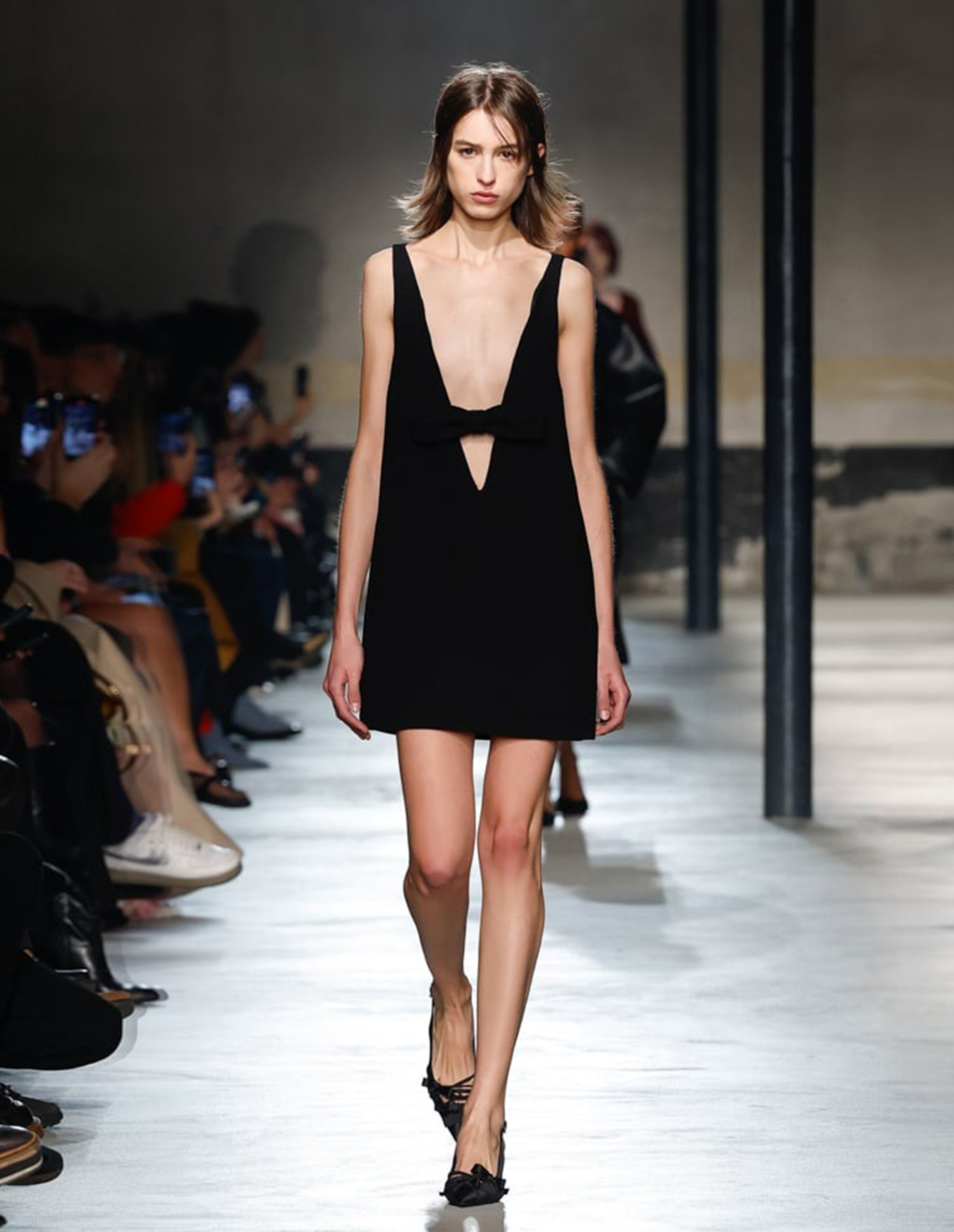 Платье от итальянского бренда №21 стало символом новой концепции хорошего тона, буржуазного шика, хранящего формы, портновские приемы и эффекты высокой моды 1980-х. Оно создано из тонкой эластичной шерсти с мастерством и особым подходом к крою, говорящими о высоком качестве Made in Italy. Силуэт с глубоким V-образным вырезом, украшенным бантом, говорит об изысканной женственности, воспетой Alessandro Dell'Acqua.