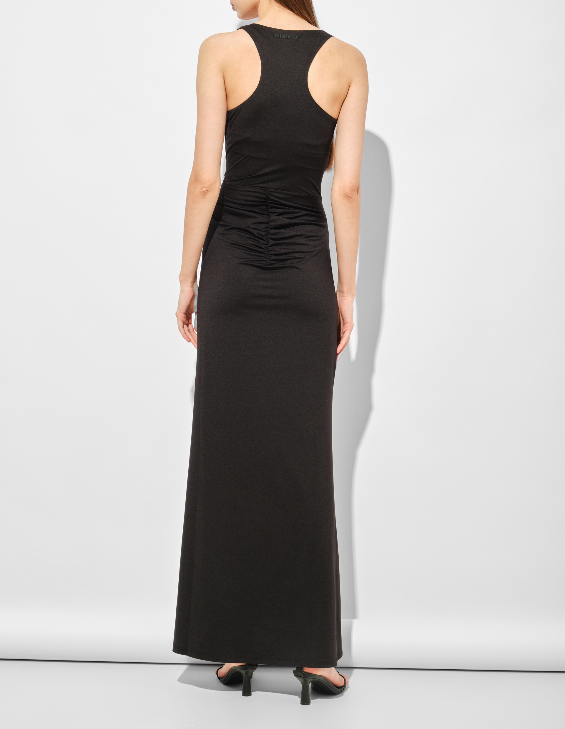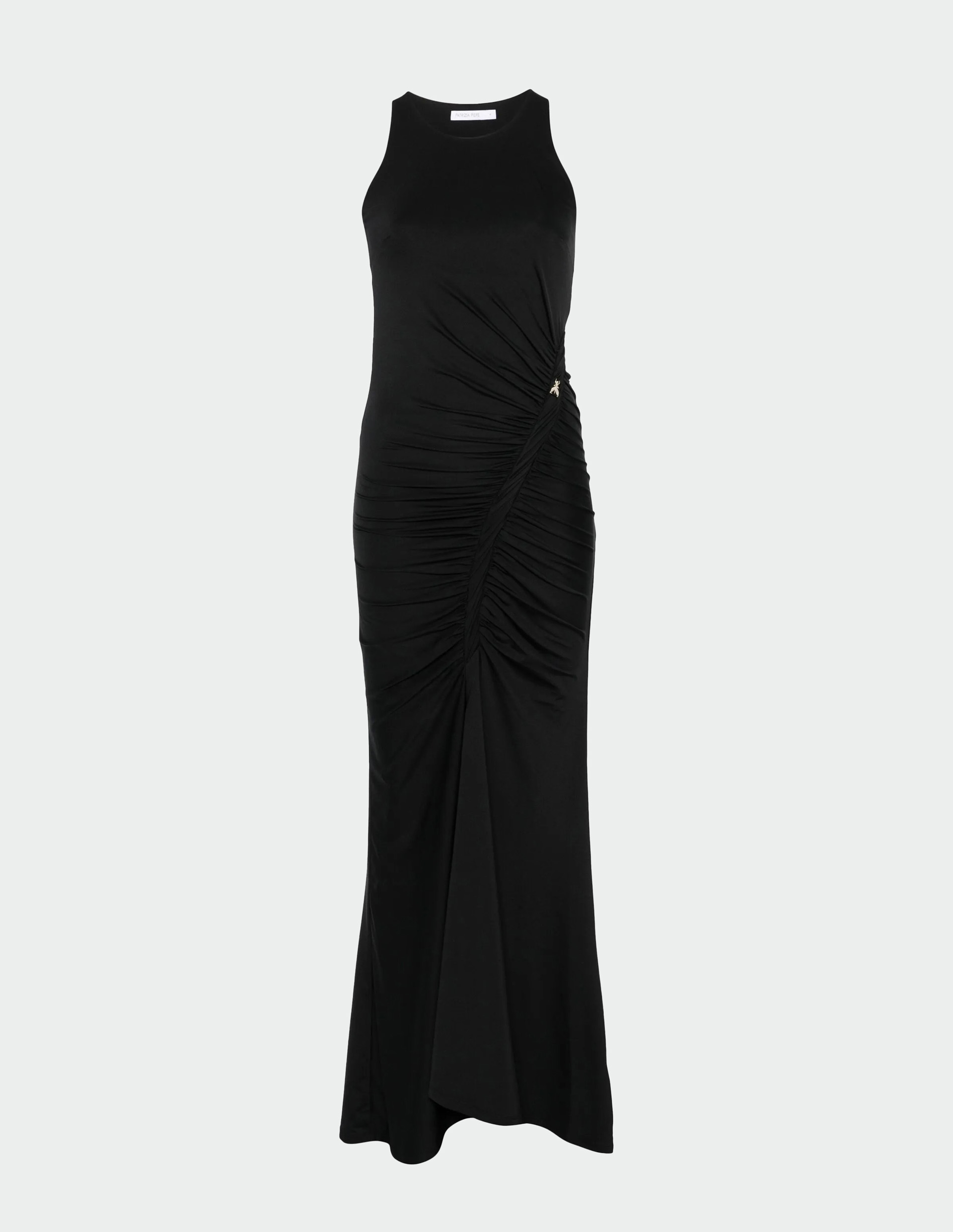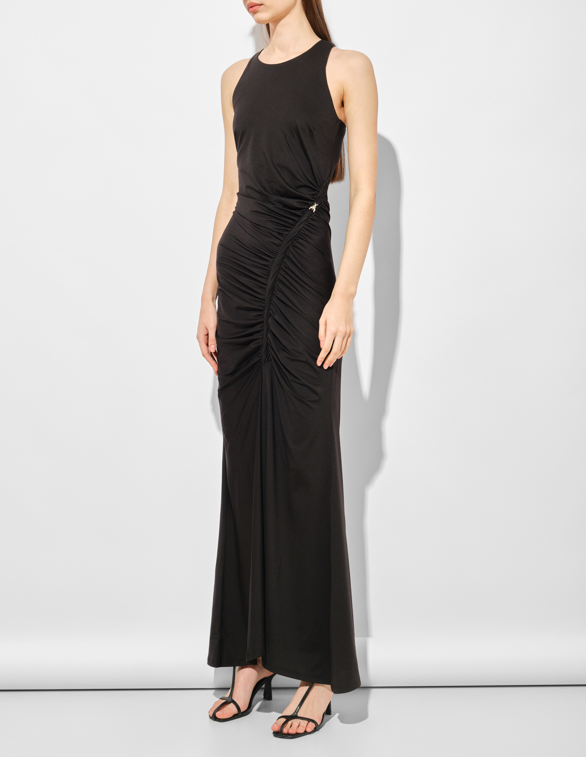 Платье от Patrizia Pepe — это гармония чётких линий и чувственной драпировки, где глубокий чёрный оттенок обретает новую силу, а асимметричные складки придают силуэту динамику. Модель из эластичного креп-джерси плотно облегает фигуру, создавая эффект второй кожи, при этом мягкие волны ткани смягчают строгость, добавляют лёгкость. Круглый вырез и отсутствие рукавов акцентируют внимание на женственности, а длина в пол усиливает элегантность. Patrizia Pepe объединяет в этом платье чувственность и художественную свободу, где каждая черта — от обтягивающего кроя до изысканной мушки Fly — говорит о мастерстве и внимании к форме.