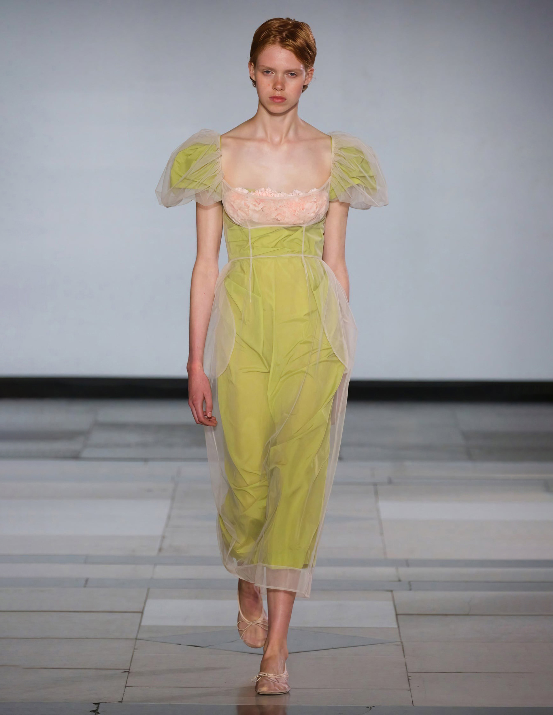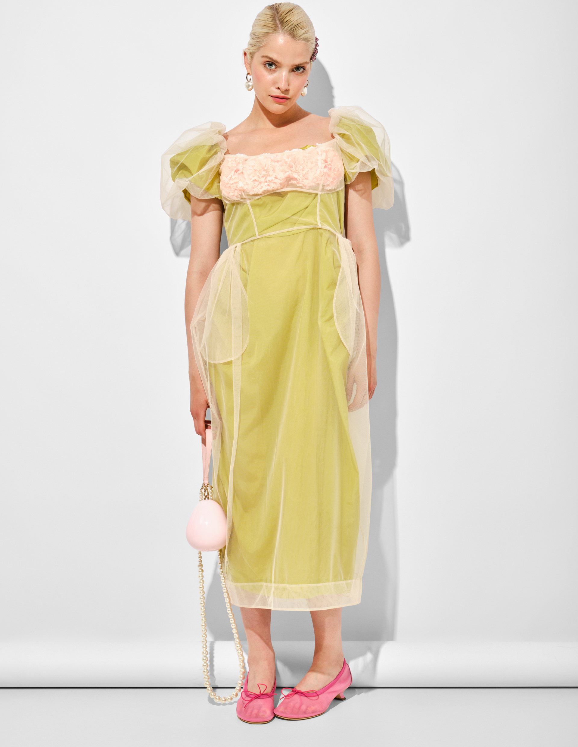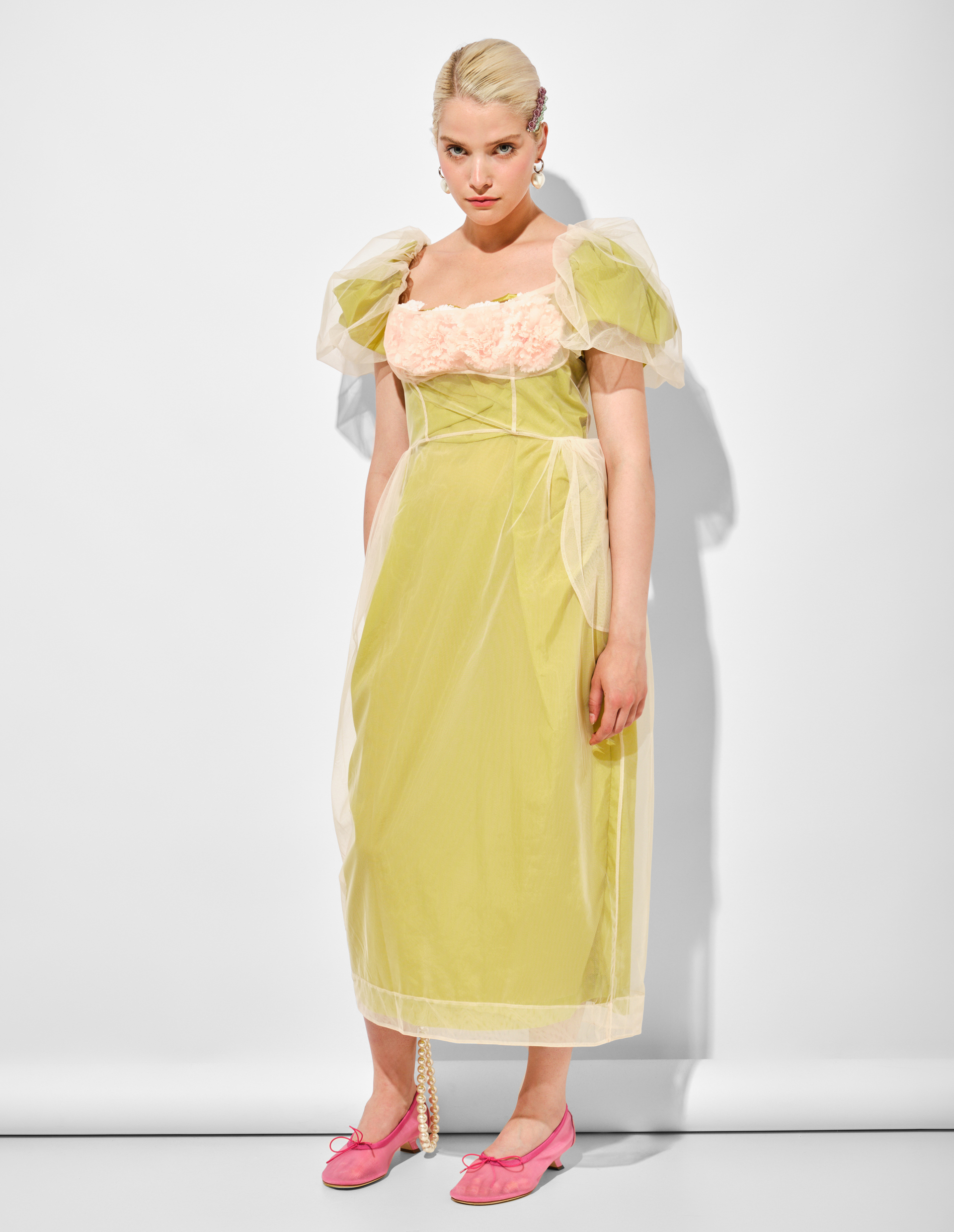 Платье Simone Rocha, воплощающее изысканную романтику, где каждая деталь рассказывает историю вдохновения. Словно сошедшее со сцены легендарного спектакля «Nelken» Пины Бауш, оно несет в себе ту самую «хрупкую силу», что так характерна для хореографии великой танцовщицы.