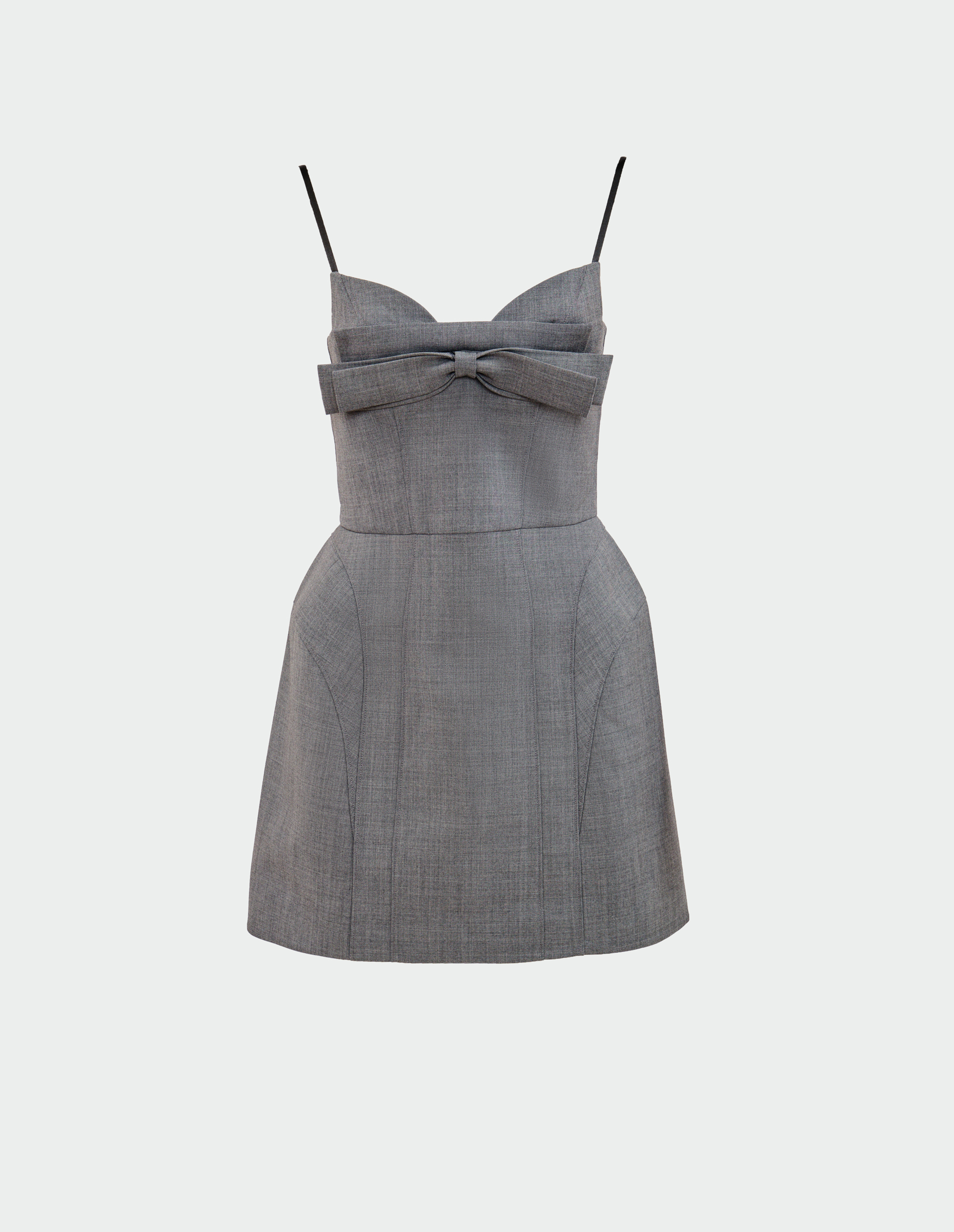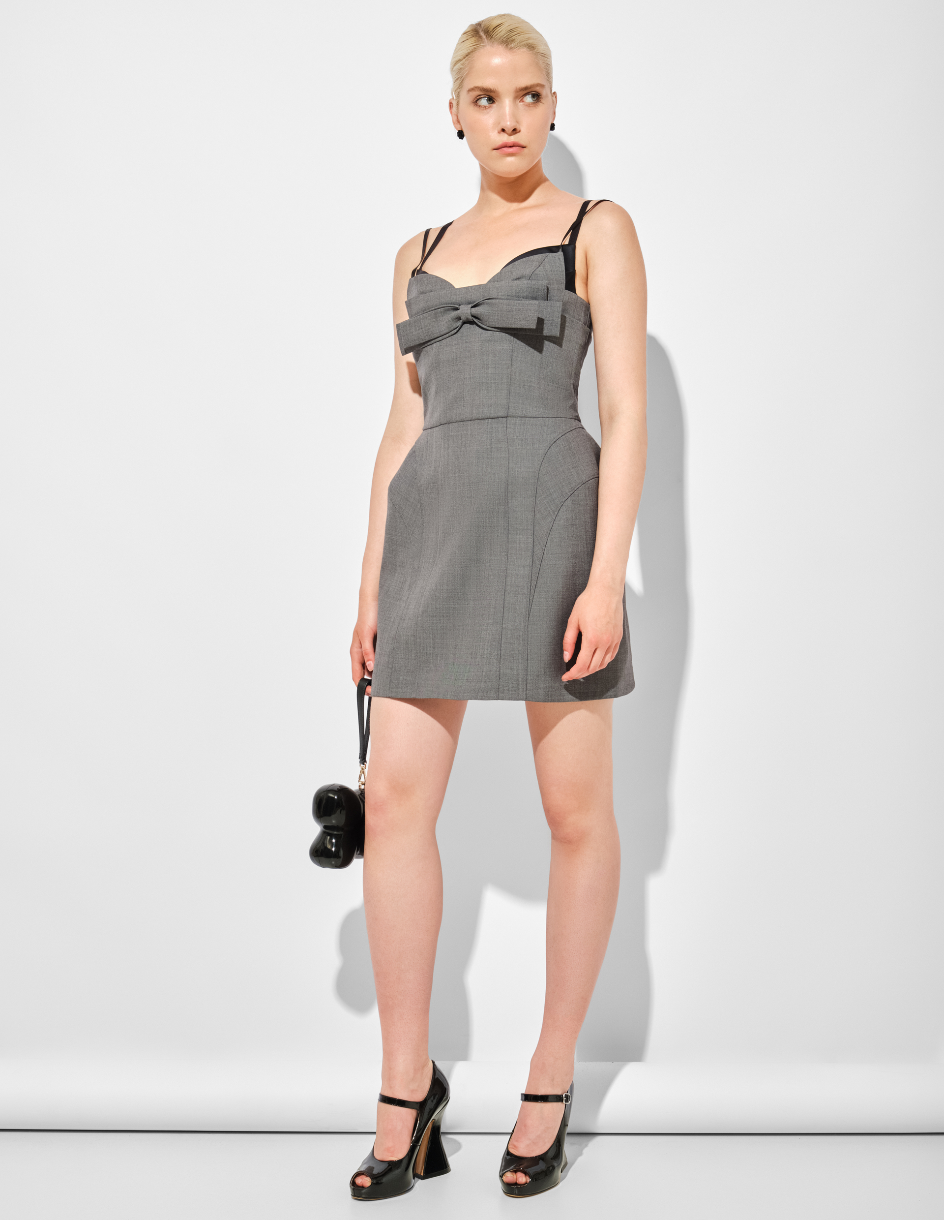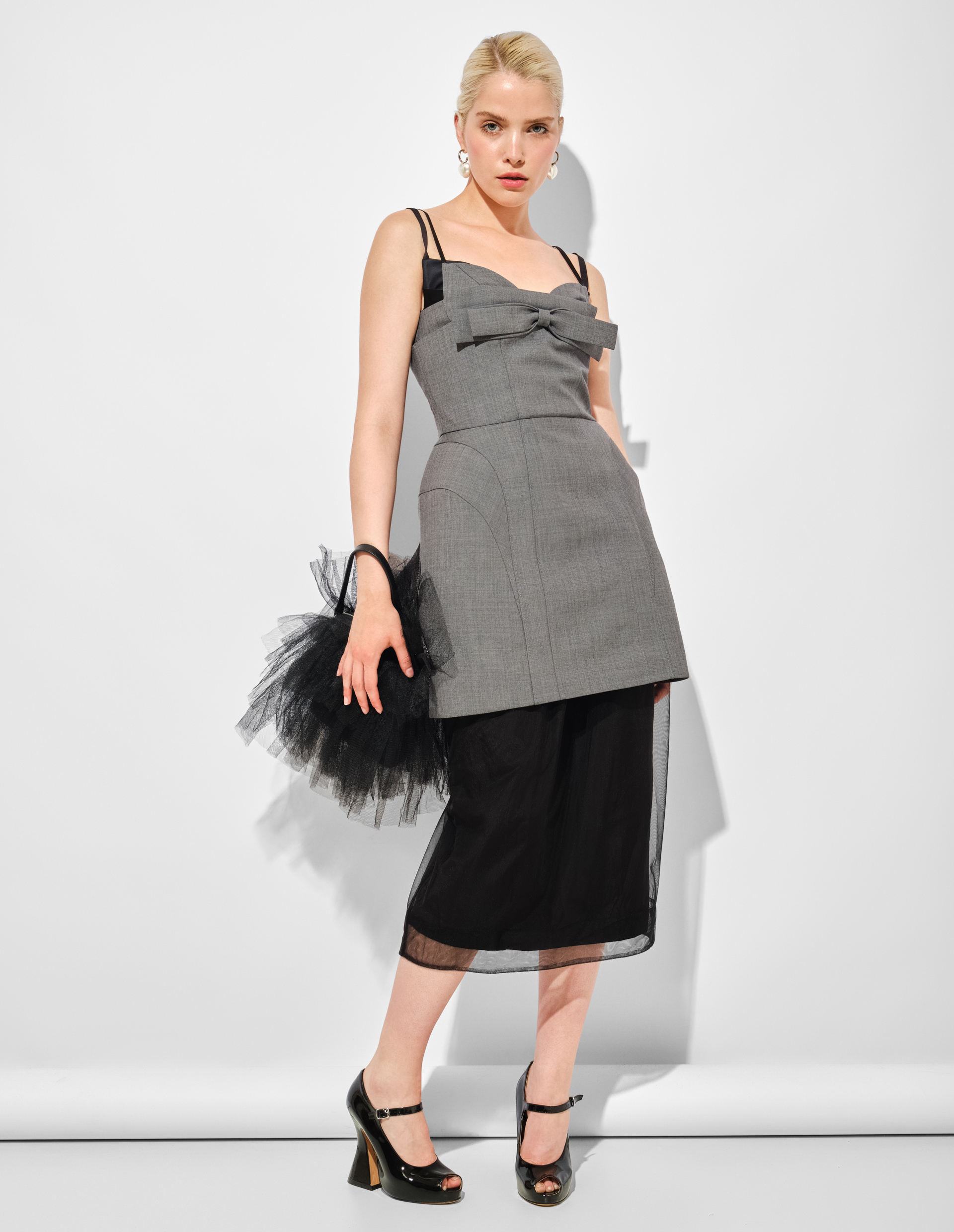 Это платье SHUSHU/TONG демонстрирует умение бренда сочетать точность с индивидуальностью, структуру с лёгкостью, очаровывая тех, кто воспринимает моду не просто как одежду, а как язык самовыражения. Модель с четкими строчками панельной конструкции отличается двойным лифом с тонкими бретелями. Его центральным акцентом выступает культовый элемент всех коллекций SHUSHU/TONG — бант, воплощающий фирменную эстетику для современной женщины с "девичьим сердцем".
