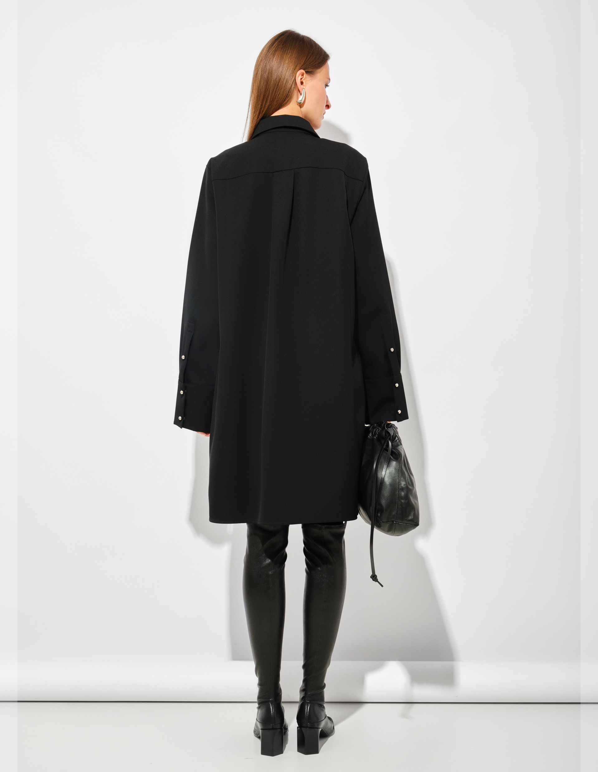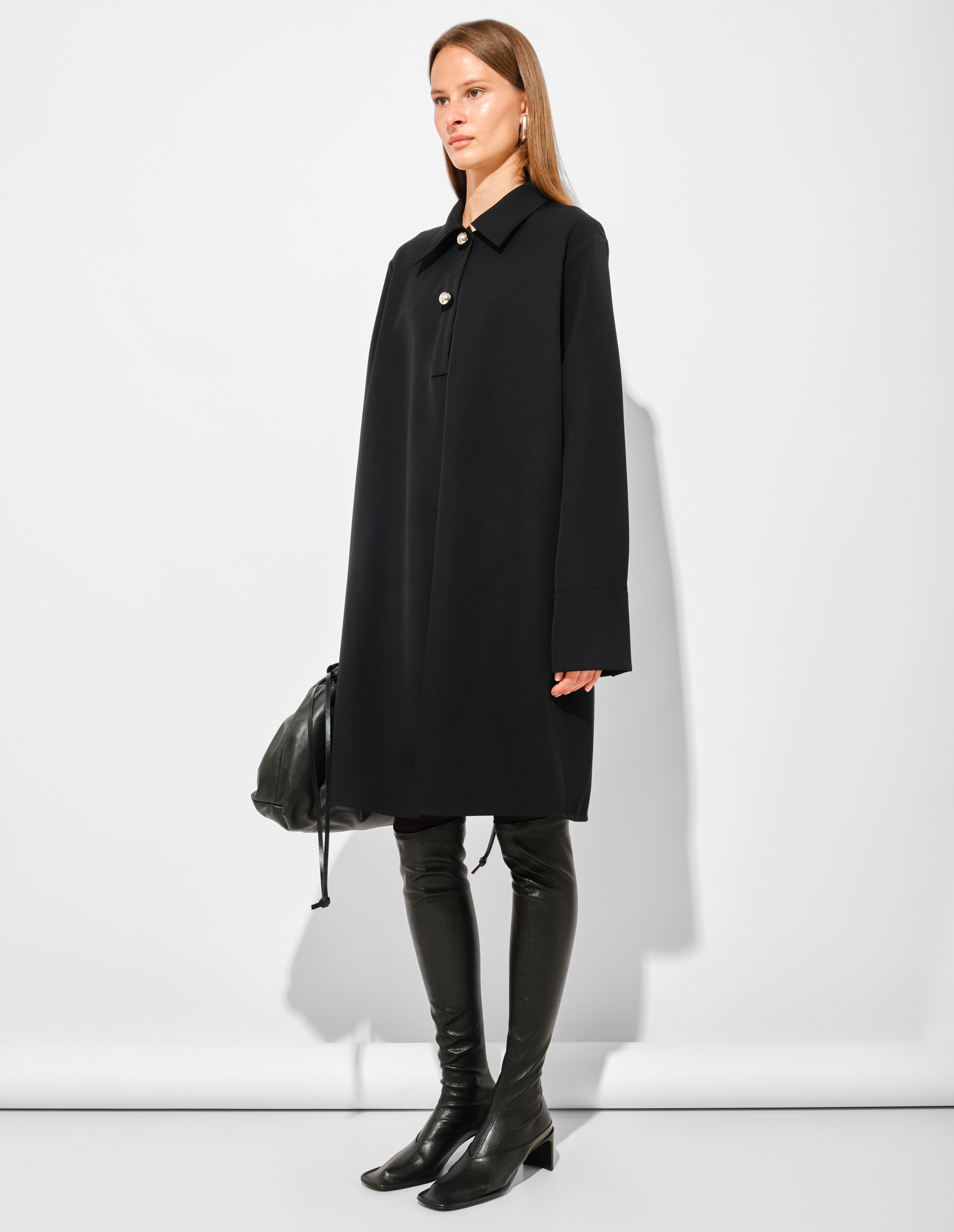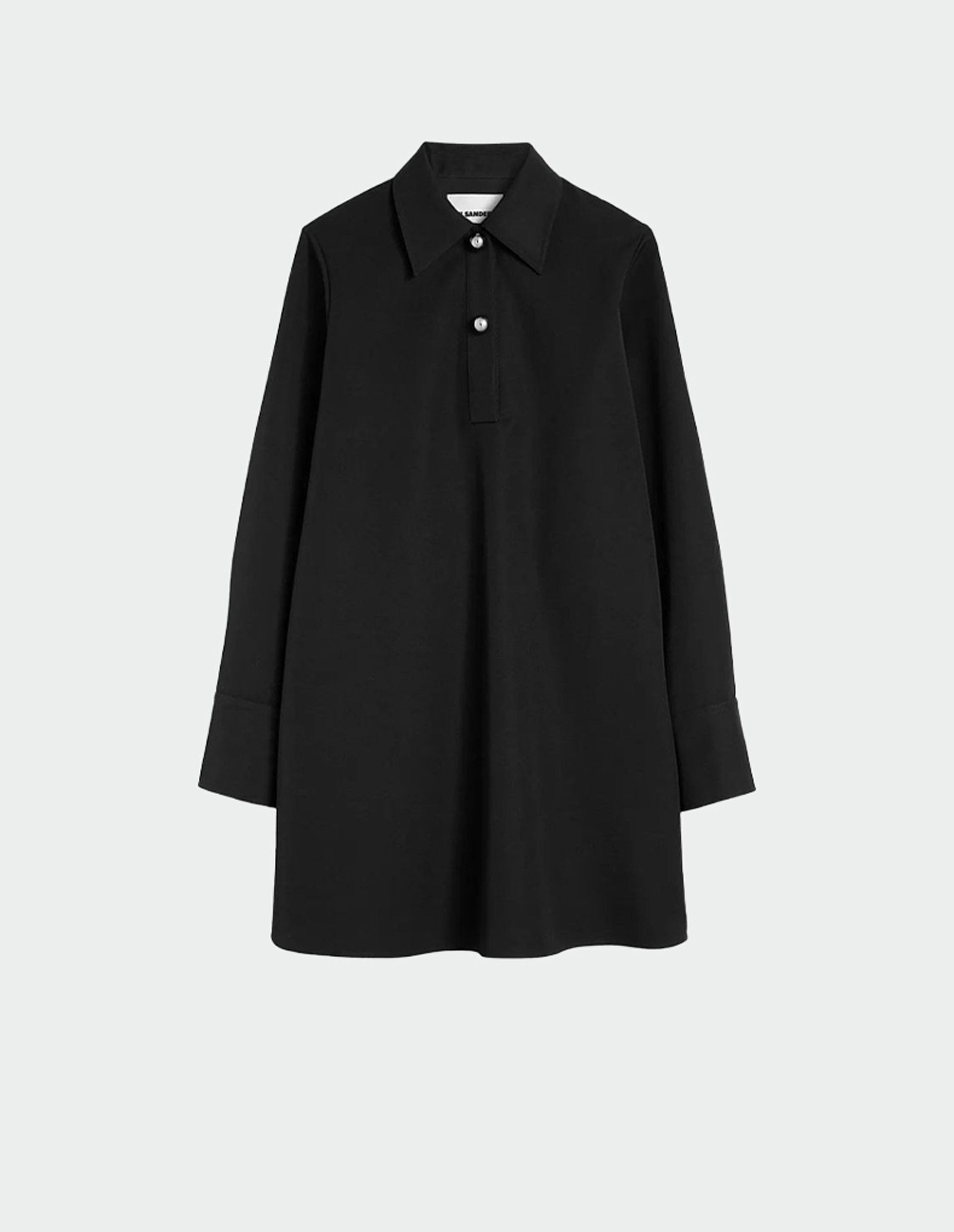 Платье из габардина на основе итальянской шерсти глубокого черного цвета воплощает интеллектуальную элегантность коллекции FW25. Свободный крой и заниженные плечи создают непринужденный, но безупречно сконструированный силуэт, отражающий современную интерпретацию пуризма Jil Sander. Драматизм достигается через контраст: лаконичная форма платья оживает благодаря деталям — заостренному воротнику-поло и jewel-пуговицам ручной работы. Их металлический блеск на планке, а также сияние кнопок на рукавах создаёт эффект ослепительного света в самом сердце тьмы. Безупречное качество ткани гарантирует идеальную форму и долговечность, подчеркивая ценность исполнения.