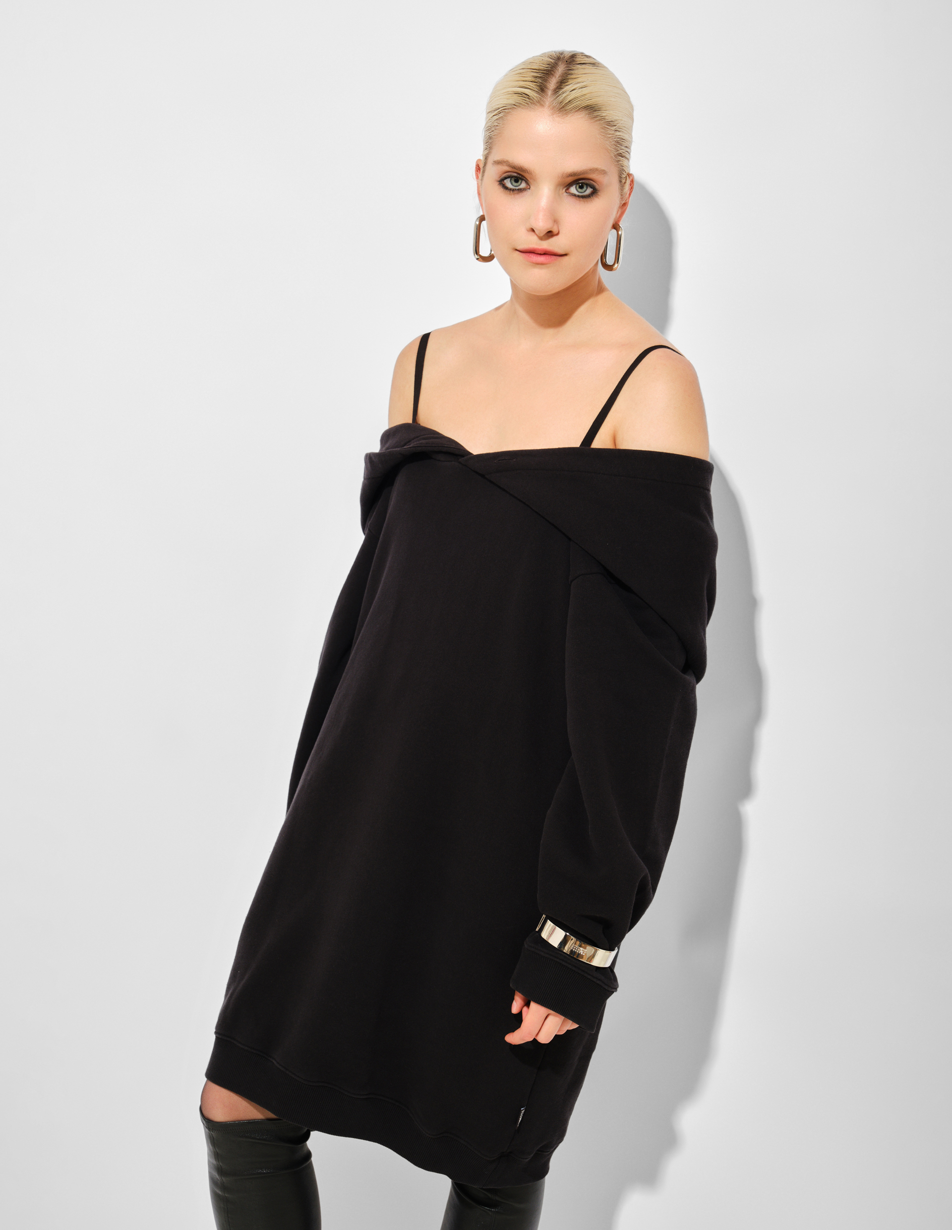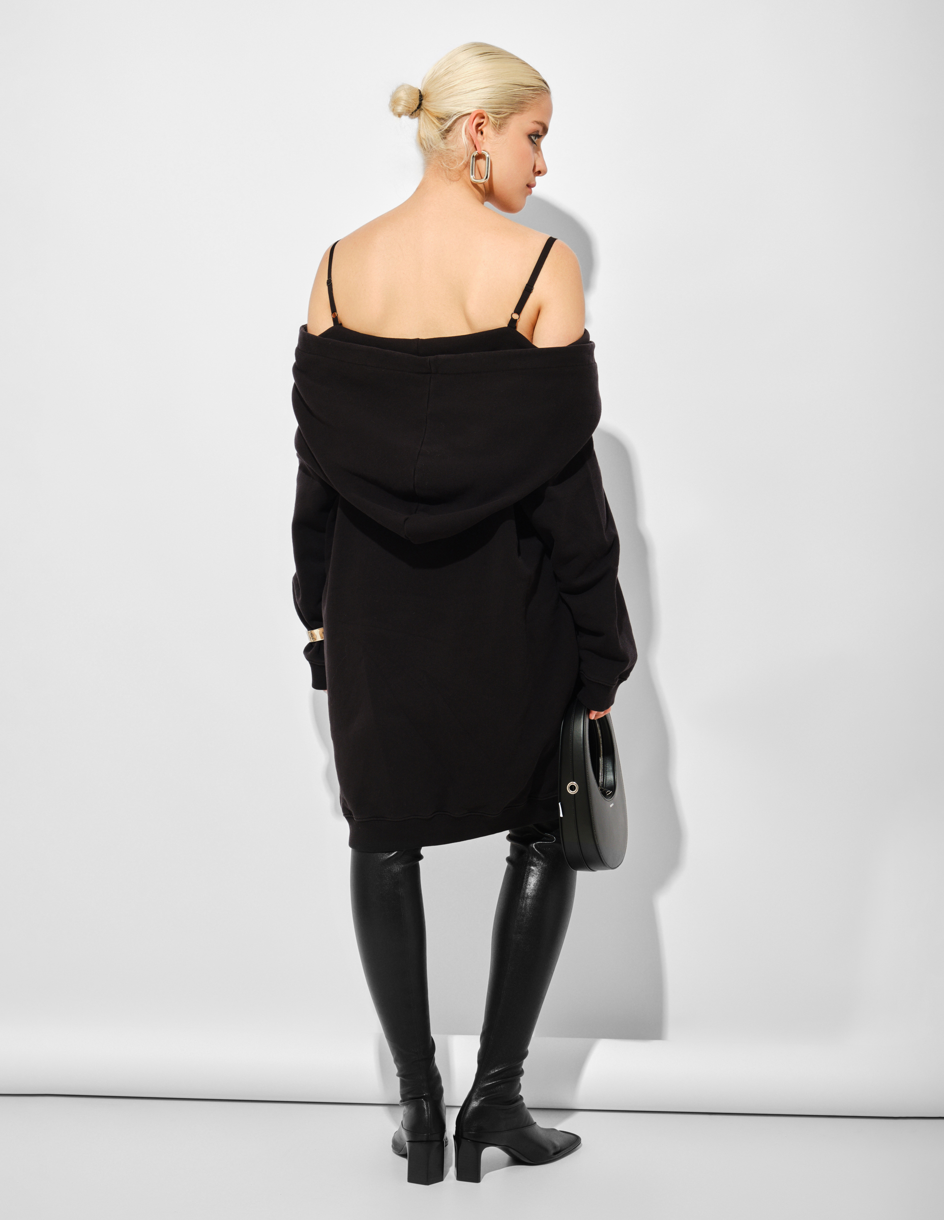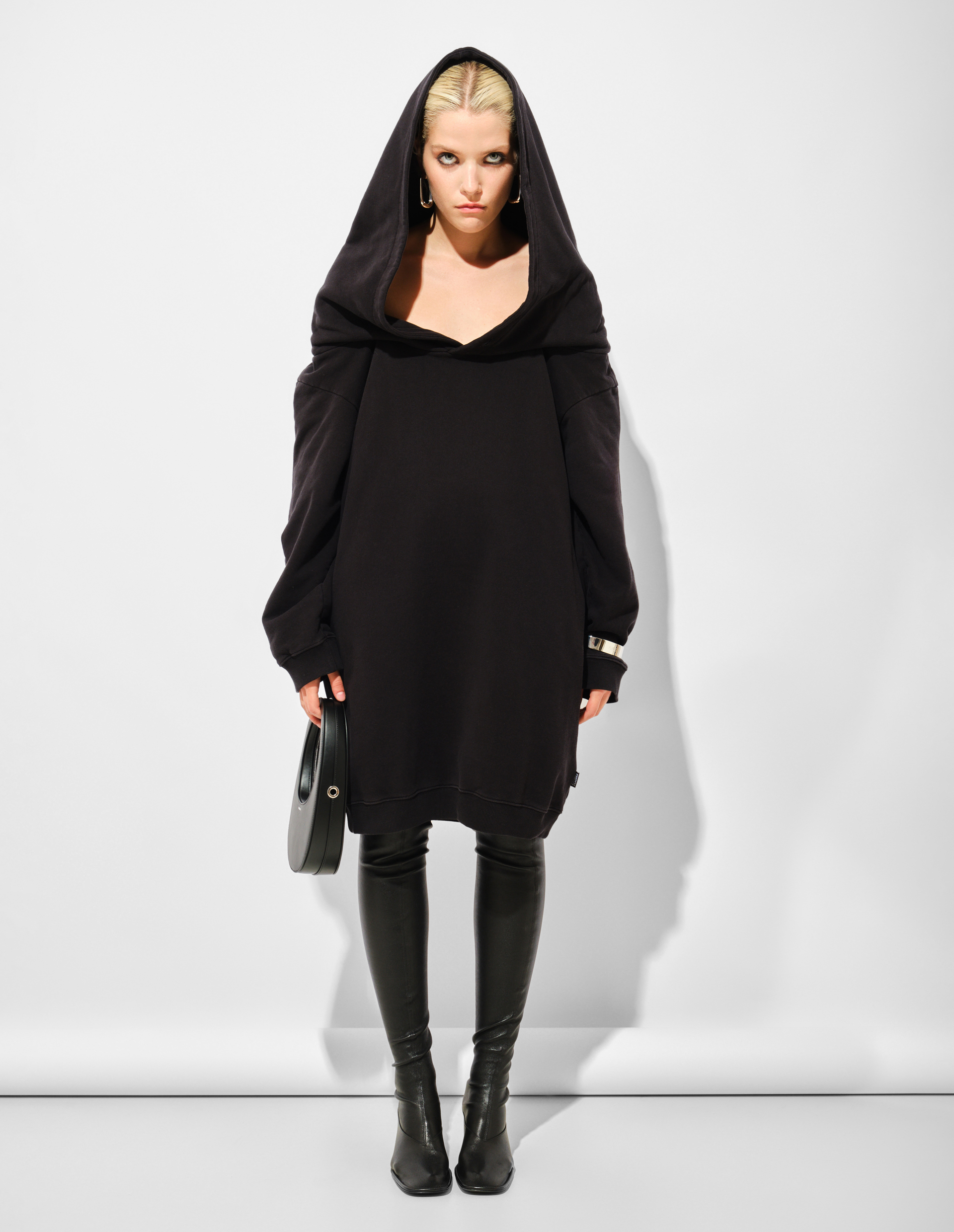 Платье-свитшот длины миди из плотного хлопка воплощает принцип трансформации коллекции FW25, где объемный капюшон заменяет традиционный вырез и открывает систему регулируемых бретелей. Свободный крой с ребристыми манжетами и асимметричным подолом создает динамичный силуэт, меняющийся в движении, а фирменная белая строчка на спине завершает деконструктивный жест, переосмысливая утилитарную форму худи через призму интеллектуального проектирования MM6.