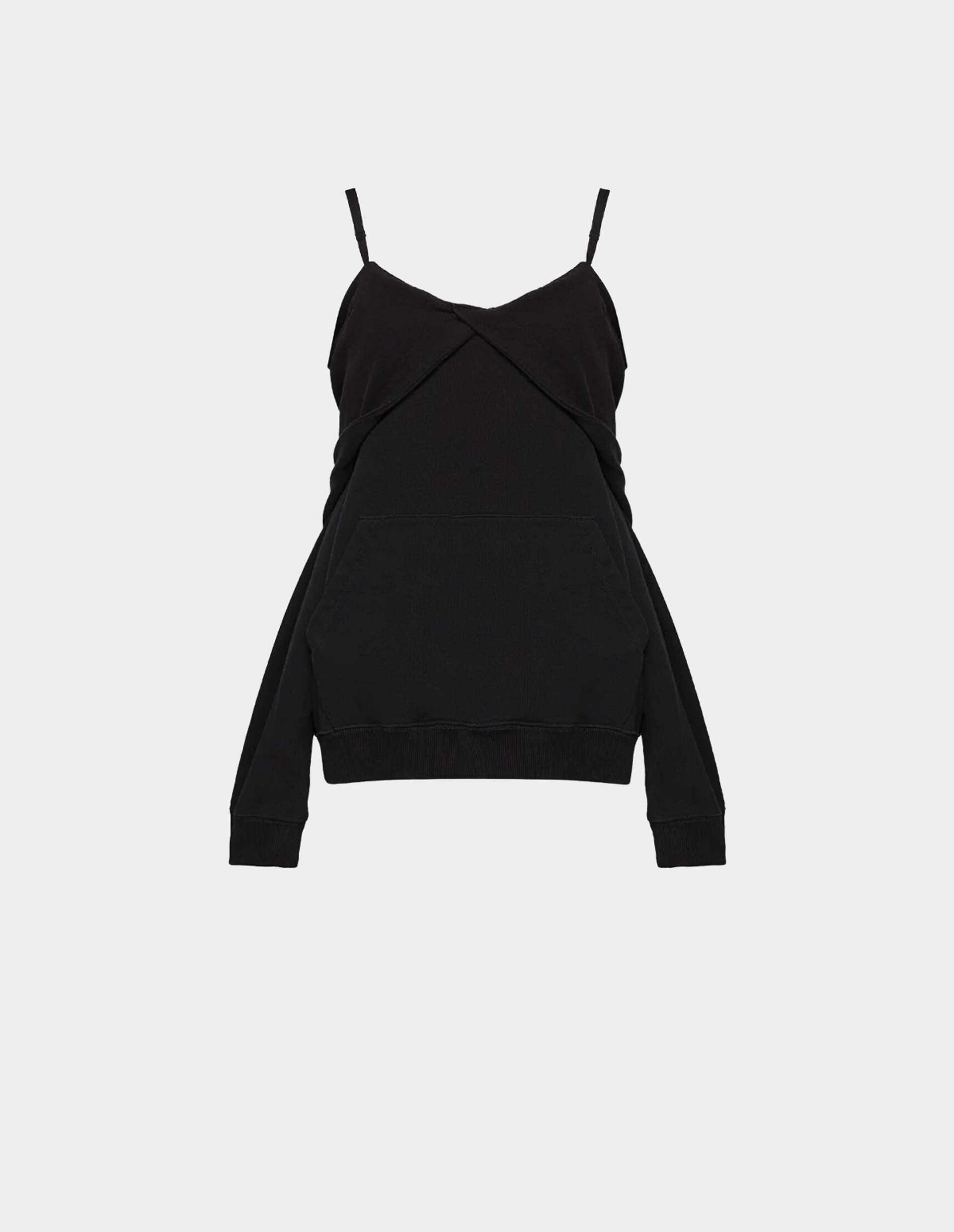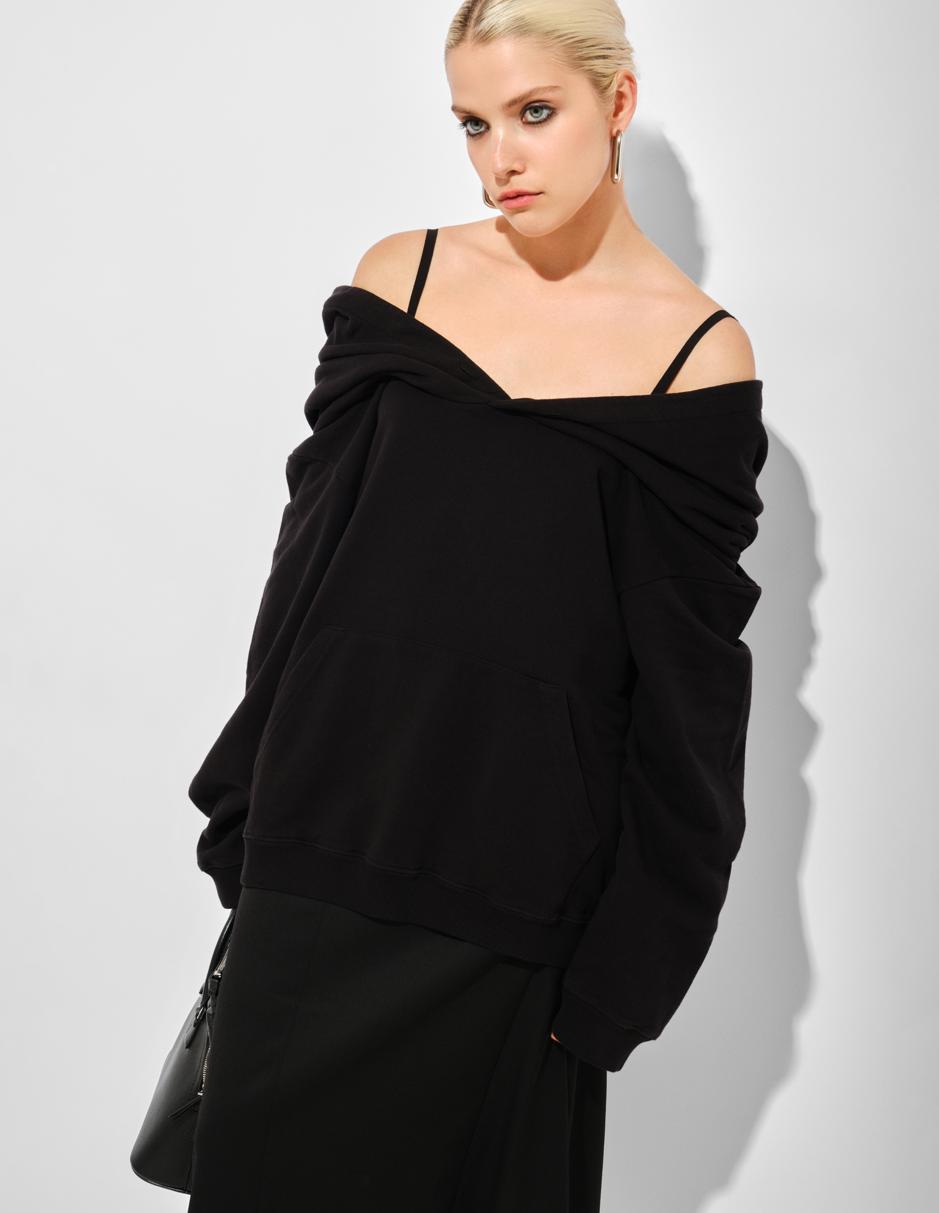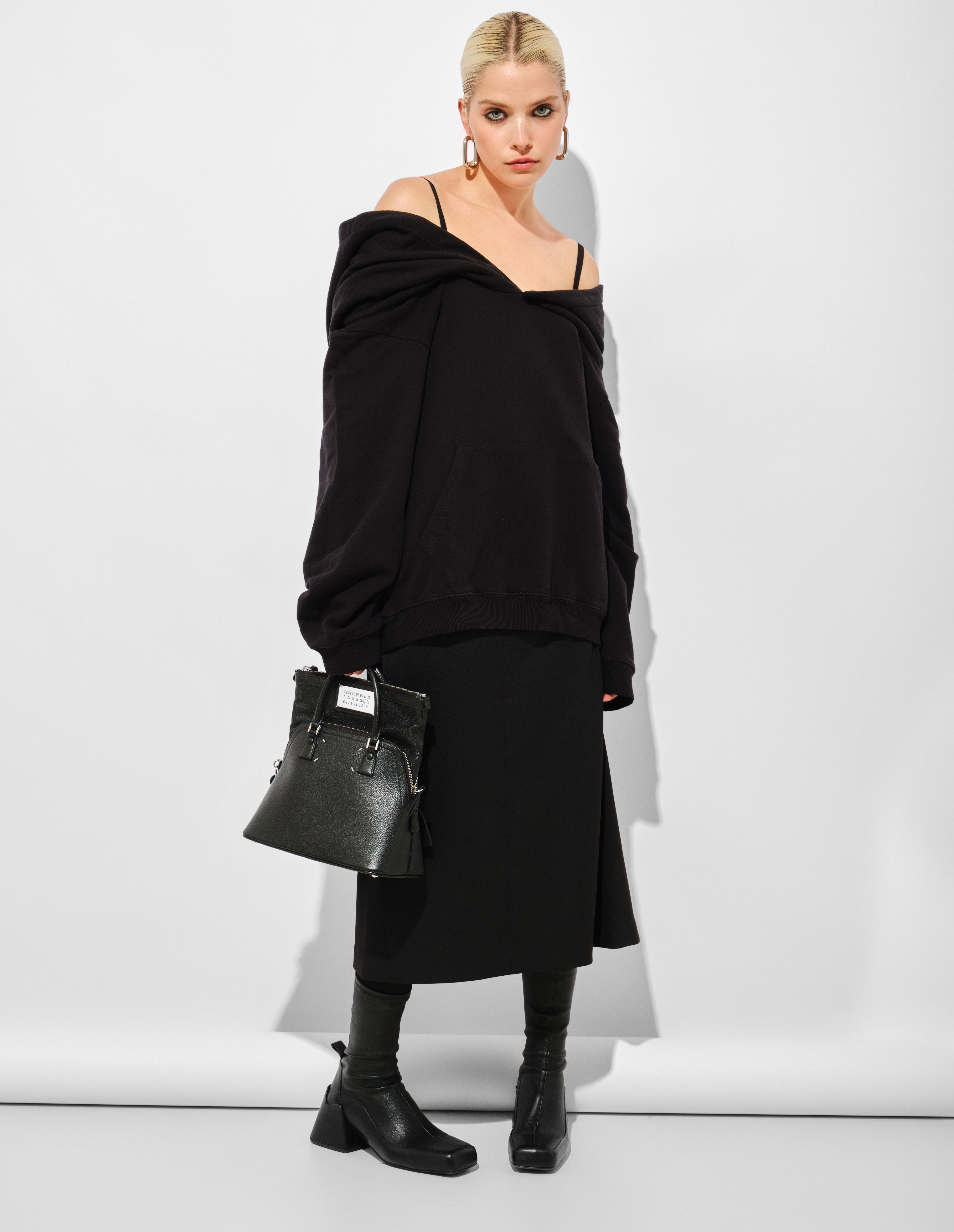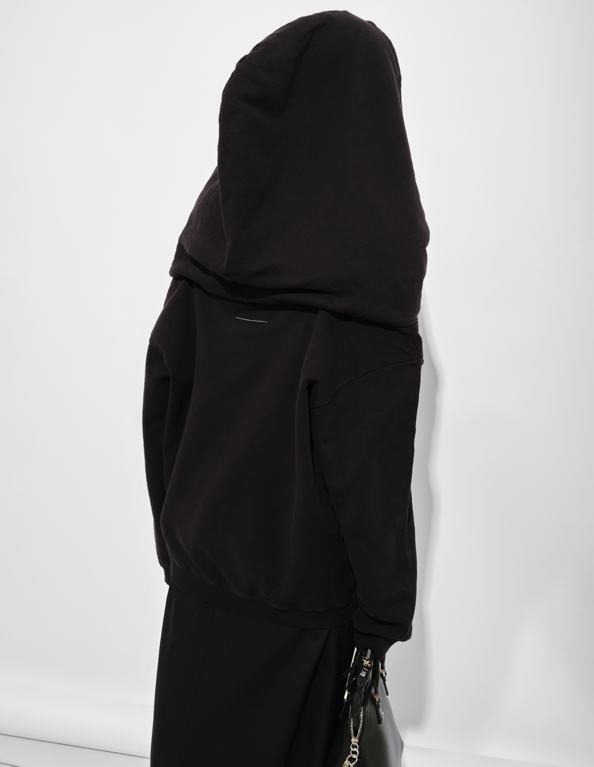 Толстовка из плотного хлопка с открытыми плечами и системой бретелей радикально пересматривает каноны утилитарной одежды. Объемный капюшон, преобразованный в драпирующийся вырез, создает изменчивый силуэт: его можно носить на плечах, либо накинуть на голову для драматичного акцента. Ребристые манжеты и низ контрастируют с пластичной формой верха, а карман-кенгуру и видимые швы отсылают к архивным кодам рабочей одежды. Фирменная белая строчка на спине завершает этот жест, фиксируя момент трансформации базового предмета в объект экспериментального проектирования MM6.