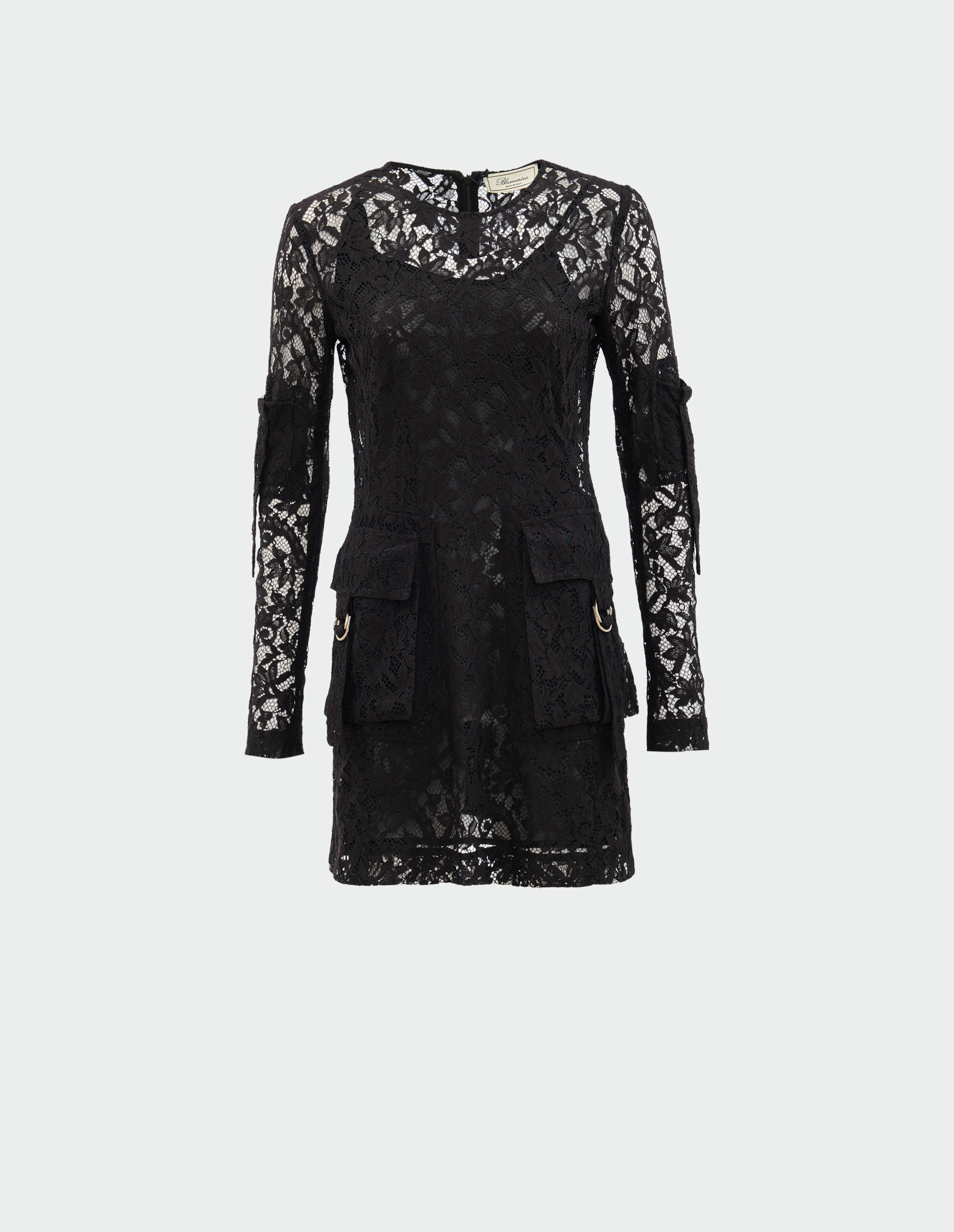 Черное кружевное мини-платье с накладными карманами