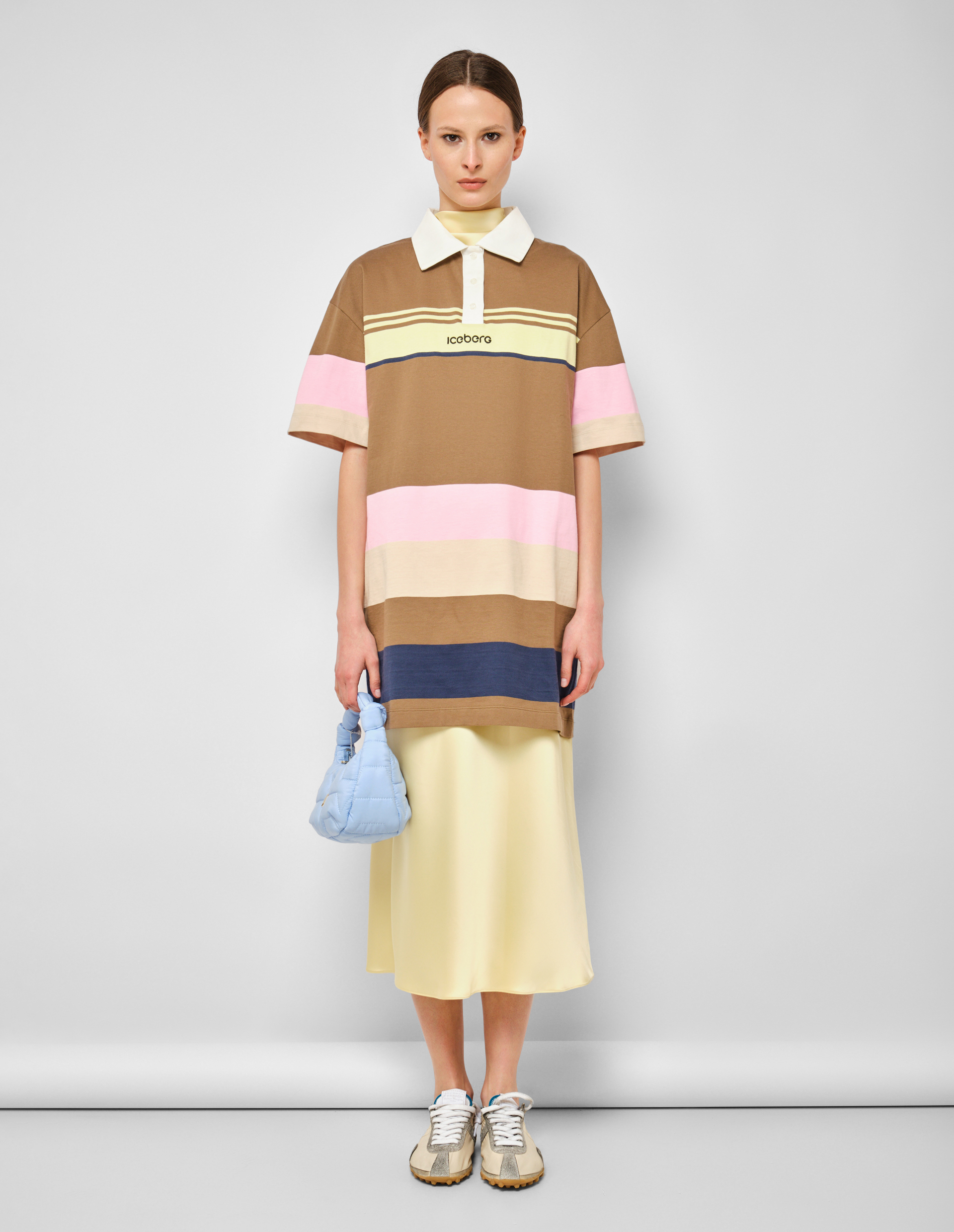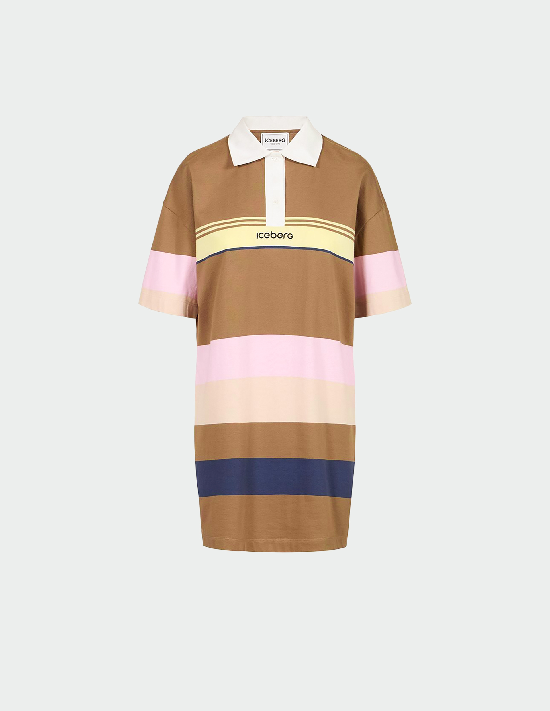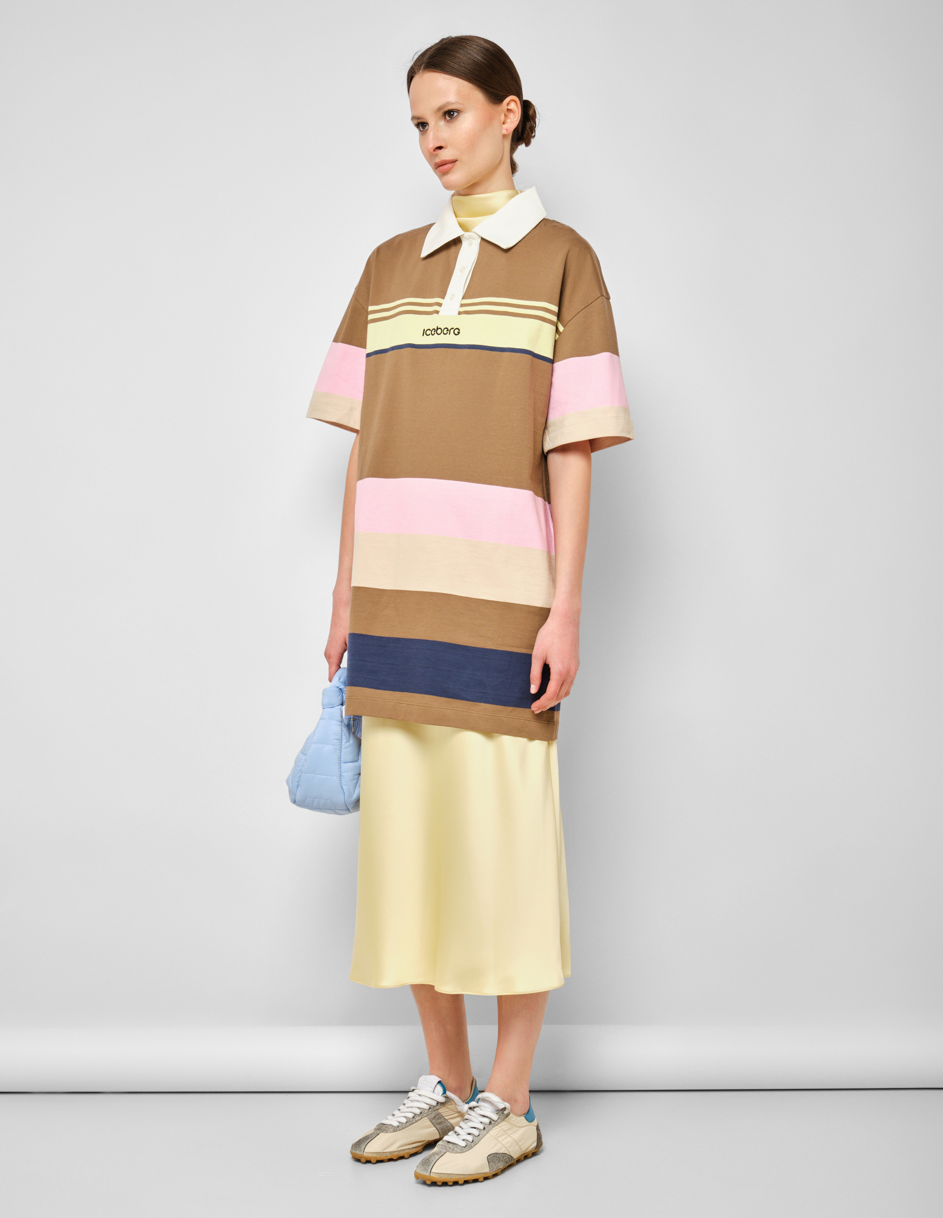 Радуга спортивной элегантности. Это платье-поло от ICEBERG превращает классическую форму в настоящий праздник цвета и хорошего настроения. Насыщенный зеленый фон, словно сочная летняя трава, служит идеальной основой для разноцветных полос — желтых, розовых, бежевых и синих. Они опоясывают платье горизонтальными линиями, создавая динамичный ритм и визуально структурируя силуэт. Белый классический воротник с контрастной кокеткой добавляет строгости и графической четкости, напоминая об истоках теннисной элегантности. Застежка на пуговицы спереди сохраняет аутентичность поло, но в женственном прочтении приобретает новое звучание. Модель выполнена из мягкого мультиколор-джерси — ткань приятна к телу, дышит и идеально драпируется, создавая легкий, летящий силуэт. Короткий рукав открывает руки, добавляя образу свежести. В центре внимания — черное вышитое лого Iceberg на груди. Оно контрастирует с пестрым фоном, приковывая взгляд и подчеркивая принадлежность миру итальянского стиля. Сегодня мода на спортивную элегантность переживает новый расцвет — это платье идеально вписывается в тренд на женственные версии классических форм. Носите его с белыми кроссовками и кожаной курткой для создания контраста нежности и брутальности или с босоножками и плетеной сумкой для образа в духе итальянской la dolce vita. Можно добавить тонкий ремень на талию, чтобы подчеркнуть линию и создать более четкий силуэт. Польза этой вещи — в ее самодостаточности: платье не требует сложного сопровождения, оно само по себе уже целый образ. Важный нюанс: разноцветные полосы созданы с использованием стойких красителей, которые не линяют и не тускнеют даже после множества стирок. Белый воротник сохраняет форму и не желтеет со временем благодаря высокому качеству материала. Вышивка лого выполнена плотными стежками, которые не распускаются и не теряют четкости.