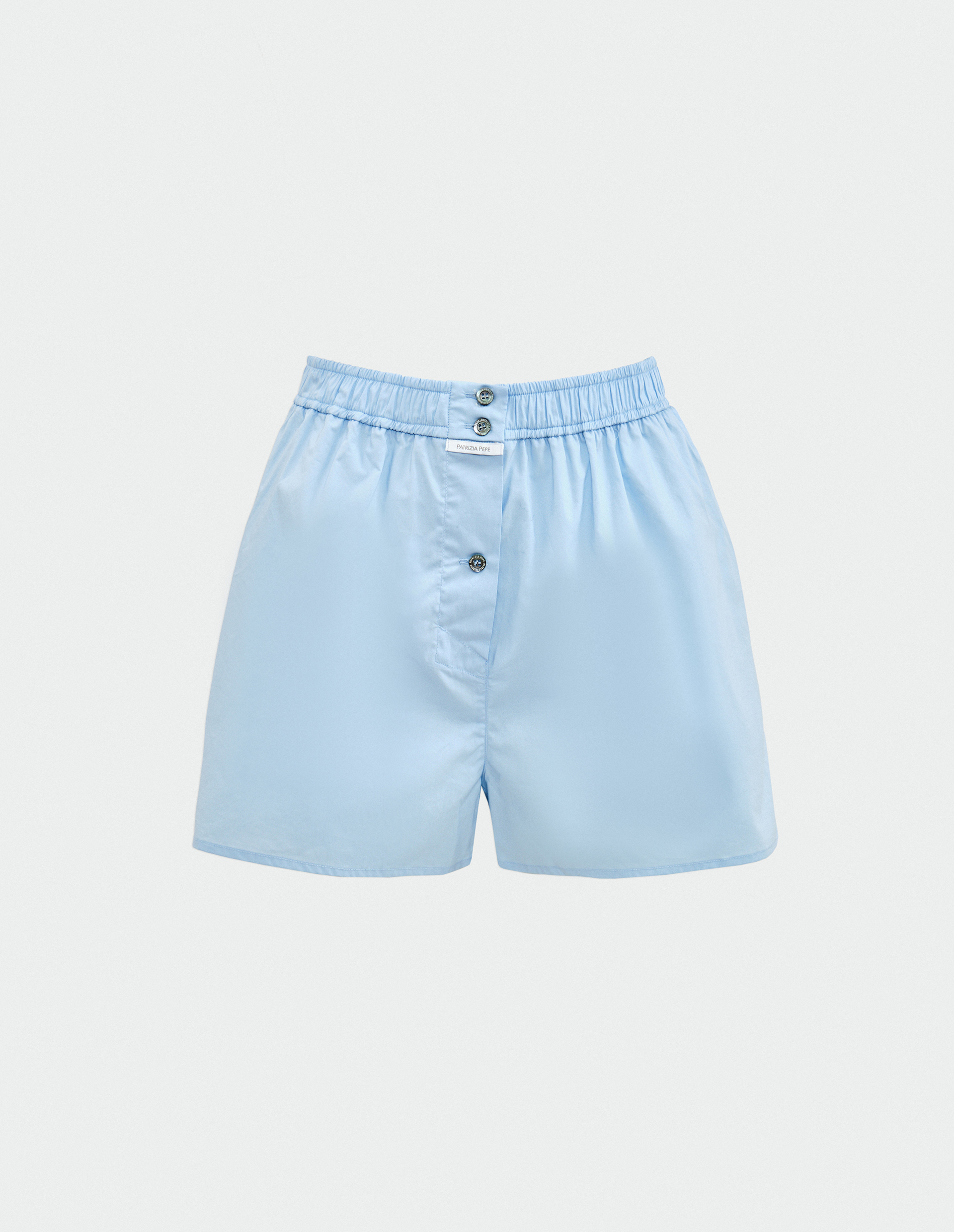 Эти шорты стали настоящим манифестом свободы и самовыражения от Patrizia Pepe, когда андрогинность носится эмоционально и женственно, а строгий крой становится холстом, на котором можно рисовать свою индивидуальность. Выполненные из голубого хлопкового поплина, они напоминают мужские трусы-боксеры, но становятся гламурно-соблазнительными благодаря перламутровым логотипированным пуговицам, фирменному патчу и адаптивному эластичному поясу.