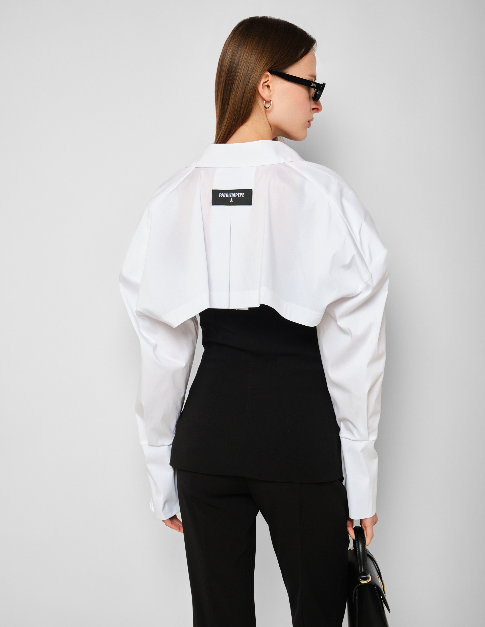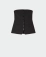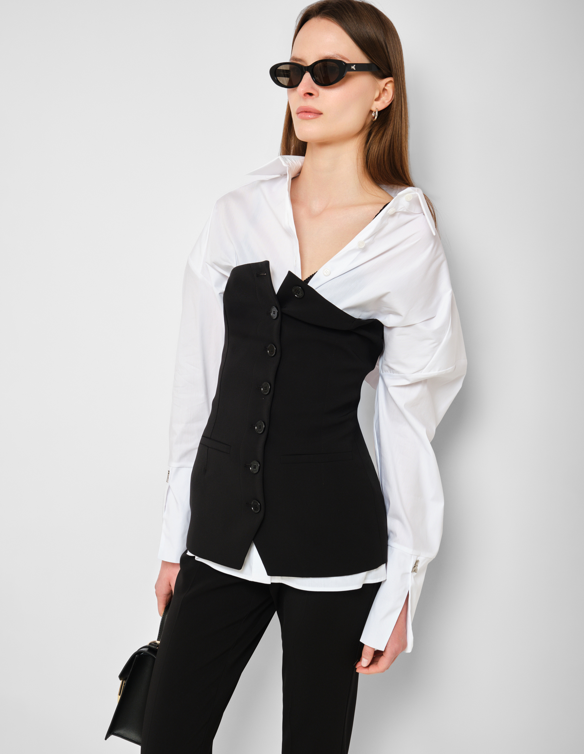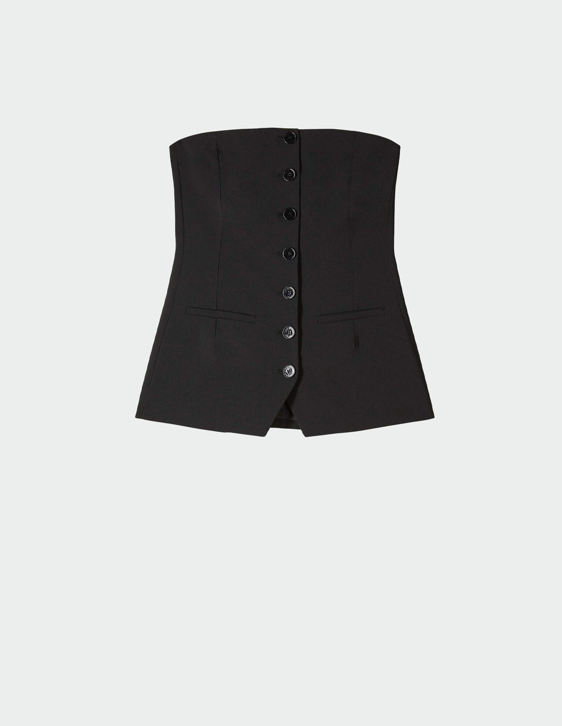 Топ — гибрид, в котором дисциплина корсета встречается со свободой современного гардероба. Его конструкция — чистая архитектура: жёсткая, формообразующая основа без бретелей создаёт скульптурный силуэт, который держится исключительно на безупречном крое. Ряд аккуратных пуговиц спереди работает не как функциональный элемент, а как графический акцент, визуально удлиняющий и структурирующий образ. Чёрный цвет здесь становится абсолютным фоном, позволяя форме говорить самой за себя.
