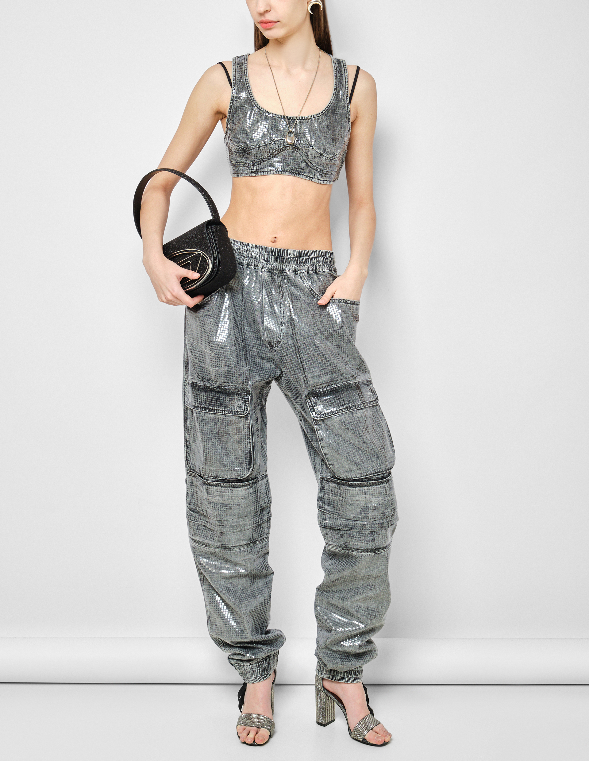 Эффектный серый джинсовый кроп-топ De-Toppy-S отражает экспериментальный подход бренда Diesel к современной fashion-индустрии. Серый деним имеет потертый дизайн , который декорирован мельчайшими квадратами из прозрачной пленки, создающие эффект блесток по всей поверхности. Акцентный кроп-топ продемонстрирует Вашу индивидуальность и самобытность, но также изящную тонкую талию. Рекомендуем создать сияющий образ вместе с серыми брюками-карго D-Mirt 0pgac с отливающей аппликацией от бренда Diesel.
