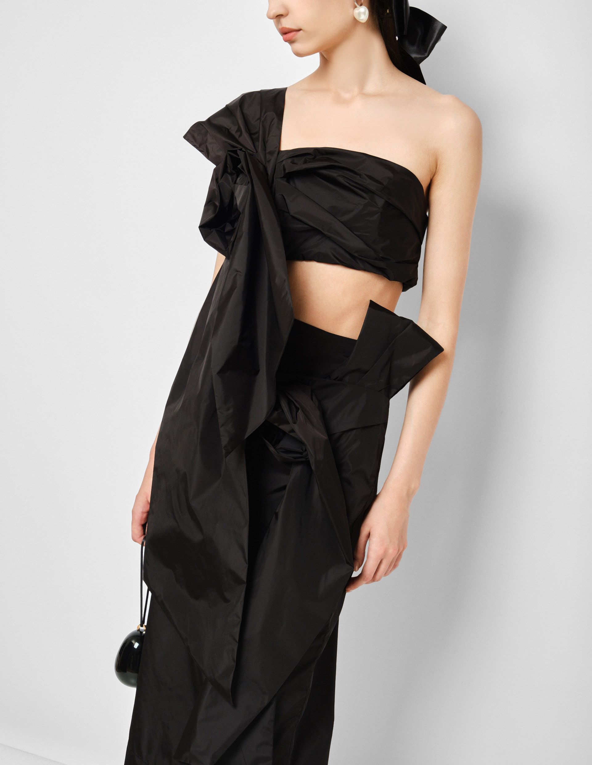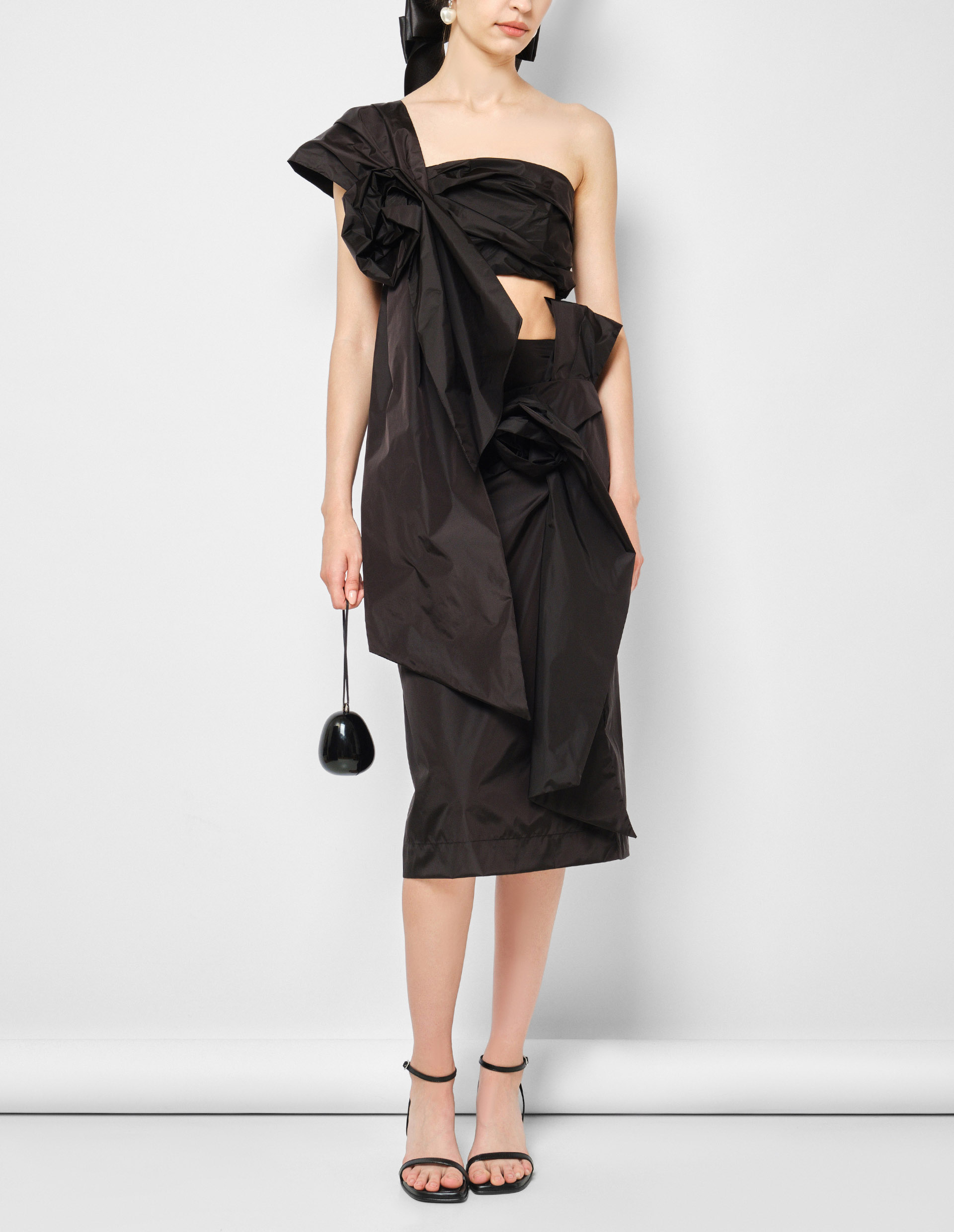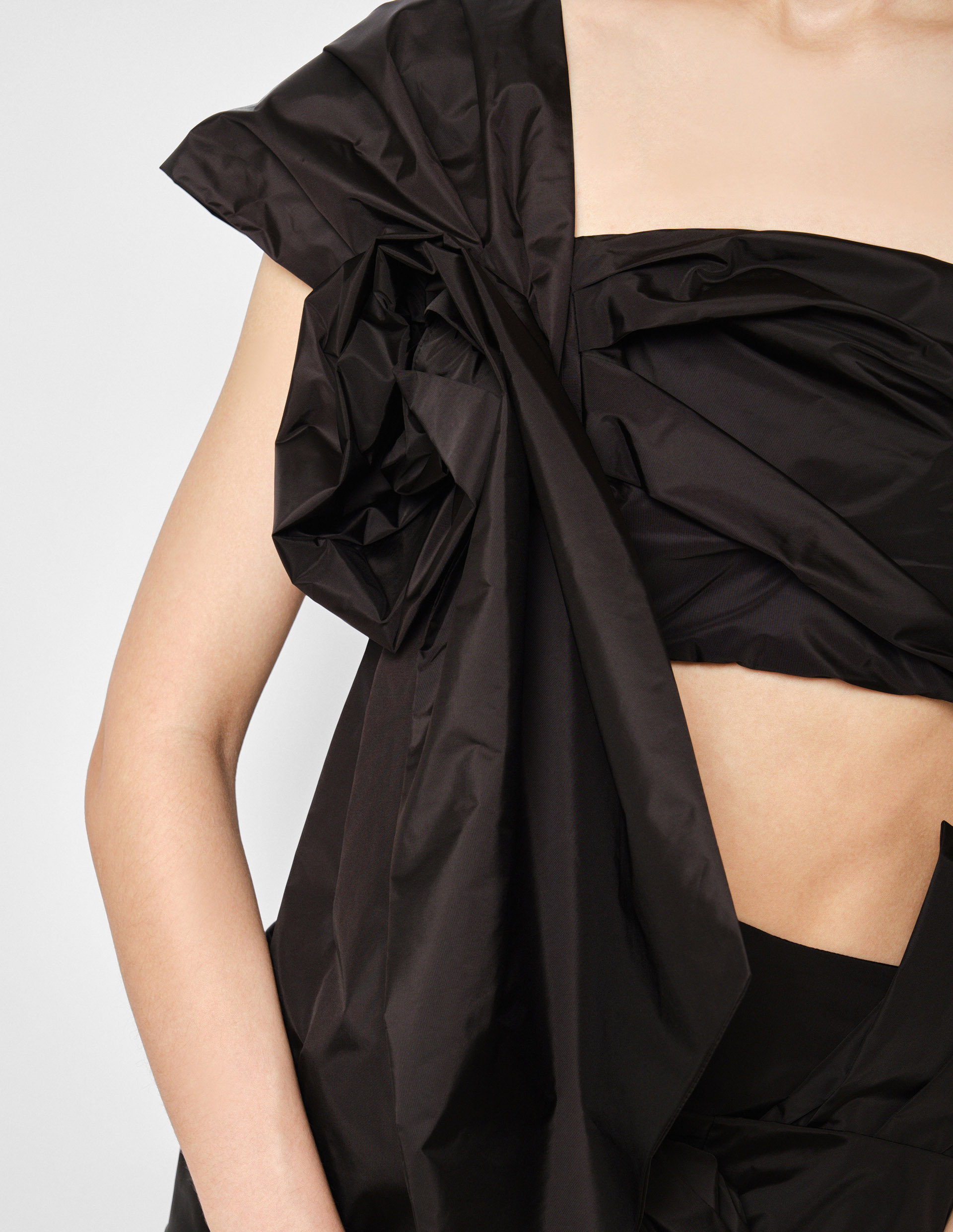 Флористическая эстетика лейтмотивом тянется по всей подиумной коллекции и зазывает нас в личный сад бренда Simone Rocha, где пышным цветом драпированные розы украшают акцентный черный топ на одно плечо. Искусное изделие выполнено из прочного полиамида с нежным подкладом и очаровывает многослойным эффектом. Декор укороченного топа придает изделию одновременно дерзкое, из-за насыщенного черного цвета, и нежно-романтичное настроение. Рекомендуем воссоздать изумительный подиумный образ вместе с черной юбкой-карандаш с цветочной аппликацией от бренда Simone Rocha.