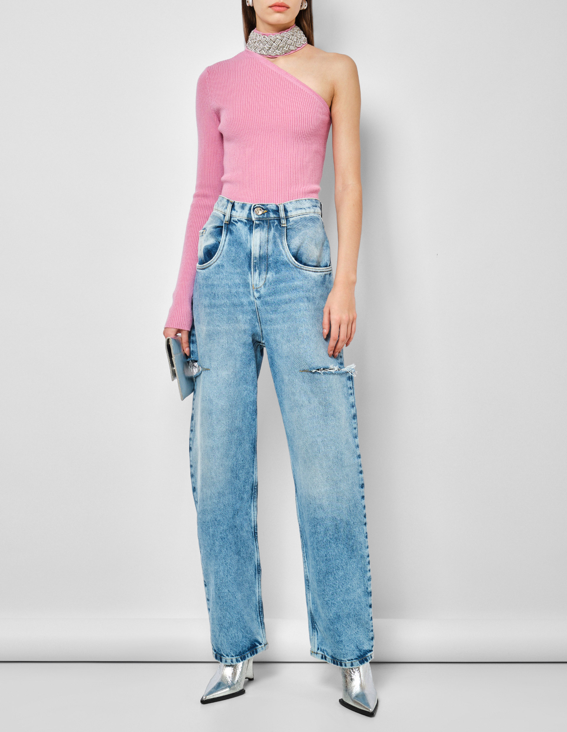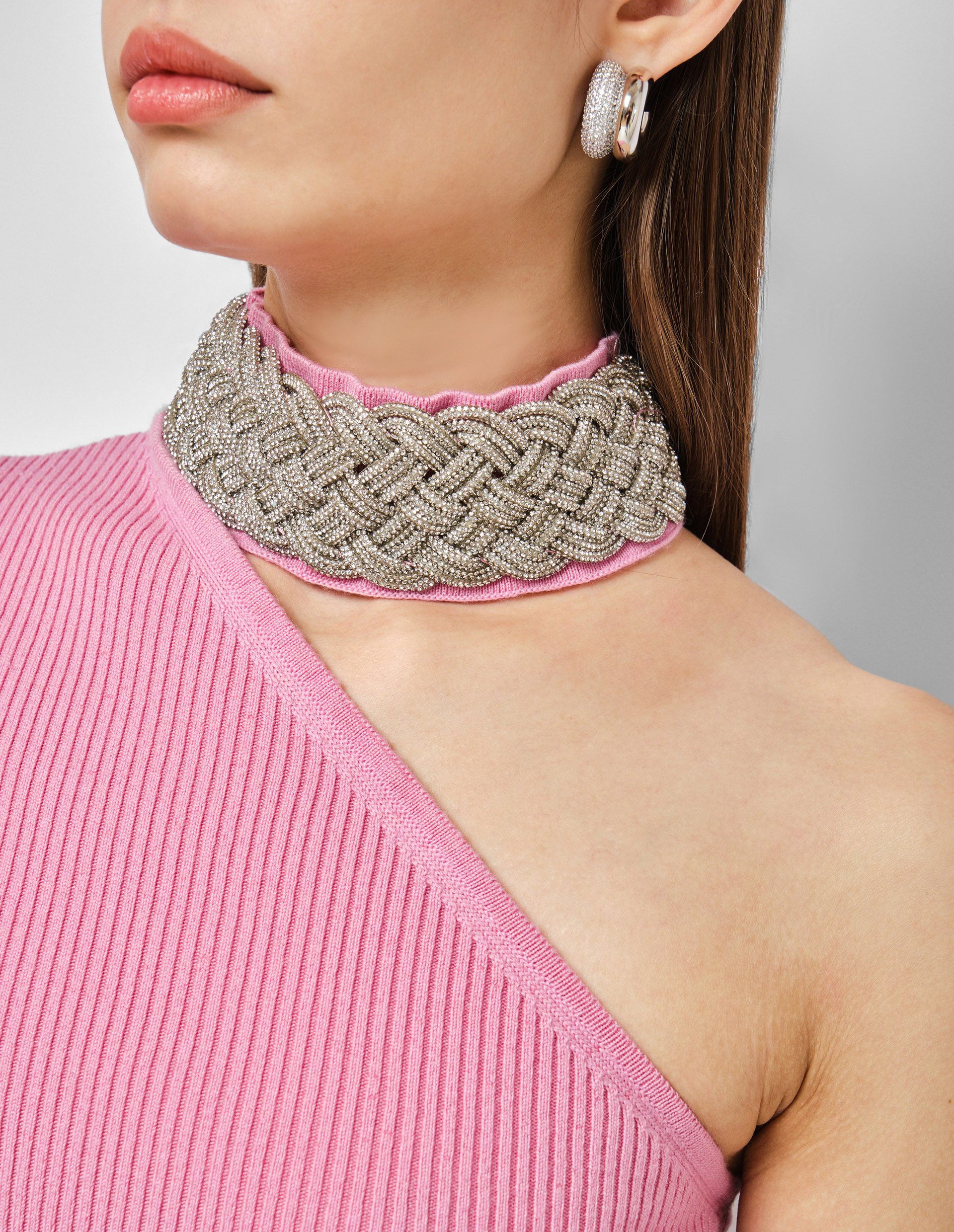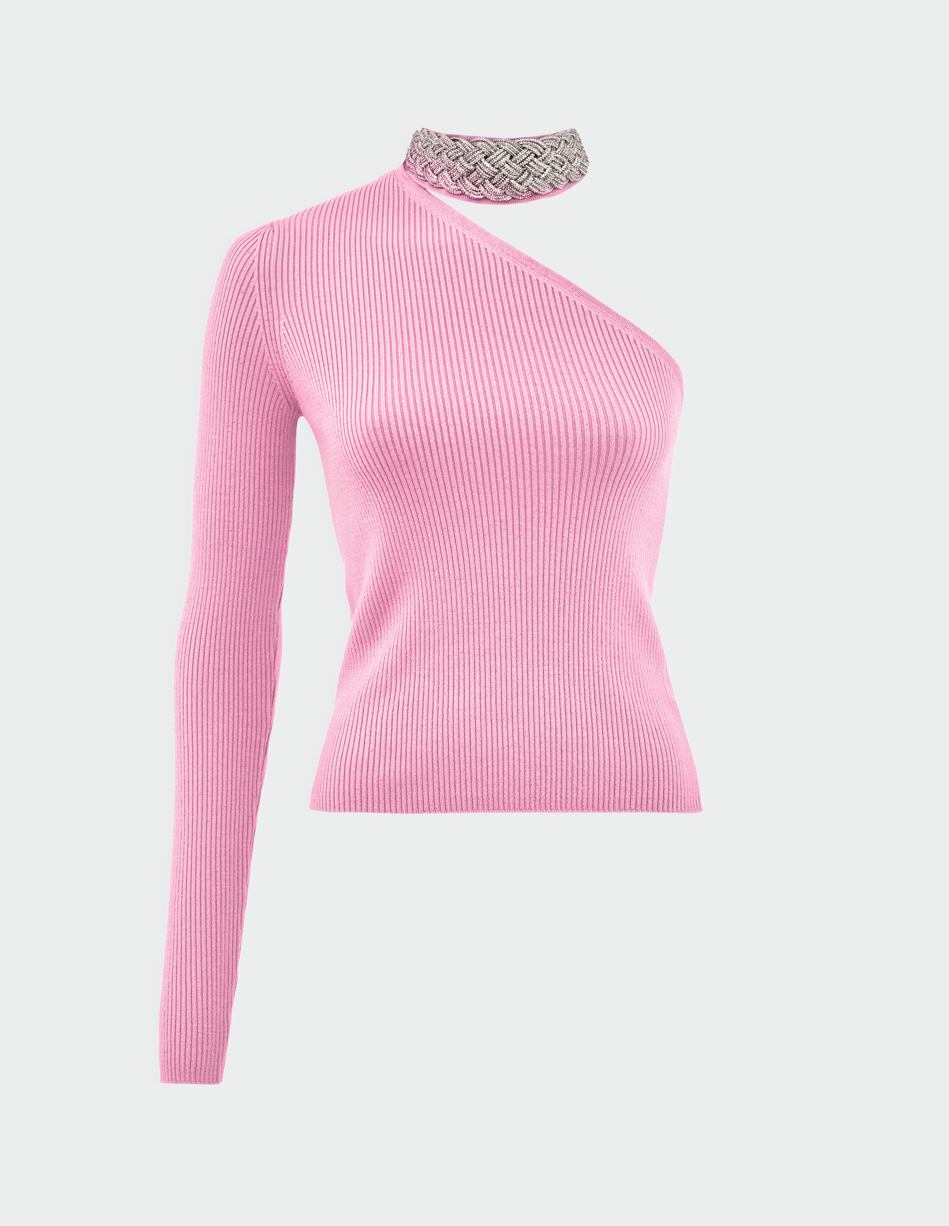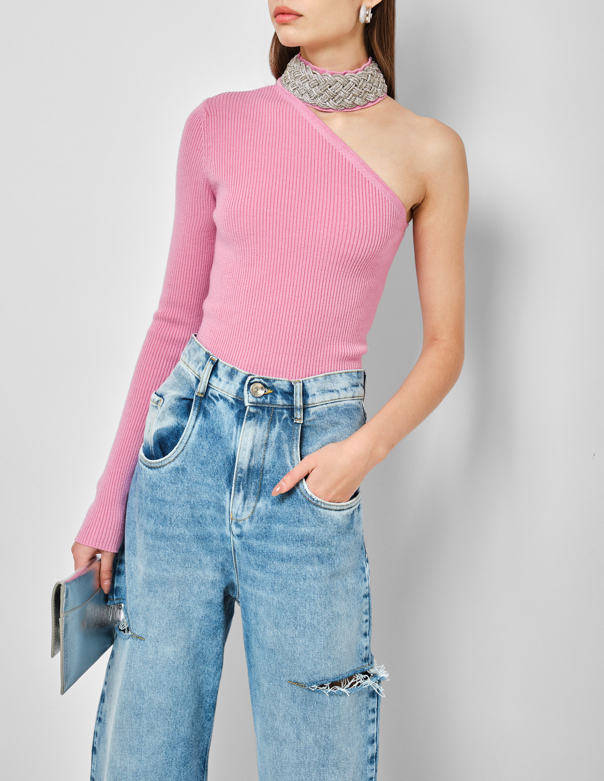 Когда настроение блистать и быть яркой спорит с желанием комфорта и удобства — выбирайте розовый топ от бренда Giuseppe di Morabito. Модель выполнили из фактурной смесовой мериносовой шерсти с добавлением лайкры, поэтому она плотно облегает фигуру и при этом почти не ощущается на теле. Пикантности изделию придают фигурный вырез слева и отсутствие рукава, а акцент — плетеный широкий воротник, стилизованный под чокер, украсили плетеными ремешками, покрытыми прозрачными стразами, которые играют мириадами бликов в лучах света.
