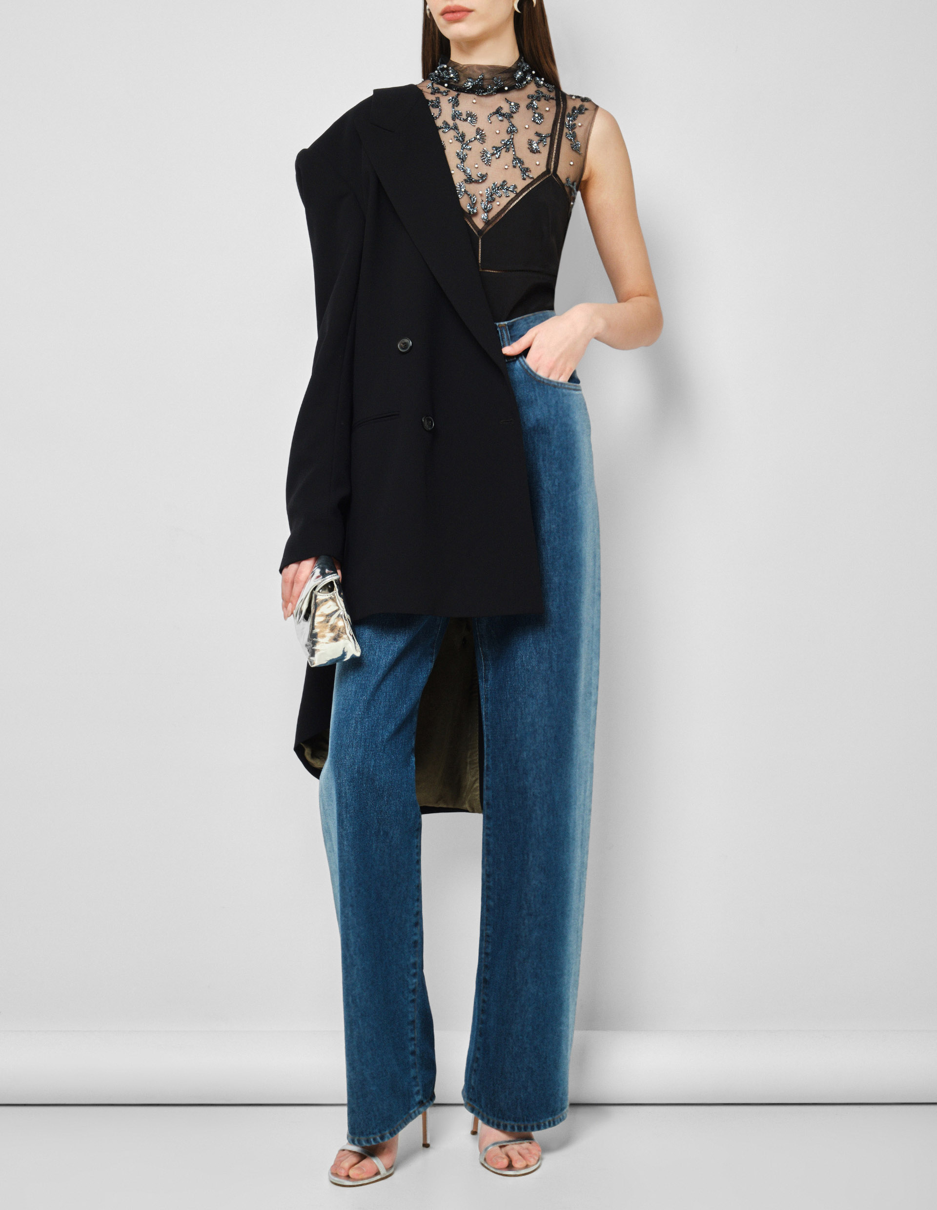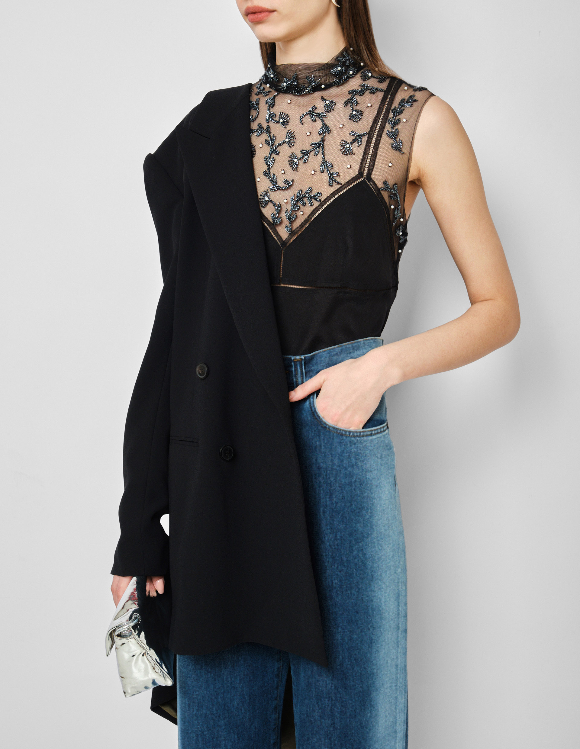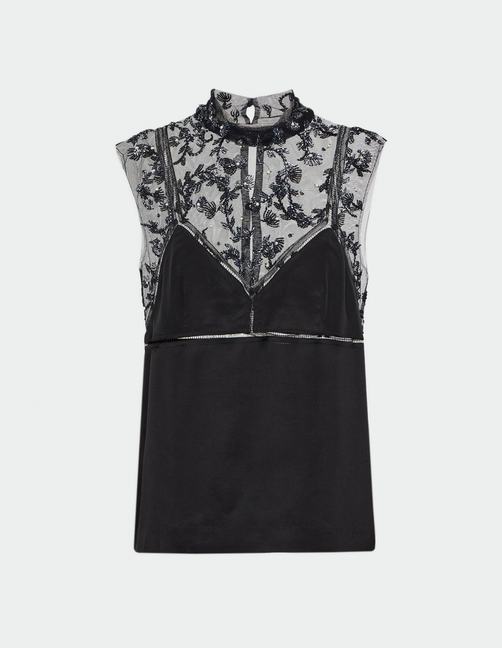 Творения концептуального и искусного бренда Dries Van Noten всегда отличают необычные мастерские детали и представленный черный топ моментально подкупает своей необычной вышивкой ручной работы и эффектом «тромплей». «Тромплей» — это эффект оптической иллюзии, которую дизайнеры позаимствовали из мира изобразительного искусства. Где тонкая черная сетка в районе декольте перетекает в тонкие бретели топа без рукавов с имитацией бра. Изделие выполнено из тончайшего шелка и crêpe de chine и расшито граненым бисером и жемчугом в виде излюбленного флористического мотива дизайнера бренда.