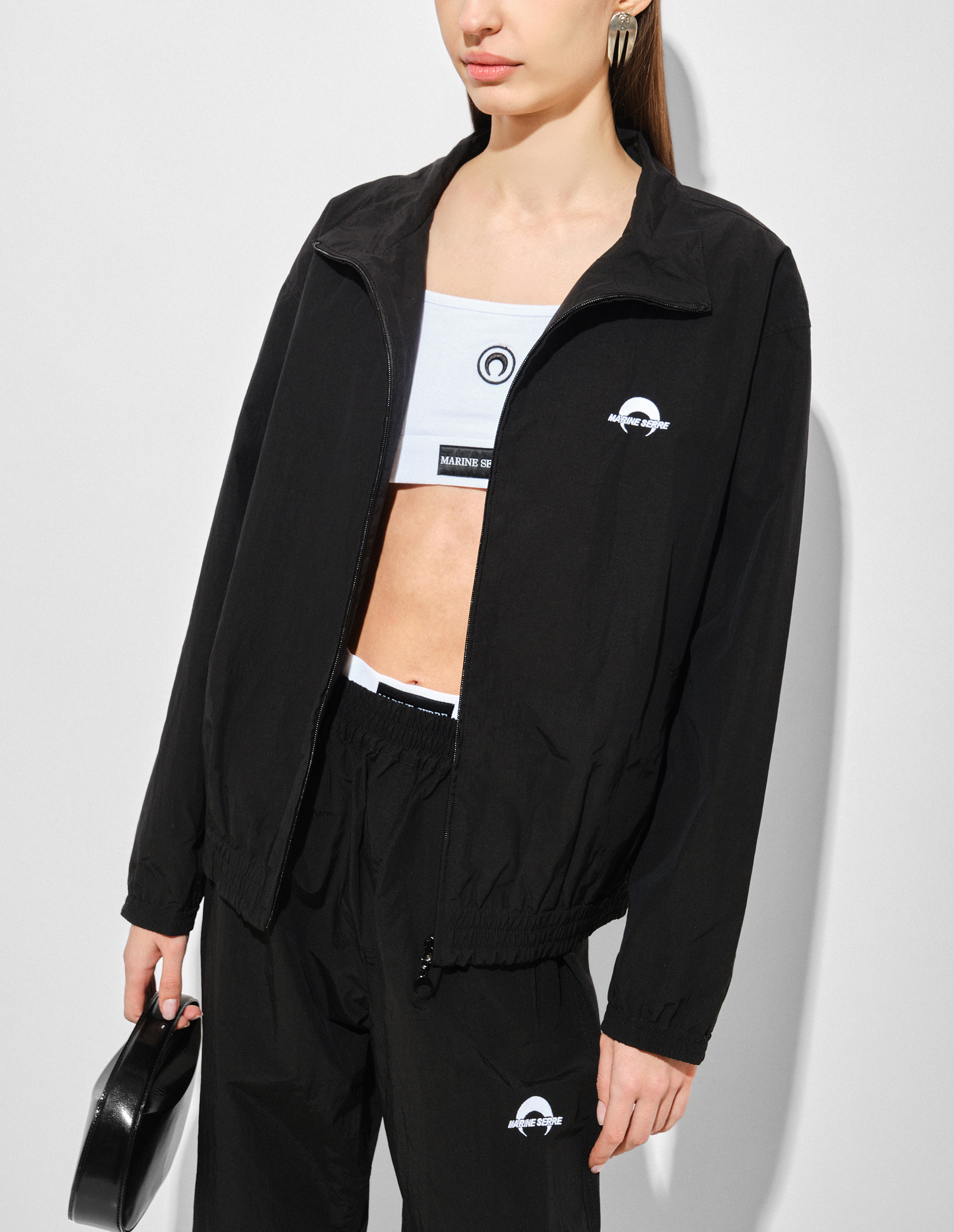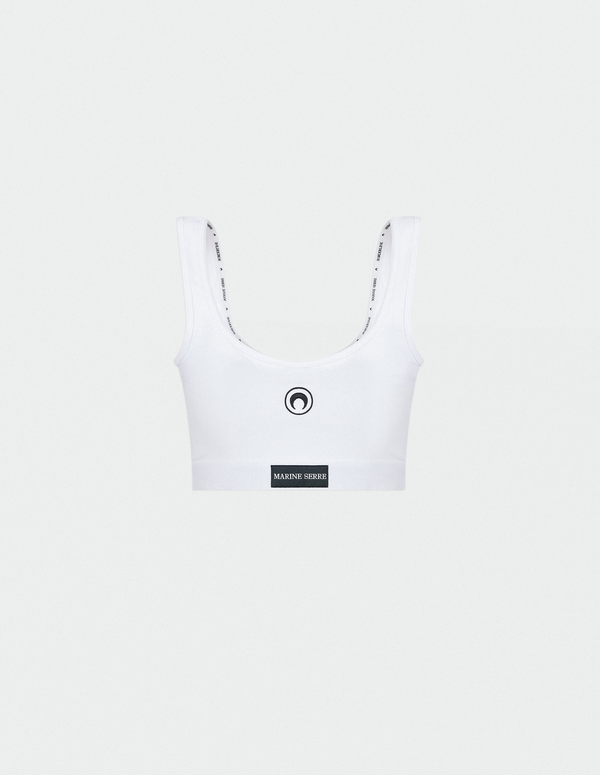 Белый топ SPORT BRA от Marine Serre изготовлен из джерси на основе 100% органического хлопка, закупаемого в Турции для линии Borderline. Сырье имеет сертификат GOTS — ведущий в мире стандарт обработки текстиля, который соответствует приверженности спасения планеты. Эстетика модели имеет прогрессивный дух и стиль, взятый непосредственно из вселенной спортивной одежды, что подтверждается простыми линиями, широкими бретелями и эластичной широкой резинкой по линии низа с брендированным патчем. Вышитый на груди логотип Circle Moon — знак бесконечных лунных фаз, означающих текучесть и возрождение.