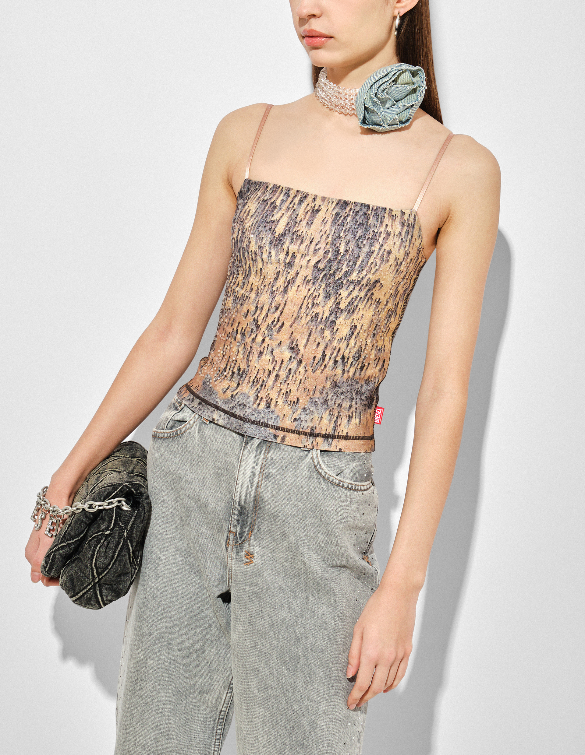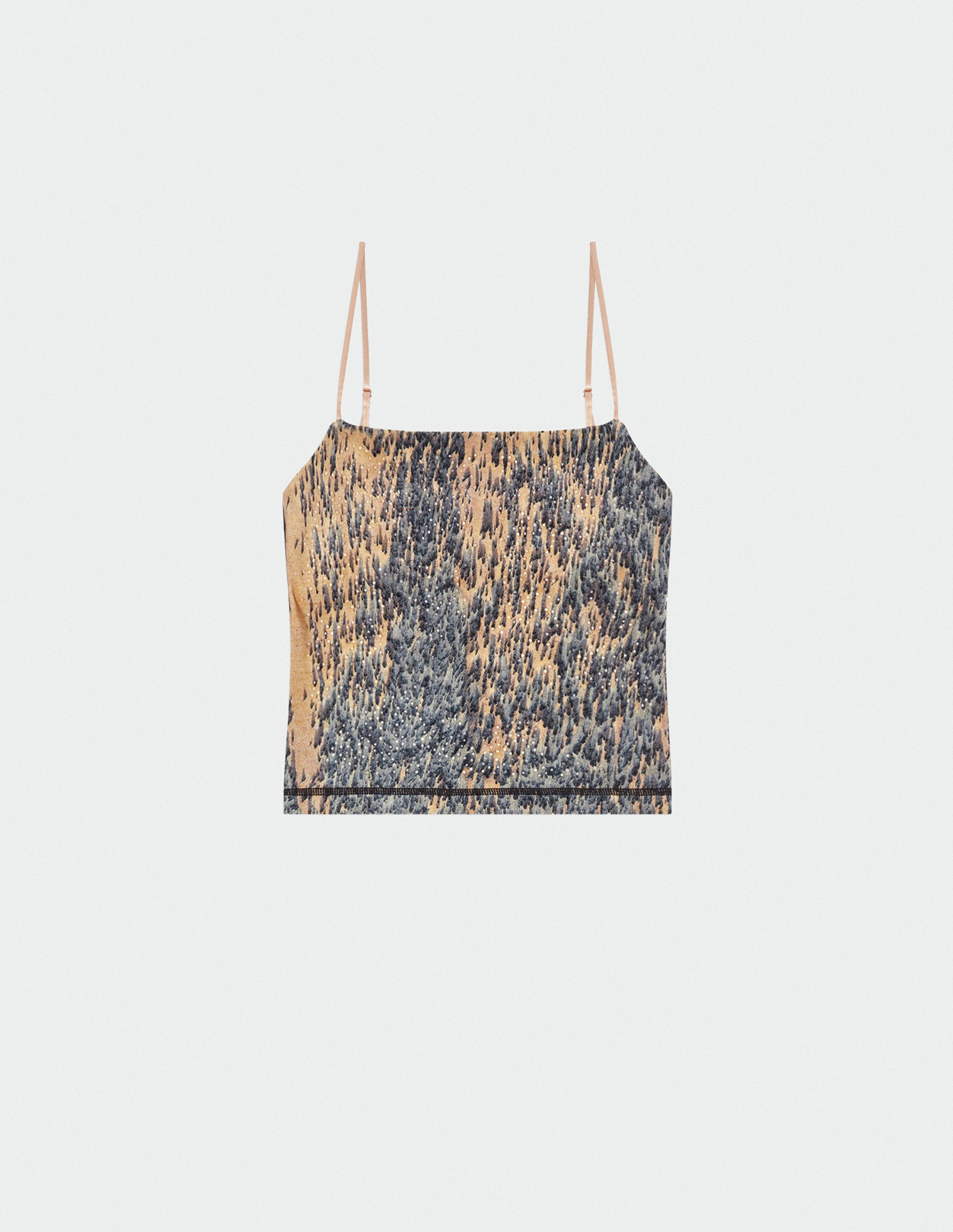 Этот топ на тонких регулируемых бретелях изготовлен из эластичного джерси, украшенного графическим абстрактным принтом «Rain Camo». Дизайнеры задумали сделать его похожим на кислотный дождь, поэтому для усиления эффекта нанесены прозрачные, похожие на капли кристаллы, которые повторяют рисунок. Силуэт слегка укорочен, с контрастной строчкой по линии низа и комфортной безупречной посадкой.