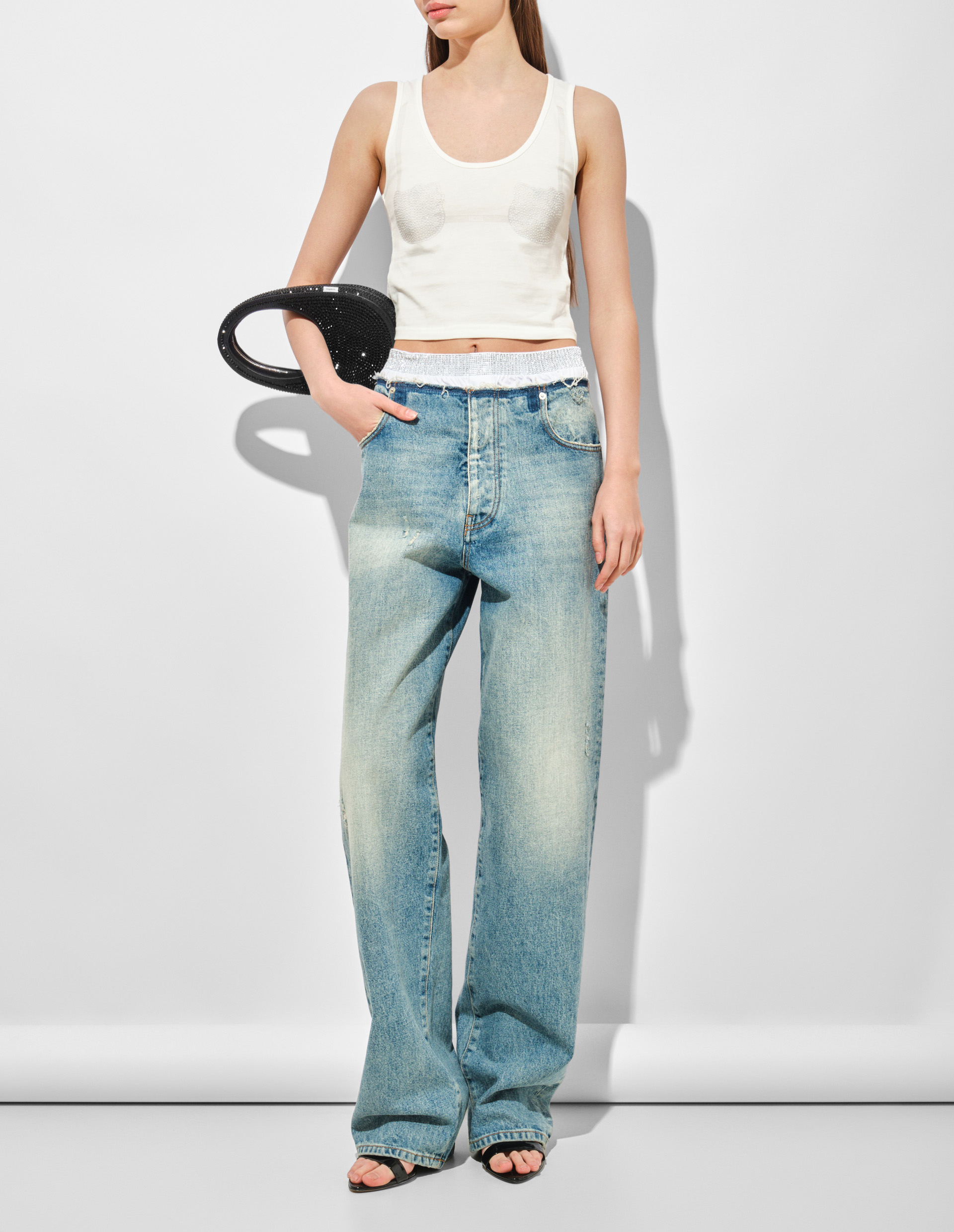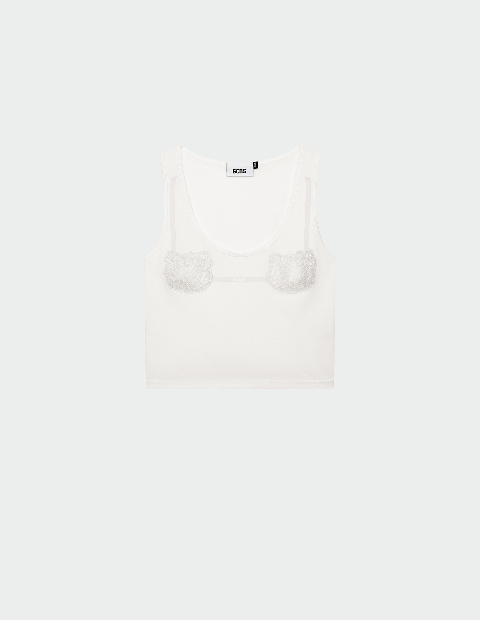 В дерзком диалоге между итальянским luxury-streetwear со стороны GCDS и японской поп-культурой Hello Kitty появился этот топ. Укороченная белая модель из мягкого хлопкового джерси становится холстом для провокационного принта: стилизованный бюстгальтер Hello Kitty, украшенный россыпью сверкающих страз. Этот неожиданный дизайн переосмысливает 50-летнее наследие культового персонажа, соединяя детскую наивность с современной streetwear-эстетикой. Минималистичный крой и смелая графика делают топ универсальным акцентом для тех, кто ценит fashion-провокацию.