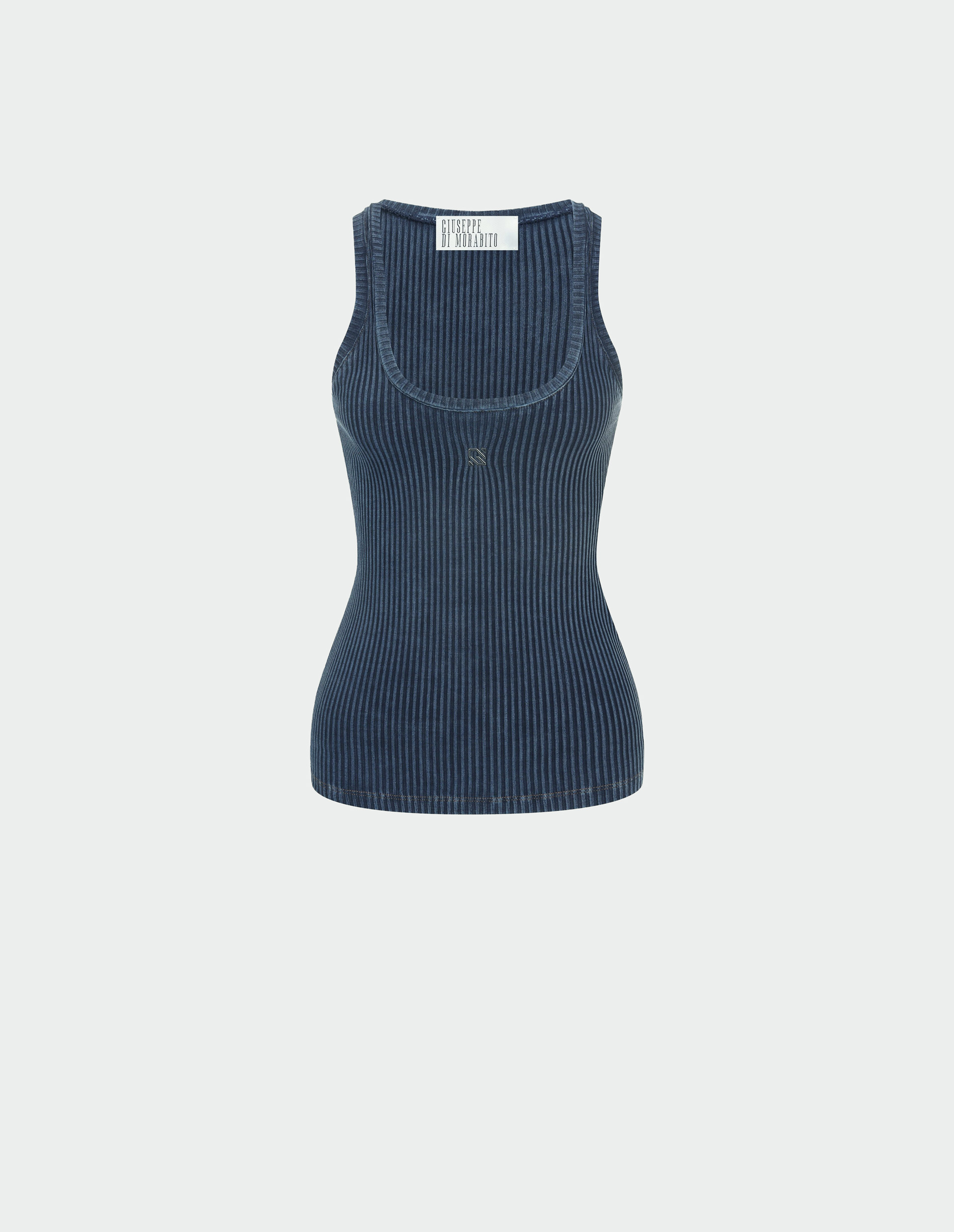 Этот топ от Giuseppe Di Morabito олицетворяет скульптурную чистоту линий. Его плотный хлопок с эластичной структурой обволакивает тело, подчеркивая естественные изгибы. Глубокий оттенок синего с эффектом выцветания на средиземноморском солнце формирует визуальную глубину. Металлический логотип на груди — единственный акцент в строгой композиции. Минималистичная модель, где каждая деталь: от формы до качества Made in Italy, приведена к совершенству.