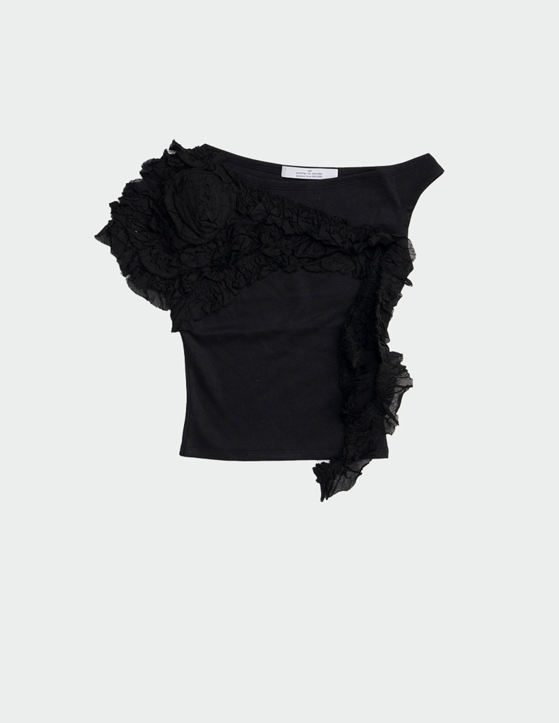 Этот топ сочетает в себе фантазию и реалистичный подход. Изготовленный из смесового хлопка, он представлен безрукавной конструкцией, приоткрывающей плечо, и облегающей посадкой. Украшает модель объемная цветочная аппликация, изготовленная вручную. Команда бренда экспериментировала с тканями: переработанным шифоном, используя техники, которые придали изделию новую романтическую мягкость, сохранив при этом фирменную изобретательность дизайнера. «Вдохновение пришло исключительно из работы, проделанной за столом нашей мастерской», — объясняет Хван.