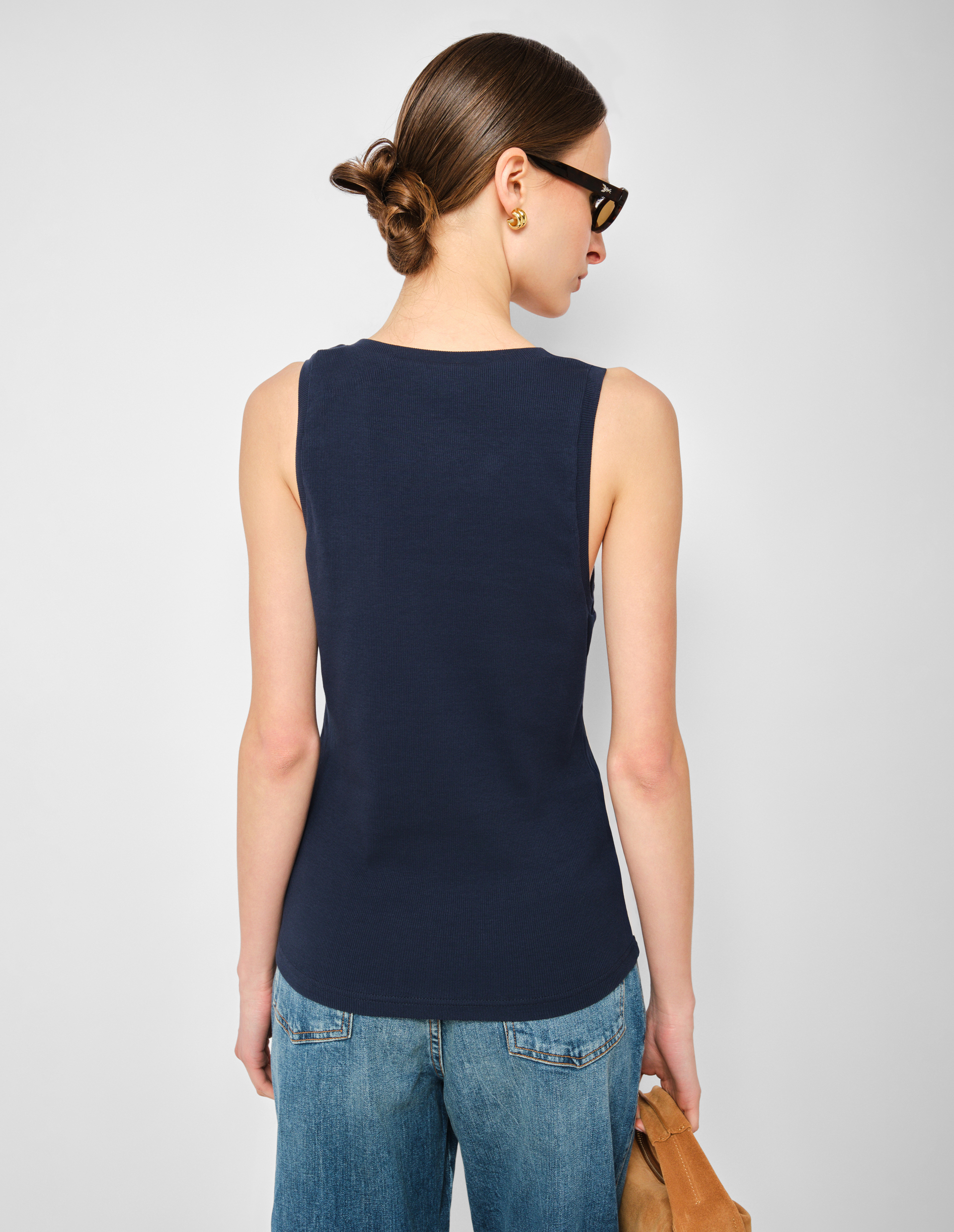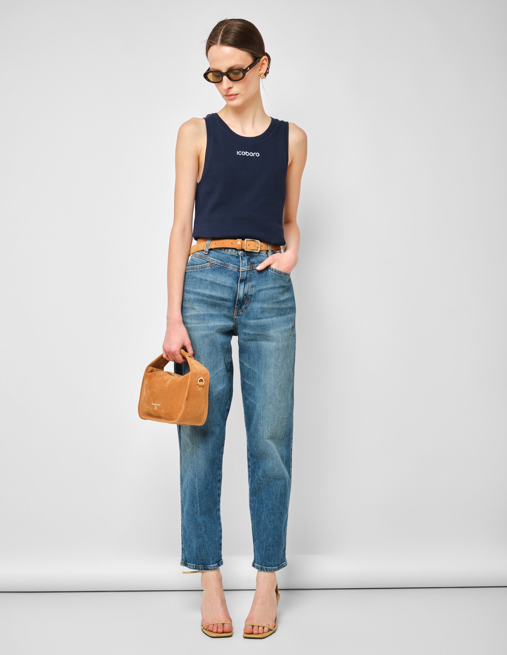 Топ без бретелей от ICEBERG — идеальный баланс между базовой необходимостью и люксовой деталью. Насыщенный темно-синий оттенок, благородный и глубокий, выступает альтернативой классическому черному, добавляя образу мягкости и визуальной глубины. Это тот цвет, который работает и как самостоятельный акцент, и как идеальный фон для многослойных комбинаций. Модель выполнена из ребристого стретч-хлопкового джерси высшего качества — ткань с идеальной эластичностью мягко облегает тело, следуя за каждым изгибом, но при этом не сковывает движений и возвращается в исходную форму после растяжения. Безрукавный крой открывает линию плеч, добавляя образу женственности и архитектурной четкости. Ребристая структура создает деликатную игру фактур, превращая простую майку в предмет с характером. В центре внимания — на груди: металлическая плакетка с логотипом Iceberg. Холодный блеск металла контрастирует с матовой глубиной синего хлопка, добавляя индустриальной эстетики и люксового шика. Эта деталь расположена так, чтобы быть замеченной, но не доминировать — идеальная подпись мастера. Сегодня мода на осознанный минимализм и качество базовых вещей выходит на первый план — эта майка доказывает, что простота может быть роскошной. Носите её с белыми брюками для создания контраста цвета и фактуры или с джинсами и пиджаком для расслабленного smart-casual образа. Можно использовать как первый слой под прозрачную блузу или расстегнутый кардиган — универсальность этой майки не знает границ. Польза этой вещи — в её абсолютной базовости и способности поддерживать любой, даже самый сложный образ, оставаясь незаметной, но необходимой деталью. Важный нюанс: ребристый стретч-хлопок высокого качества не вытягивается на плечах и не теряет форму после множества стирок. Металлическая плакетка прочно закреплена и устойчива к царапинам и потертостям. Темно-синий цвет сохраняет насыщенность благодаря использованию премиальных красителей, которые не выцветают и не линяют со временем.