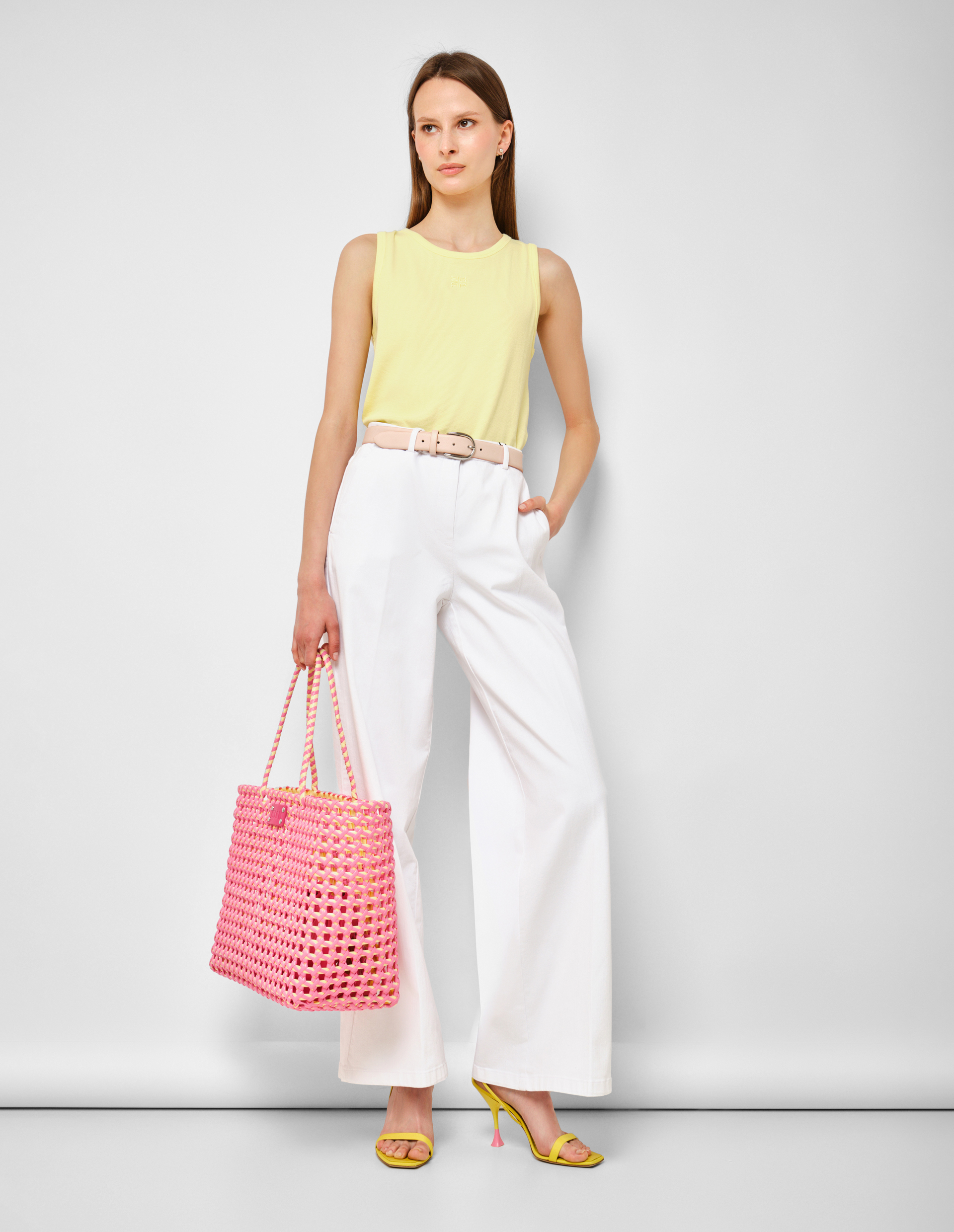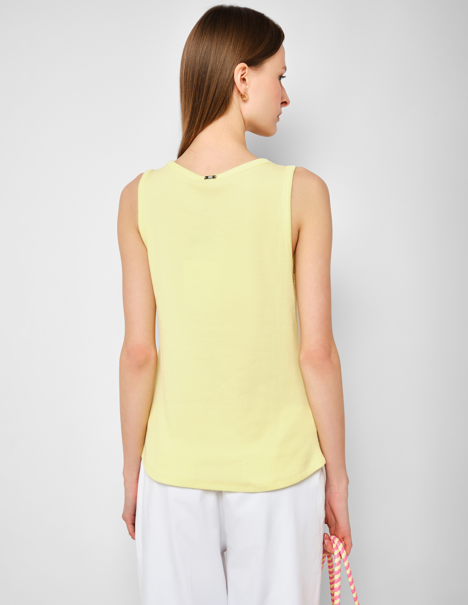 Цитрусовая свежесть и двойная подпись бренда. Этот топ от RIANI представляет собой чистый пример того, как базовый предмет гардероба становится носителем фирменной идентичности. Сочно-лимонный оттенок, яркий и жизнерадостный, мгновенно поднимает настроение и добавляет энергию любому образу. Фактурная ткань в мелкий рубчик создает выразительную игру света и тени, делая облегающий силуэт еще более скульптурным. Главные акценты — двойной знак принадлежности к бренду: спереди аккуратное вышитое лого, а сзади — металлический логотип сверху, который становится неожиданной деталью для тех, кто окажется позади. Тонкие бретели и классический крой tank топа делают эту модель идеальной основой для многослойных образов или самостоятельным верхом для жаркого дня.