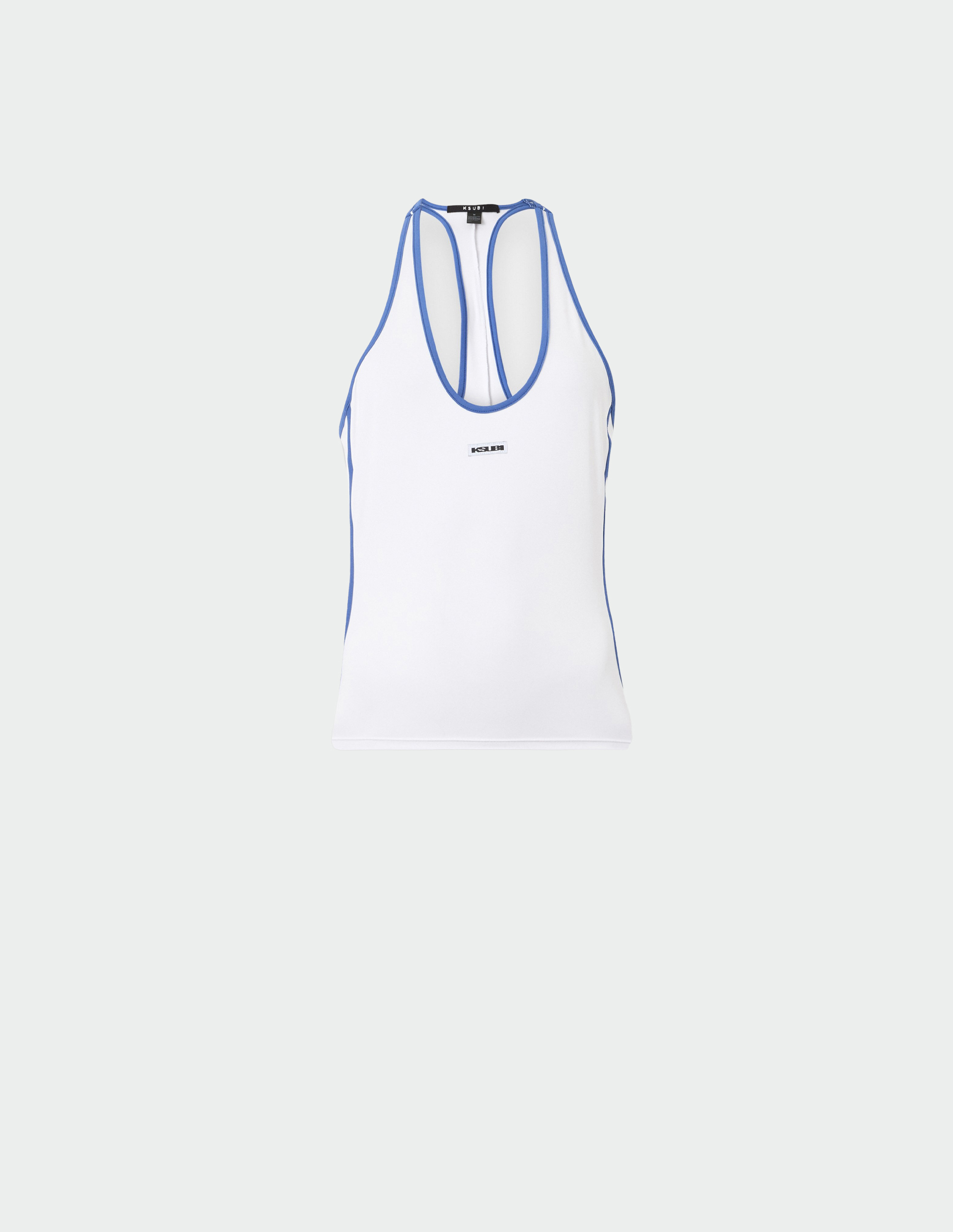 Спортивная классика с бунтарским акцентом. Топ от KSUBI переосмысливает базовую модель через призму дерзкой эстетики и чистых линий. Белый корпус, выполненный из мягкого хлопкового джерси, создает свежий, минималистичный фон. Контрастная синяя окантовка по краям и проймам добавляет графической четкости и визуально расширяет плечевую зону, делая силуэт более структурированным. Тонкие бретели создают открытую линию плеч и декольте, добавляя образу женственности и непринужденной дневной эстетики.