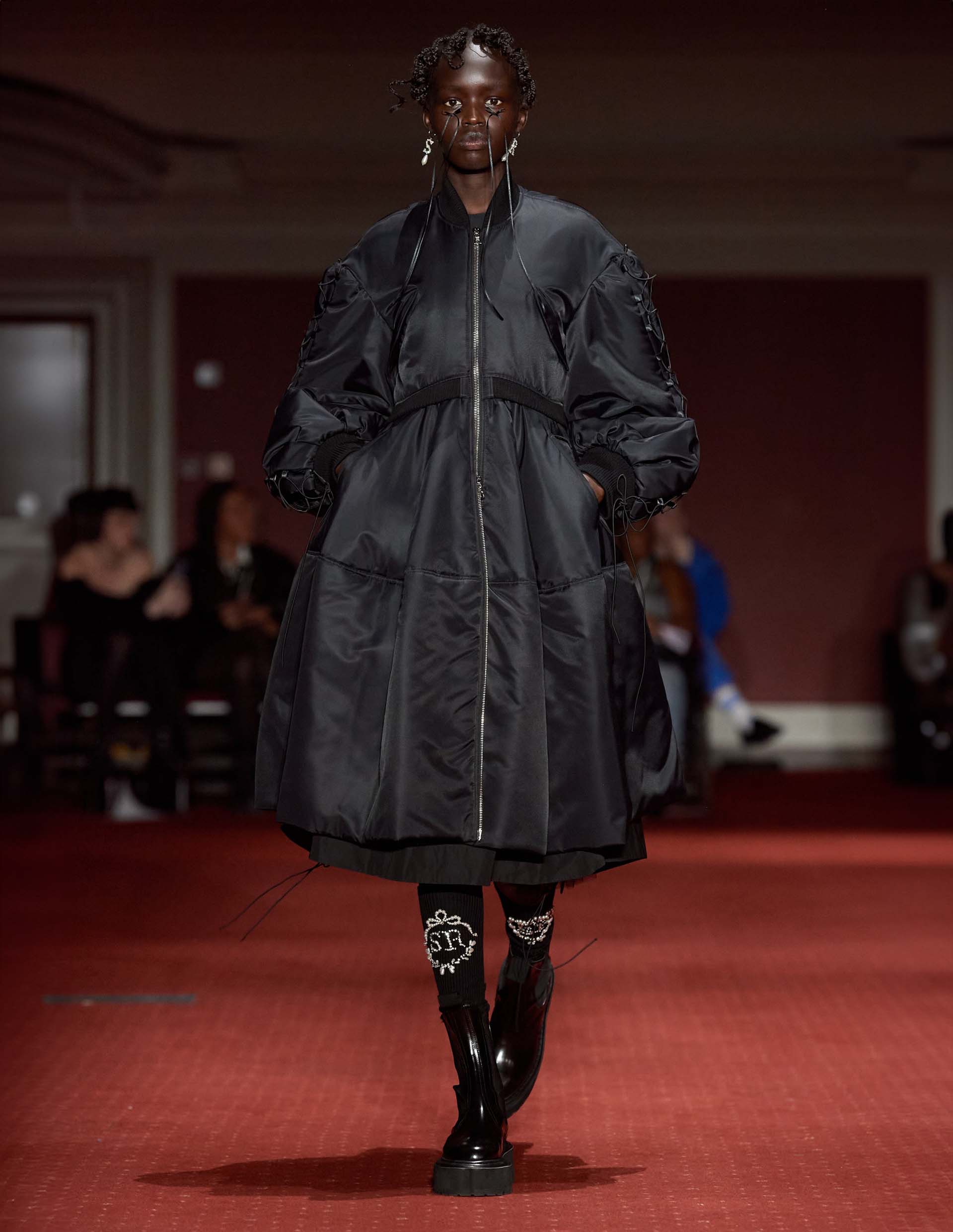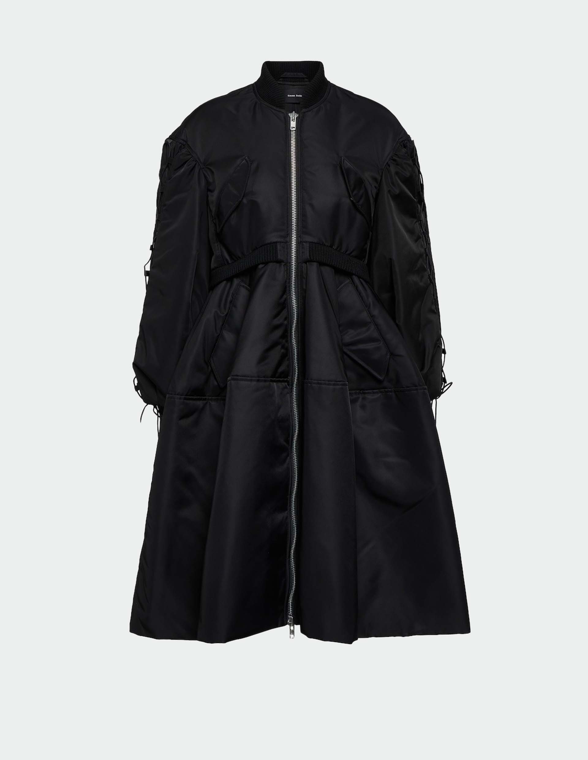 Когда чувство женственности объединяется с некоторой экспрессивностью и желанием выделяться, которые проявляются в современных затейливых формах, рождается удивительное сочетание, способное вывести образы на новый уровень. Такой эффект способен произвести черный удлиненный бомбер подиумной коллекции, который представляет собой эксперимент с традиционным кроем бомбера, но и искусность декора. Стильная драпировка на рукавах создает легкость, а эластичная кулиска на талии придает феминные очертания, имитируя свободное платья, чем делает бомбер пикантнее и многограннее.