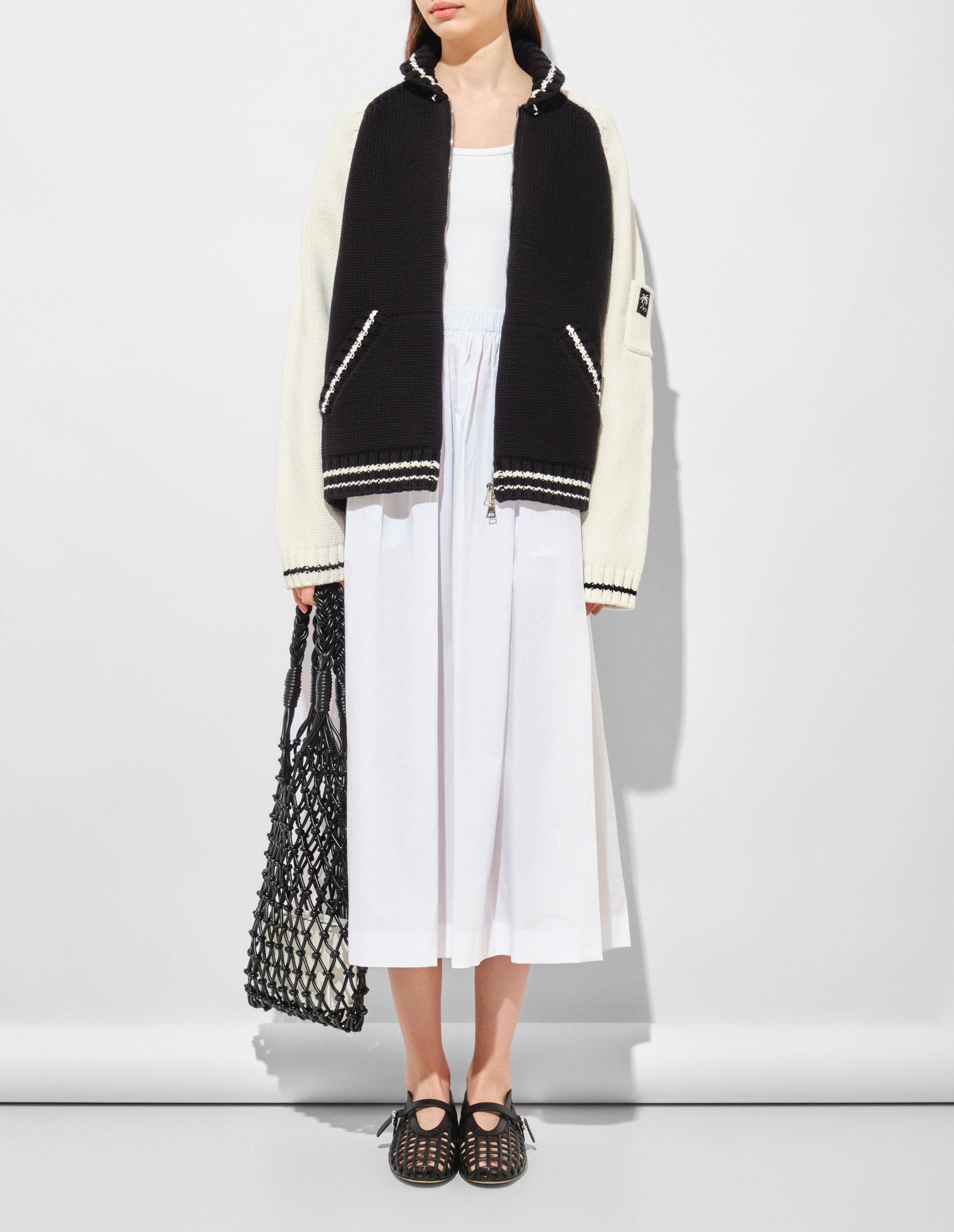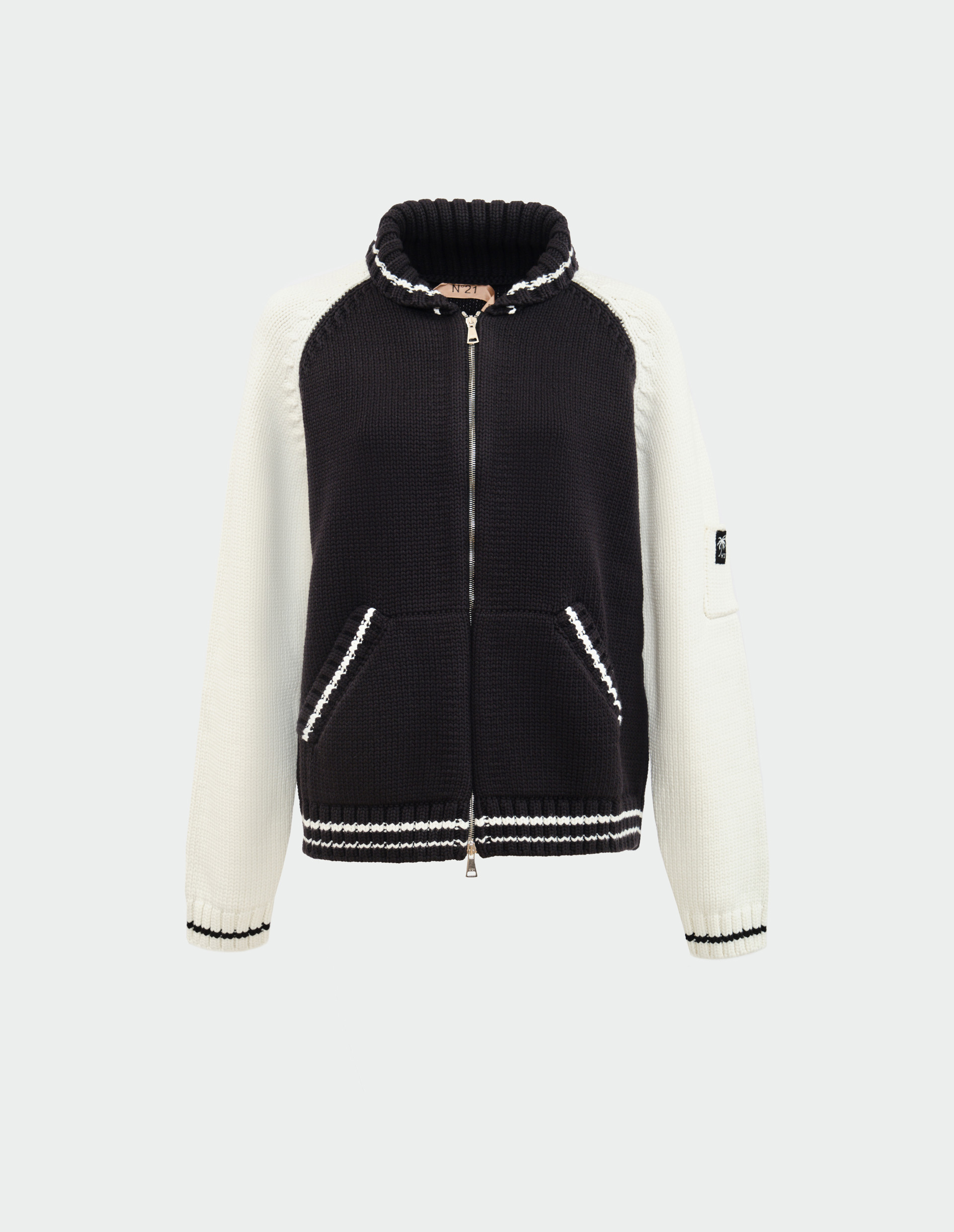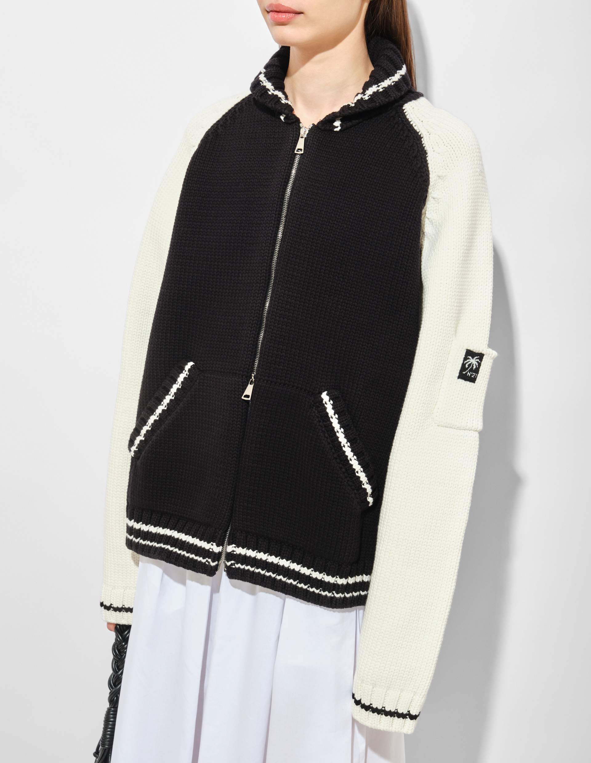 Черно-белый бомбер от N°21 — воплощение фирменного баланса между строгой элегантностью и благородностью. Хлопковый трикотаж с контрастной отделкой создает динамичный ритм, характерный для эстетики бренда. Отложной воротник добавляет ноту шика, а рукава реглан с накладным карманом подчеркивают продуманность кроя. Двусторонняя молния и передние прорезные отделения усиливают утилитарный характер модели, сохраняя при этом чистоту линий. Жаккардовые логотипы на спине и рукаве действуют как тонкие, но узнаваемые акценты — типичный для Алессандро Дел’Аква подход, где детали говорят громче слов. Универсальная вещь, которая легко сочетается с шелковой юбкой или кожаными брюками, отражая дух N°21: безупречный крой, неожиданные текстуры и всегда — намек на итальянскую чувственность.