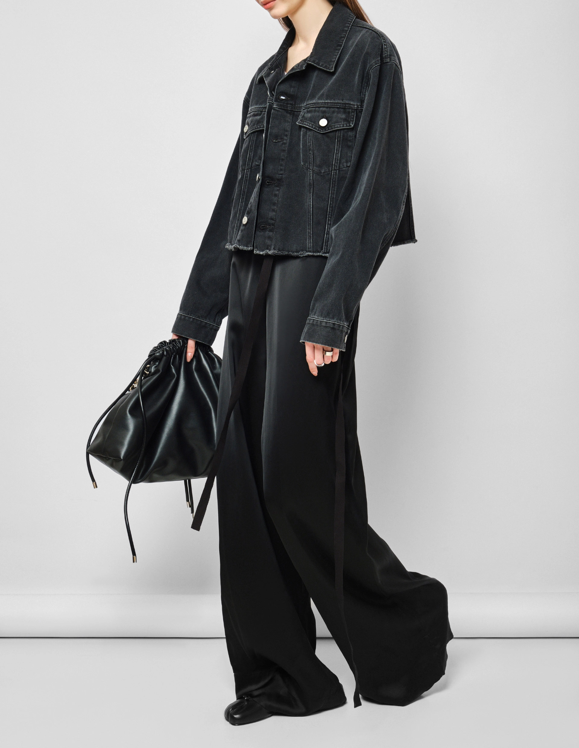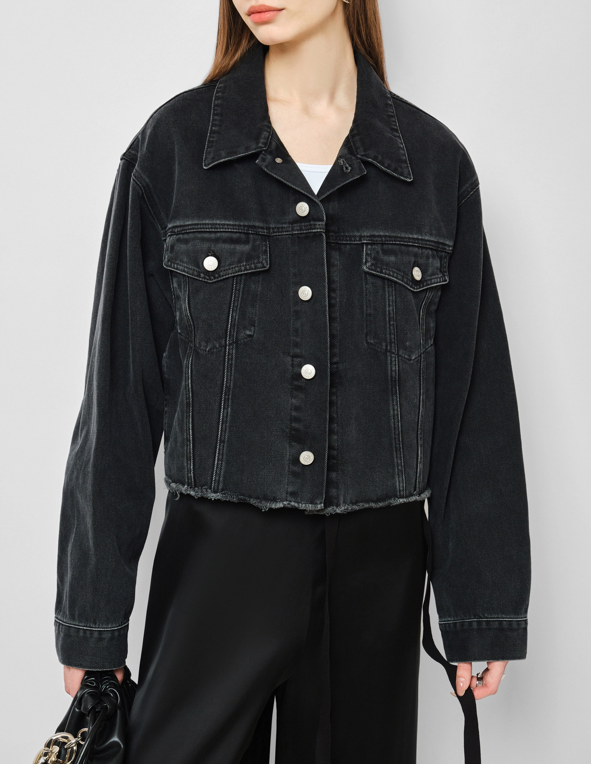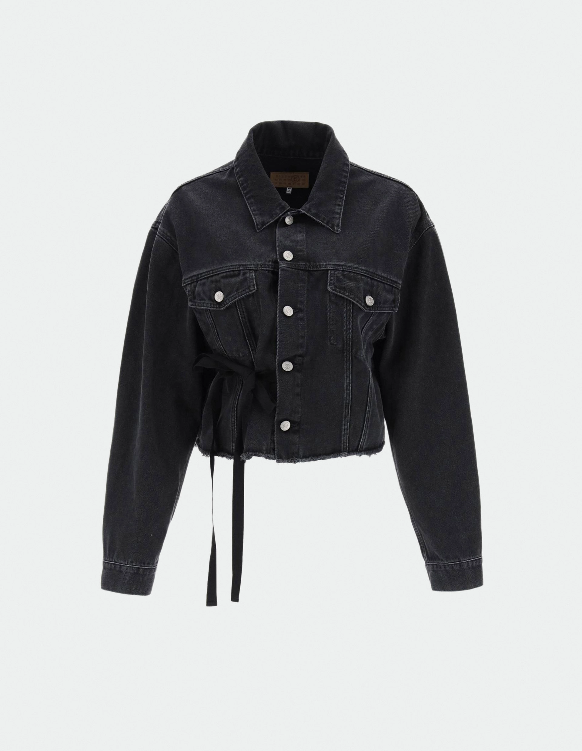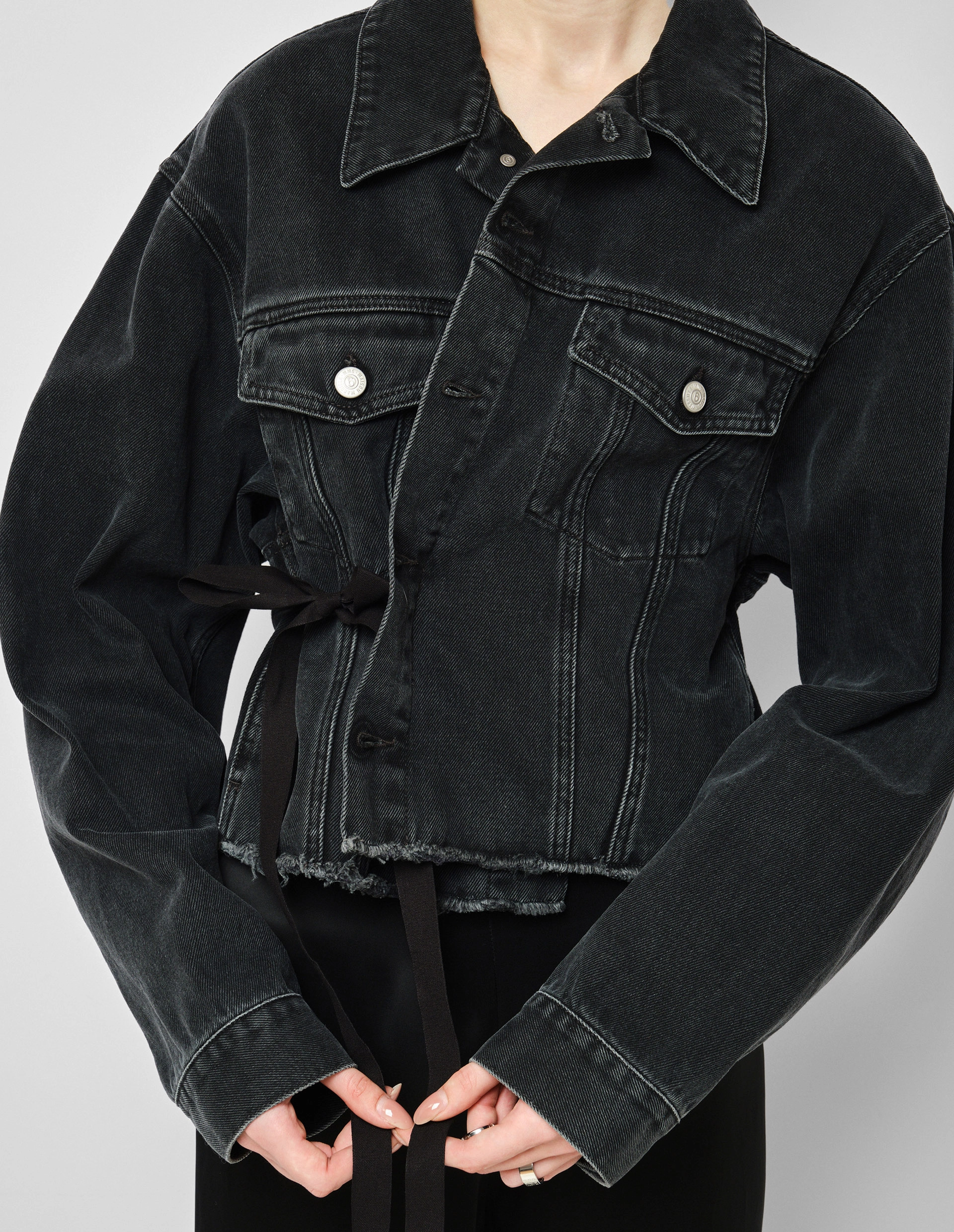 Джинсовая куртка выполнена из черного плотного денима, дополнена классической фурнитурой. Традиционный дизайн разбавлен элементом деконструкции — необработанным низом. Ленты на талии придают остроумие, изысканность привычному силуэту, а также несут практичную функцию: их можно завязывать сбоку, нося джуд на запАх. Горизонтальная строчка на спине — фирменная подпись культового MM6 Maison Margiela.