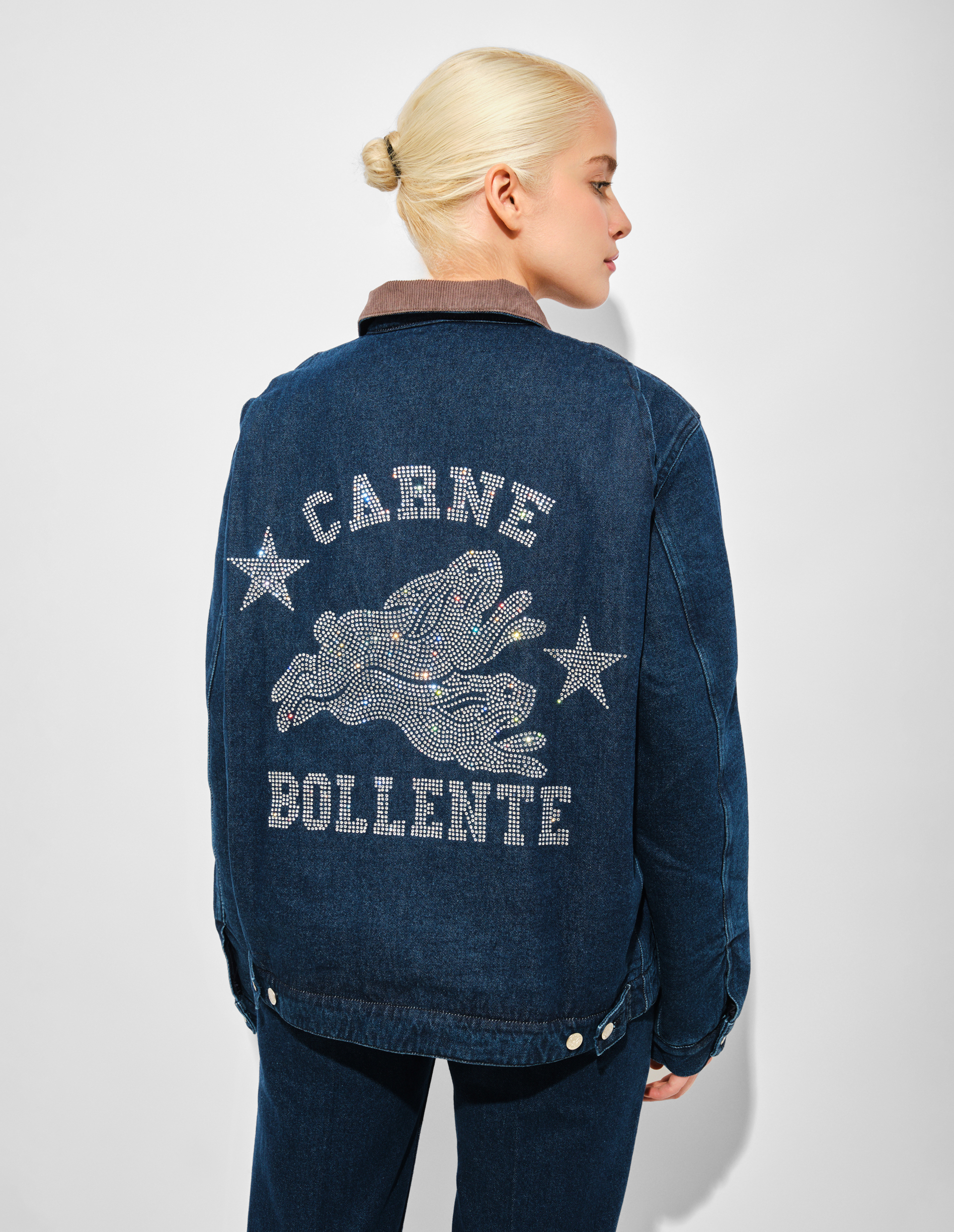 Куртка-манифест бесстыдной романтики в грубой джинсовой оправе. Её основа — классическая синяя джинсовая ткань, но душа — это дерзкий диалог фактур: мягкий вельвет воротника и ослепительная россыпь страз на спине. Название модели «Moto Rabbit (Alt. Stud Bunny)» сразу задаёт двойную игру: это и намёк на байкерскую брутальность («Moto»), и отсылка к плодовитому, игривому кролику («Stud Bunny») — культовому символу сексуальности. Главный акцент — брошь на воротнике и зеркальный ей стразовый принт на спине, изображающие зайцев в момент страсти. Carne Bollente превращает этот фольклорный символ плодородия в откровенный, роскошно сверкающий гимн любви без комплексов.