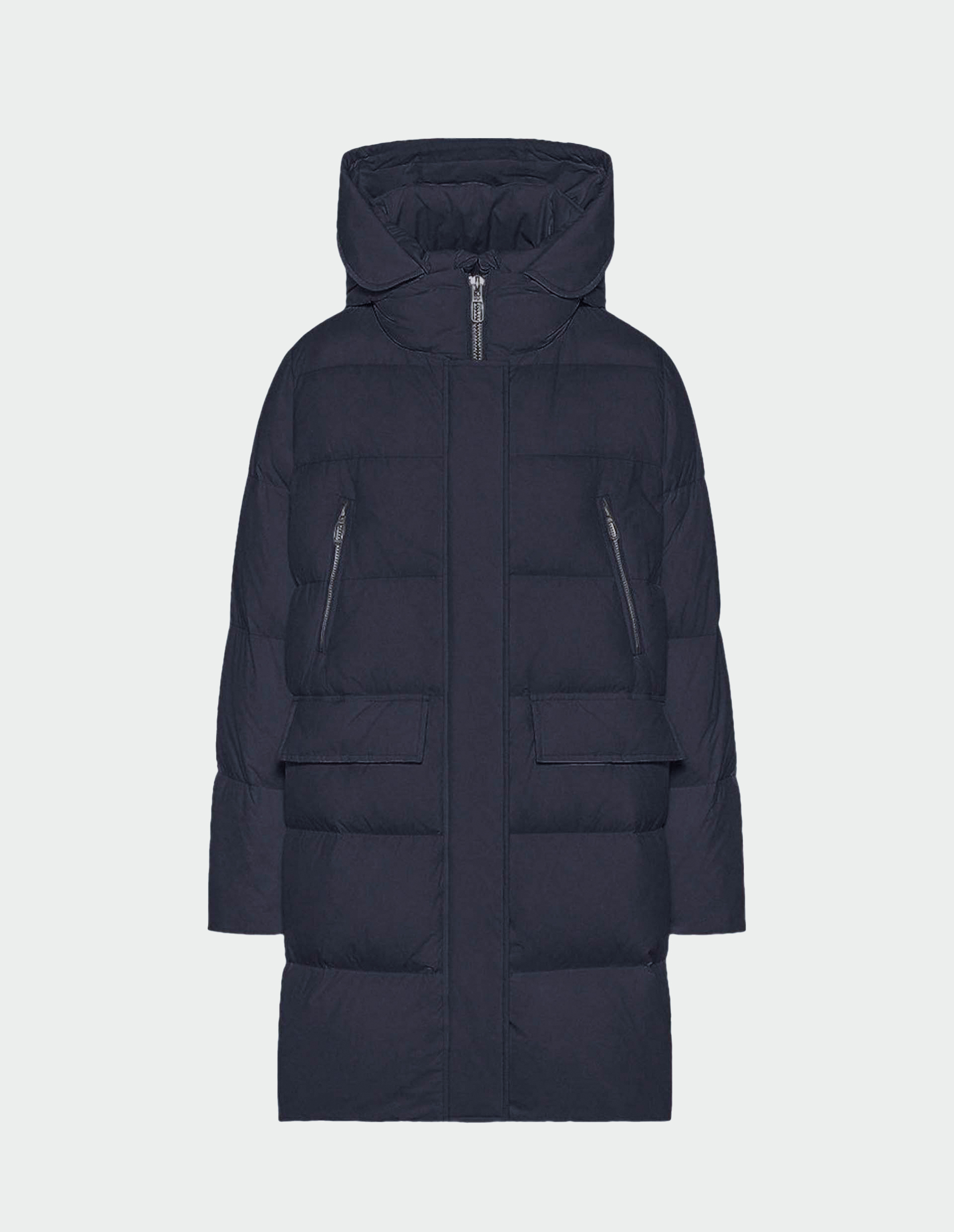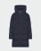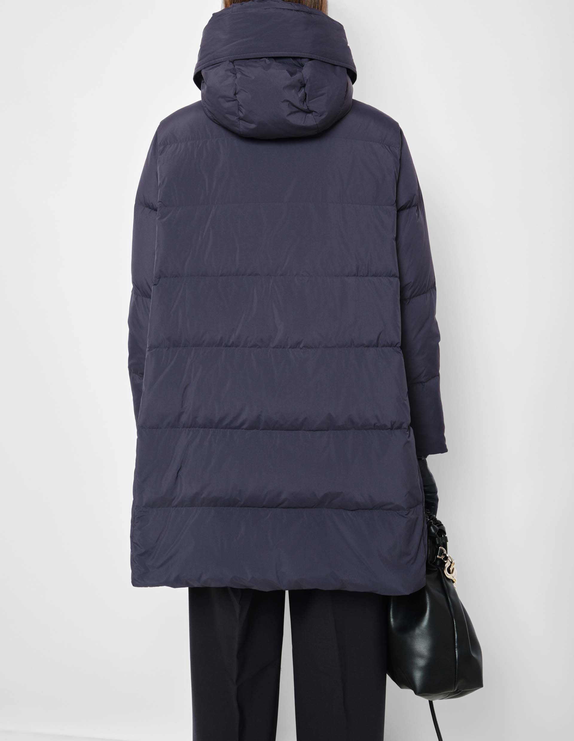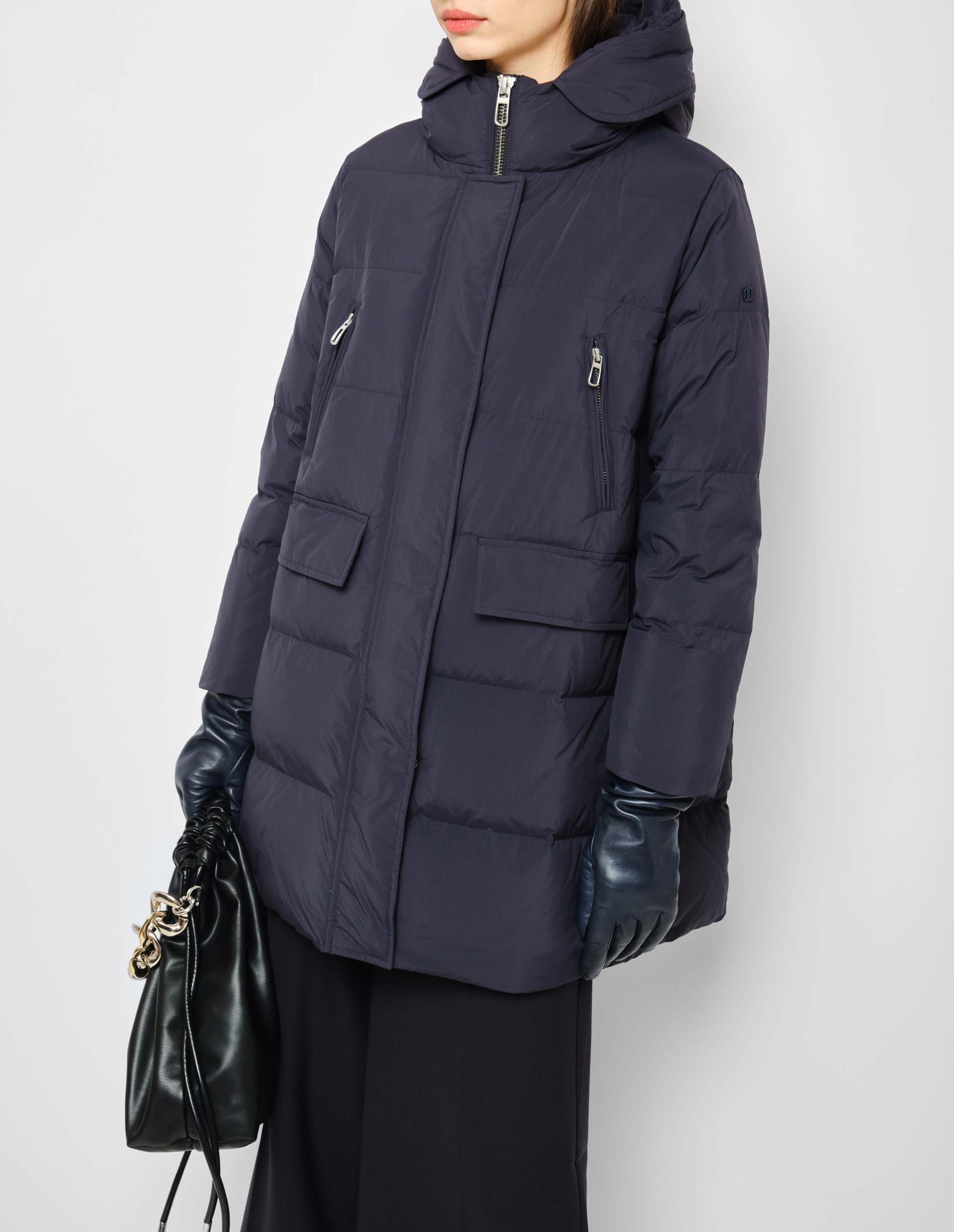 Удлиненный синий пуховик CIRCE с диагональными и скрытыми карманами с клапаном