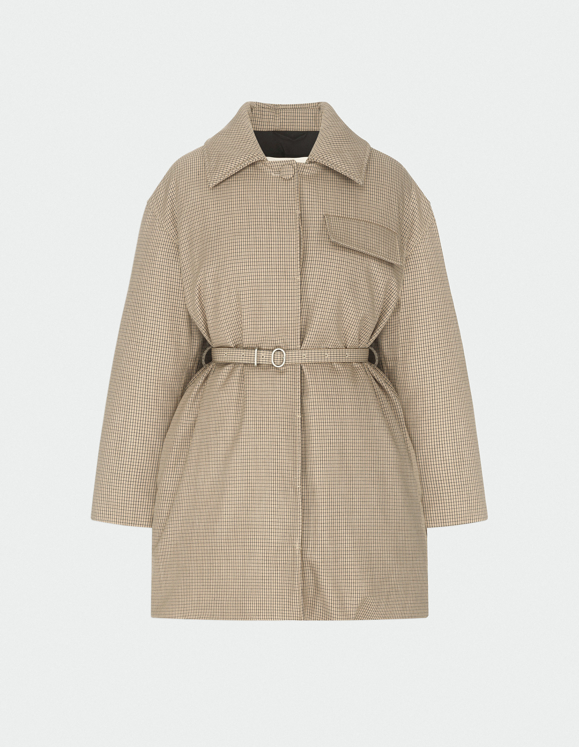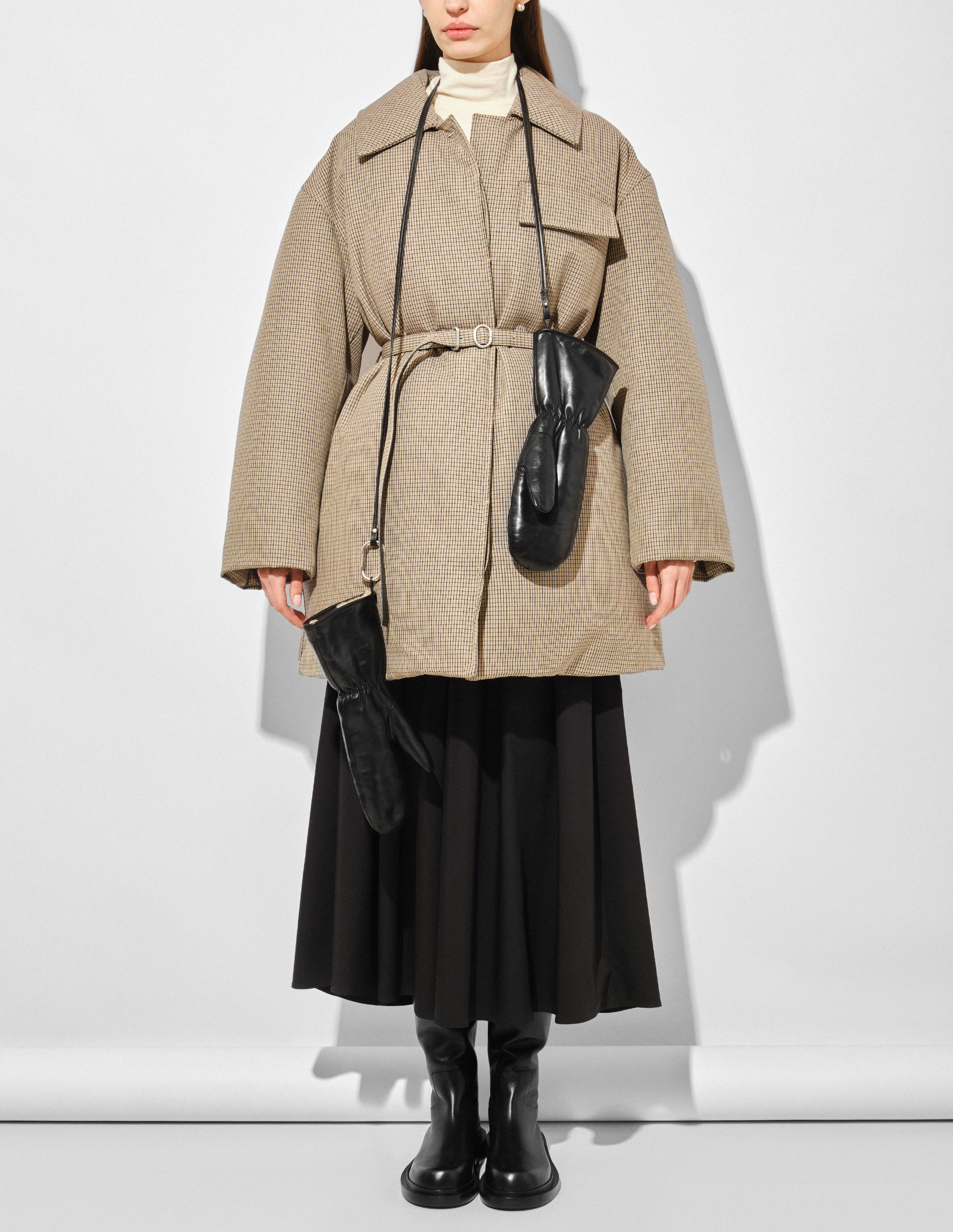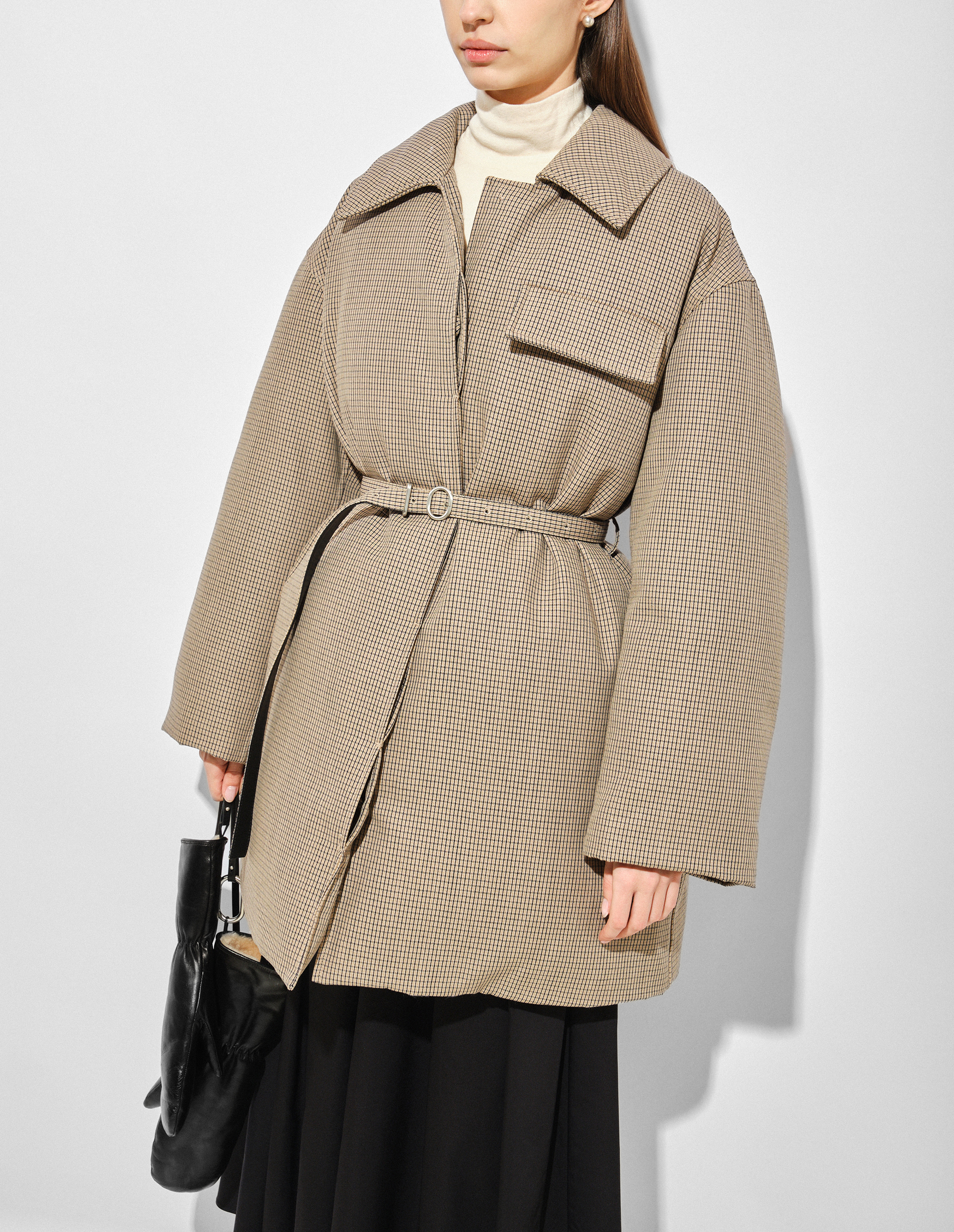Эксклюзивное пальто Jil Sander из люксовой ткани Wool check на основе 100% шерсти, имеющей мелкий клетчатый рисунок. Наполнителем модели является натуральный пух, сохраняющий тепло и формирующий дополнительный объем, что вместе с элегантным силуэтом создает особое взаимодействие пропорций, обеспечивая определенную свободу в стилизации, позволяя владелице создавать уникальные и динамичные образы. Конструкция пальто отмечена отложным рубашечным воротом, нагрудным карманом с клапаном, а также супатной застежкой, сохраняющий минималистичную эстетику. Комплектный тонкий пояс с металлической пряжкой изысканно подчеркнет талию и структурирует крой.