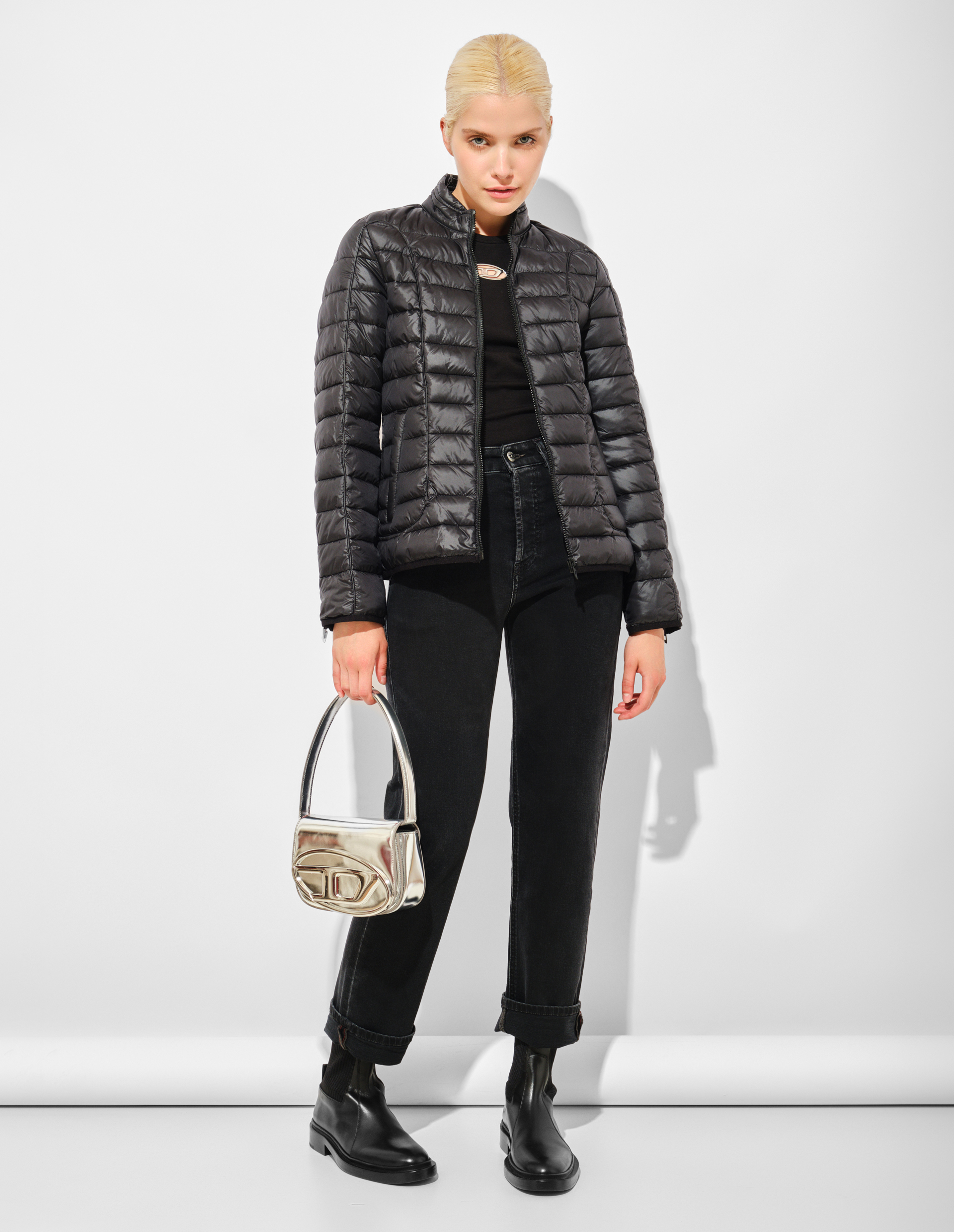 Черная куртка W-Pilot-Fem — интерпретация культового байкерского силуэта 90-х с современным подходом. Характерные детали — канты и манжеты на молнии — отсылают к архивному стилю, а приталенный крой делает образ актуальным. Ультралёгкий стёганый материал с утеплителем из переработанных волокон сочетает экологичность с функциональностью. Фирменные акценты: нашивка в виде овальной буквы D на рукаве и D-образные бегунки молний — минималистичные, но узнаваемые штрихи. Корпус, подкладка и наполнитель из 100% переработанного полиэстера сокращают использование первичных ресурсов без ущерба для качества. Брутальный шик прошлого, переосмысленный через призму устойчивого производства — типичный Diesel-подход к современной outerwear.