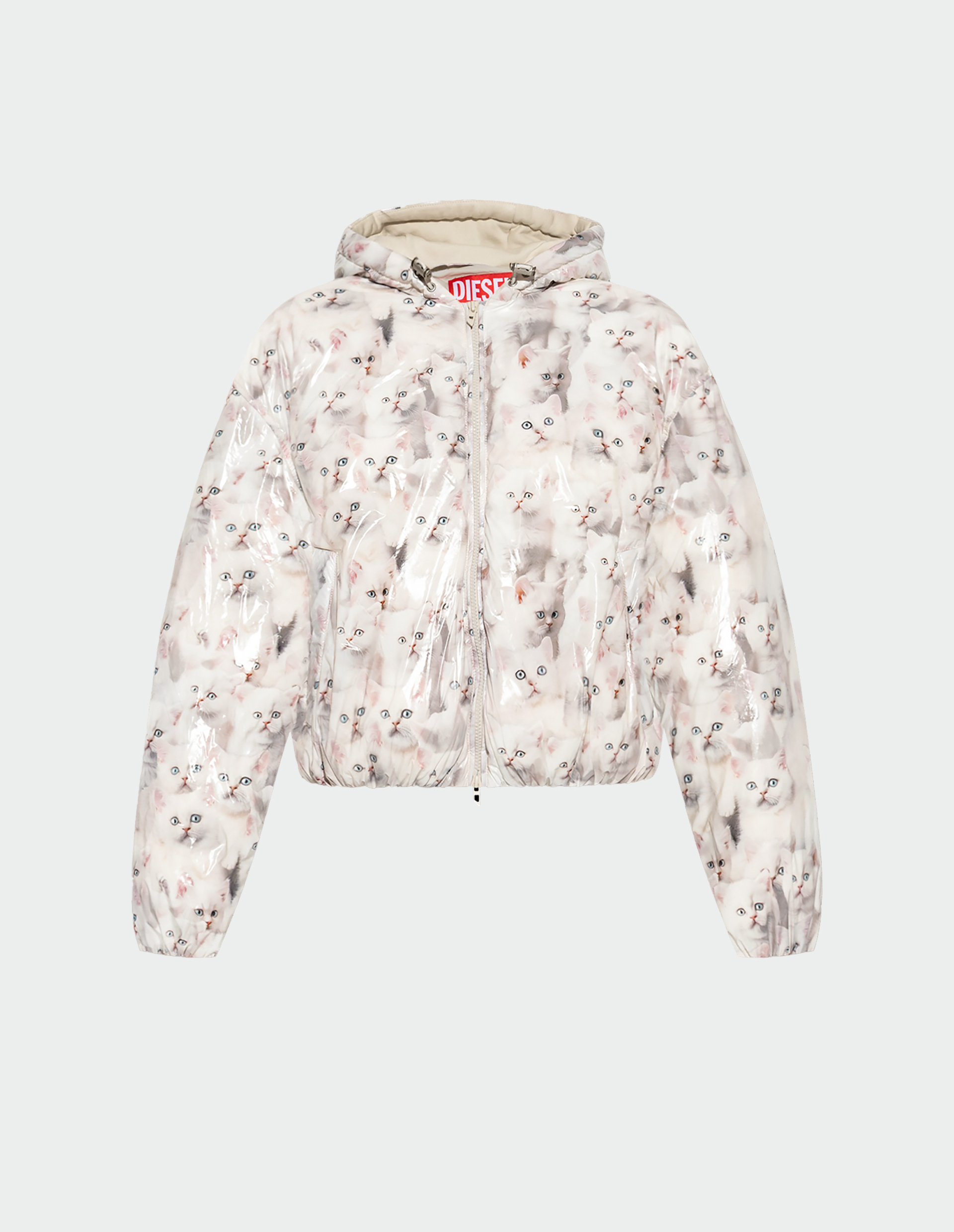 Стеганая куртка с принтом игривых котят бросает вызов уличной эстетике. Глянцевый нейлон с утеплителем создает контраст между мимишной нежностью и технологичностью материалов. Двусторонняя молния и регулируемые завязки позволяют моделировать силуэт, подчиняя функциональность индивидуальному стилю. Так Diesel ведет неожиданный диалог между мягкостью и утилитарностью, отражая собственную философию, где провокация рождается из смешения несочетаемого, превращая повседневную вещь в манифест свободного самовыражения.