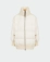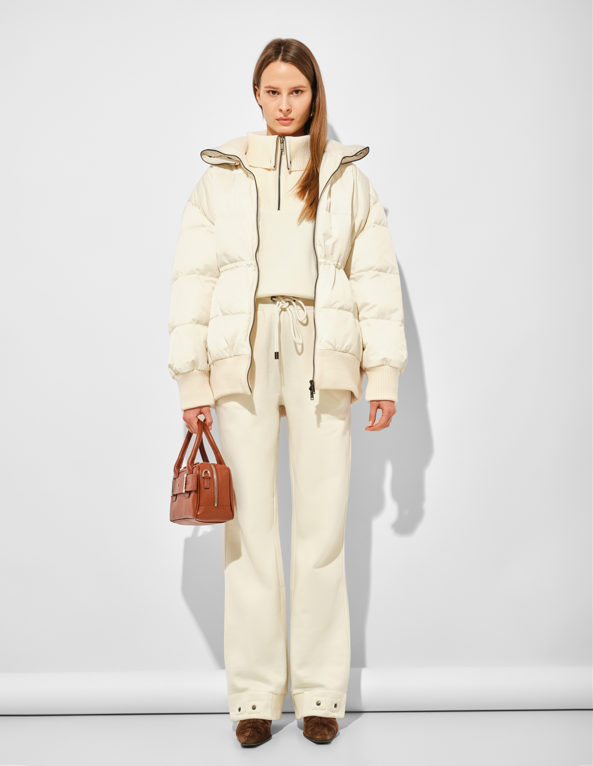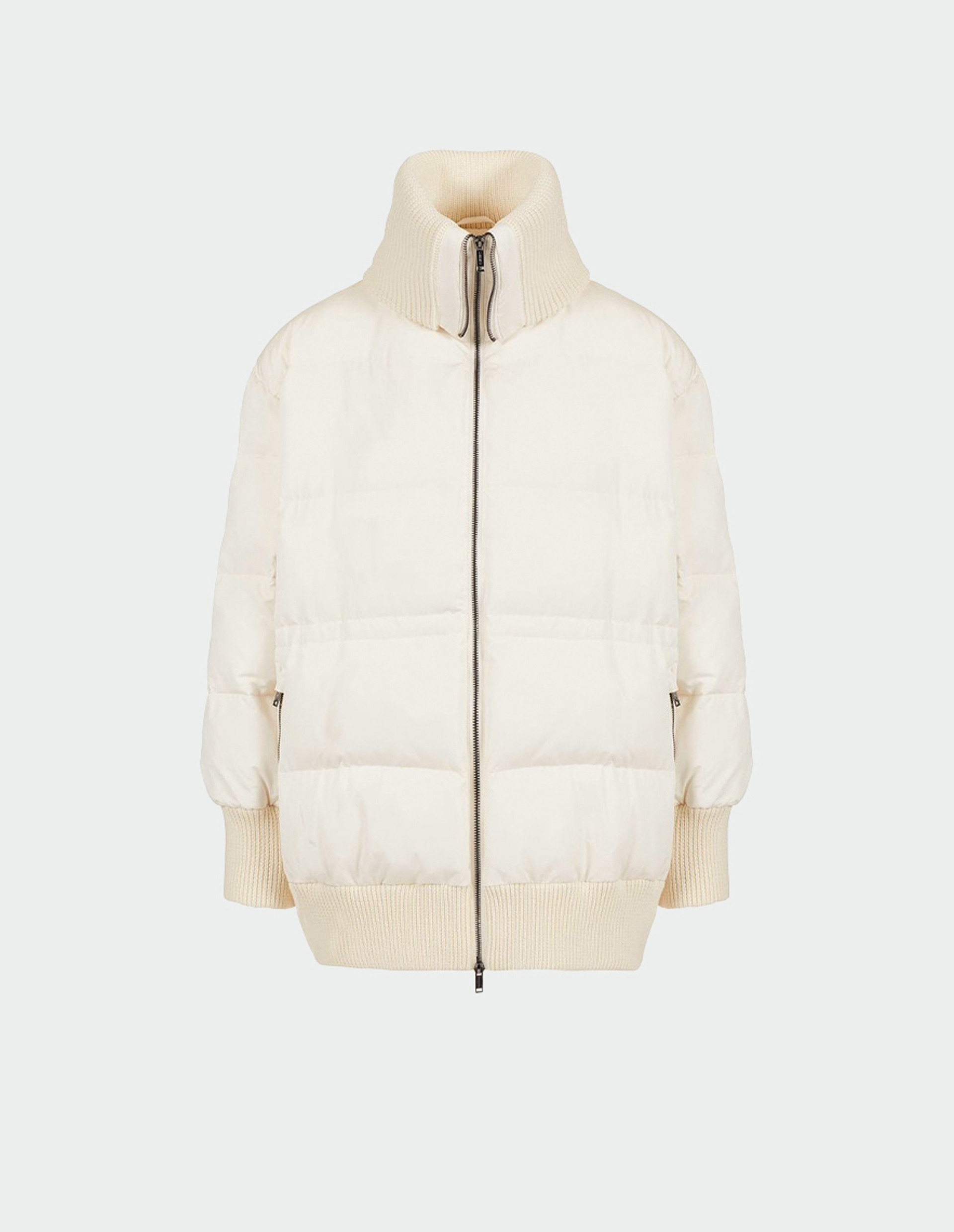 Бежевый пуховик с высоким воротником и вязаными манжетами