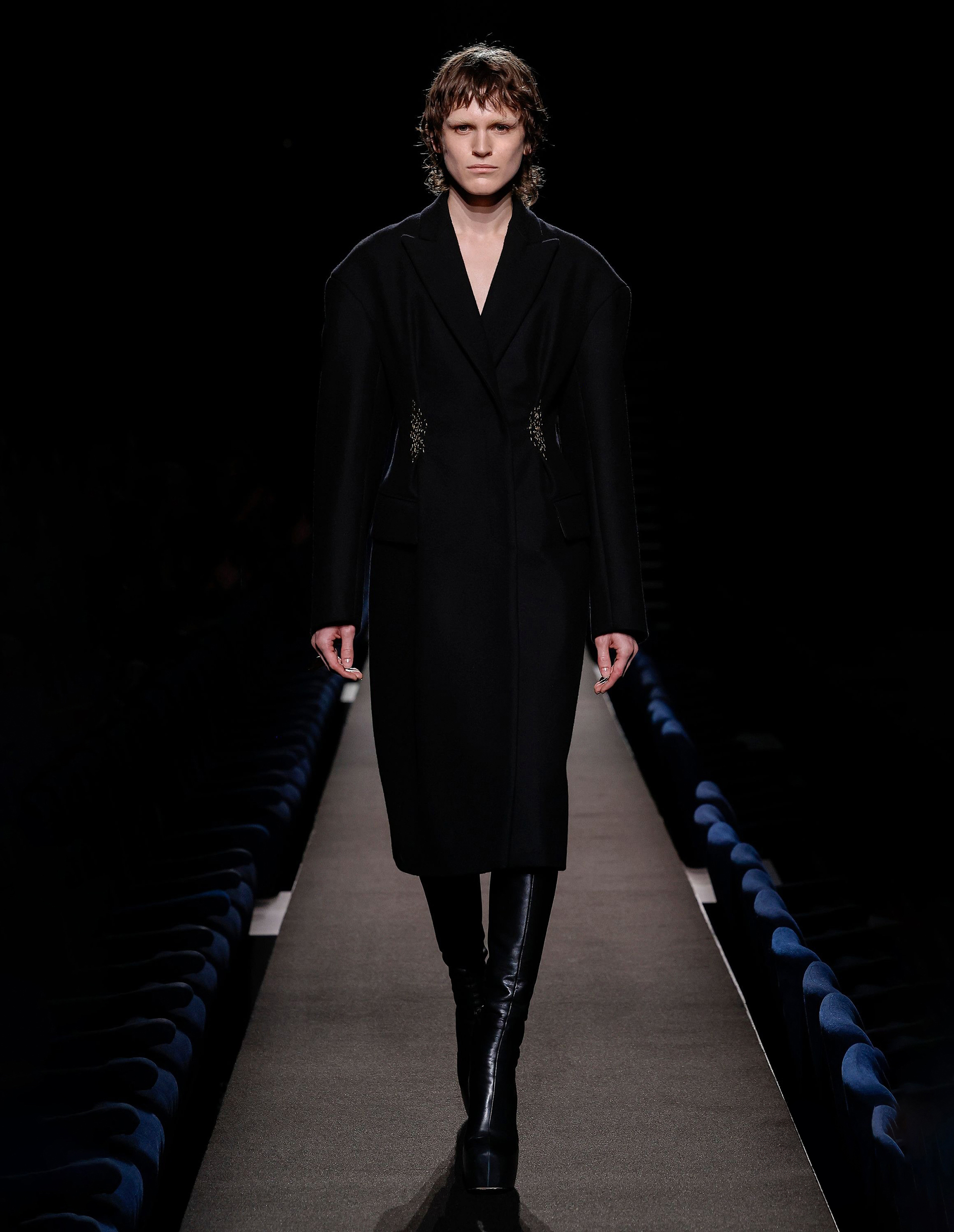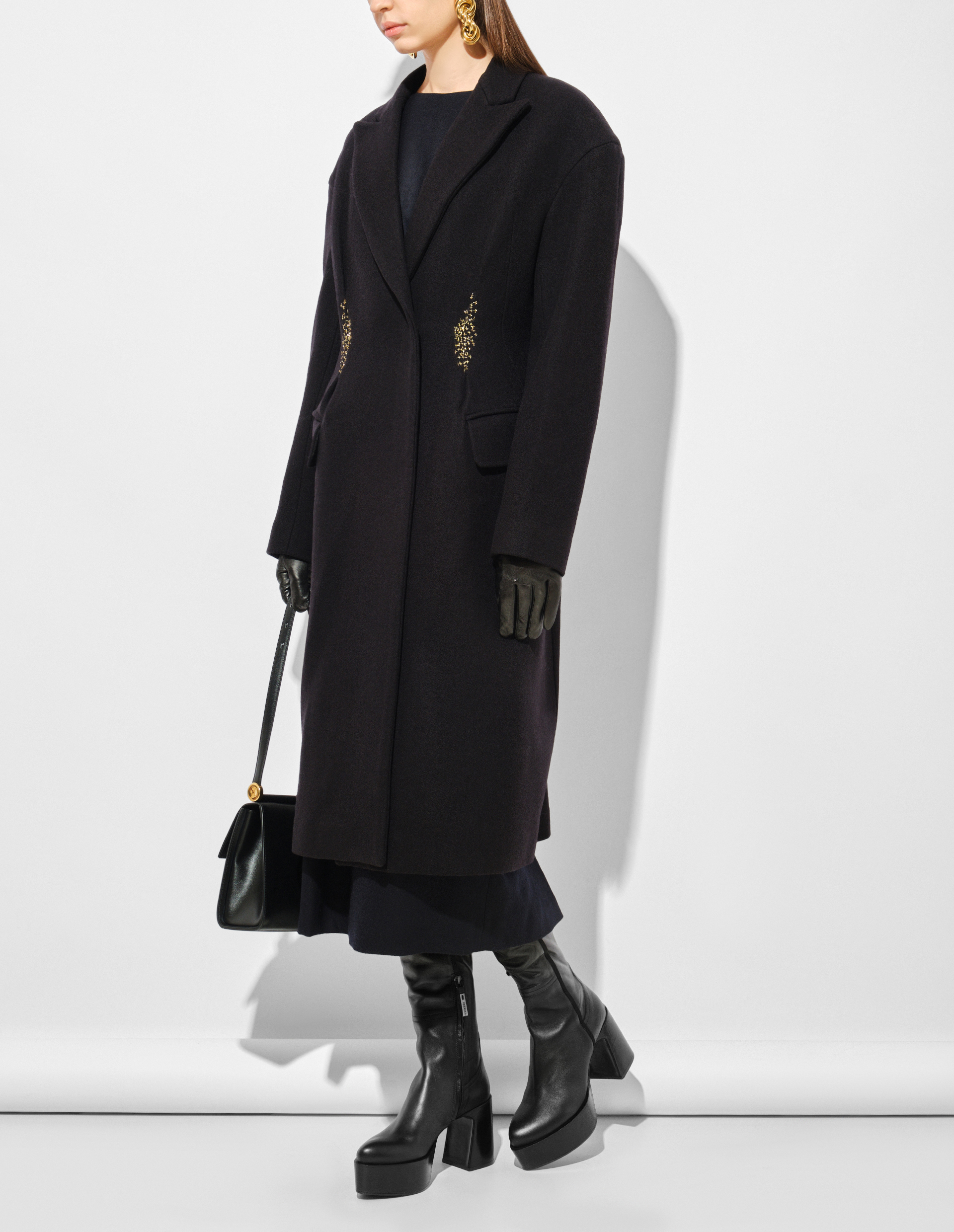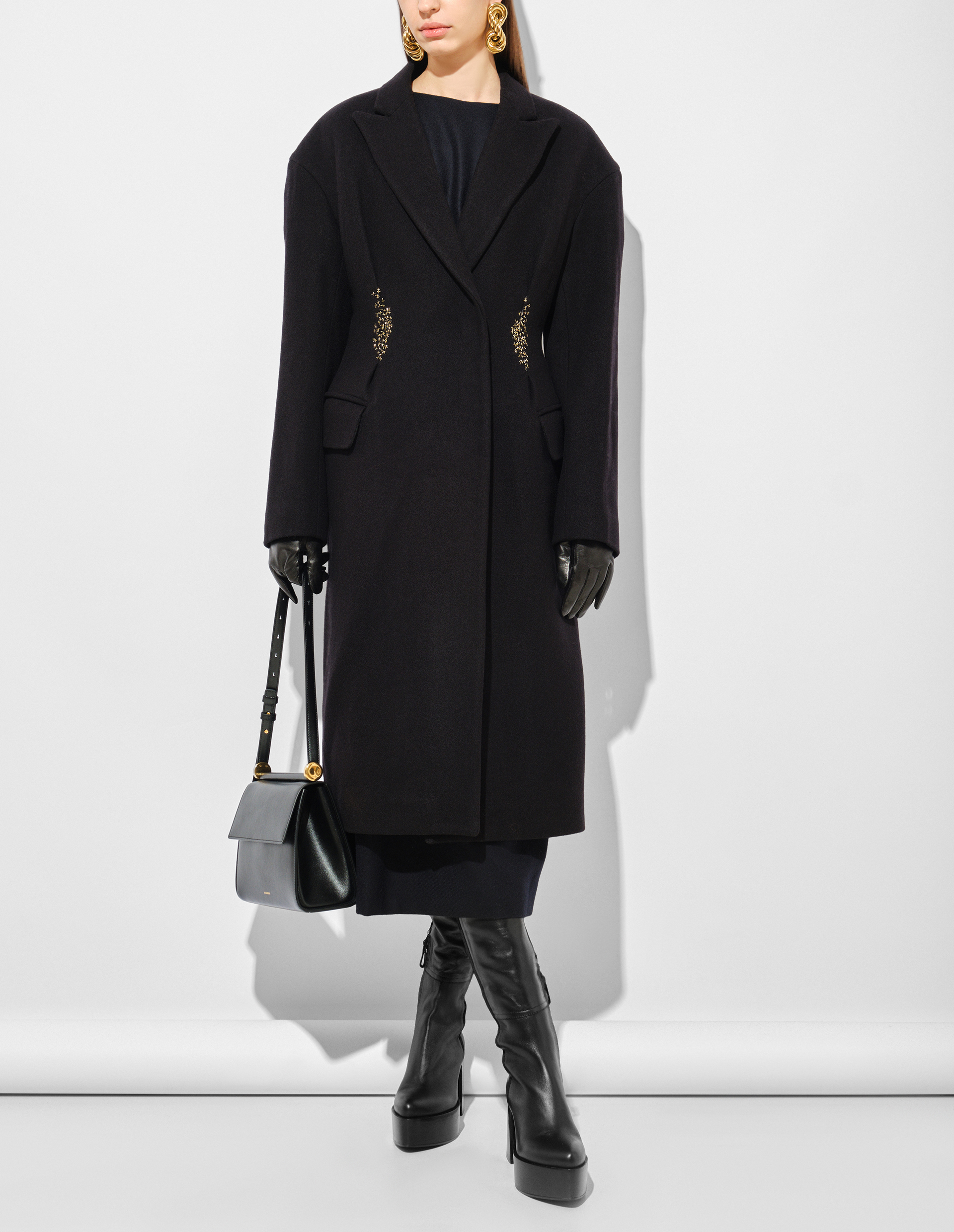 Создавая это пальто, гениальный Dries Van Noten исследовал силу контрастов: драгоценное и изысканное с чем-то брутальным, неотшлифованным, масштабные жесты, смешанные с акцентом на мелких деталях. Оно изготовлено из 100% шерсти felted wool, поставляемой с английских фабрик, и сваляной вручную, чтобы добиться как можно большего числа точек соприкосновения волокон и получить особо плотный материал. В результате к материалу был применен новый, авторский пошив с подчеркнутыми плечами, острыми лацканами и узкой талией. На ней, также опытными руками мастеров, появилась геометрическая вышивка из люрекса и бисера, наделившая пальто еще большей ценностью, превратив его в вещь, которую берегут и придают ей особое значение.