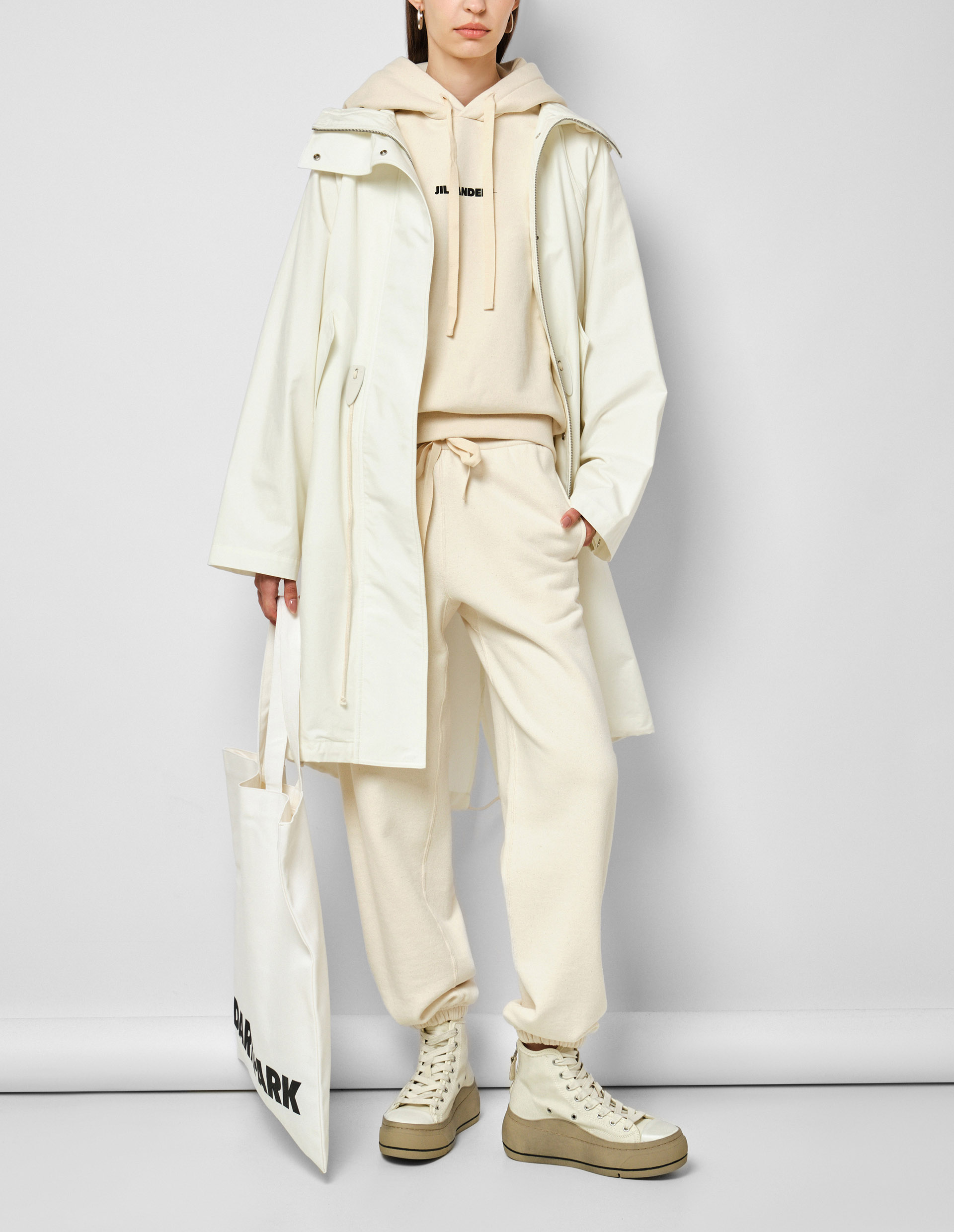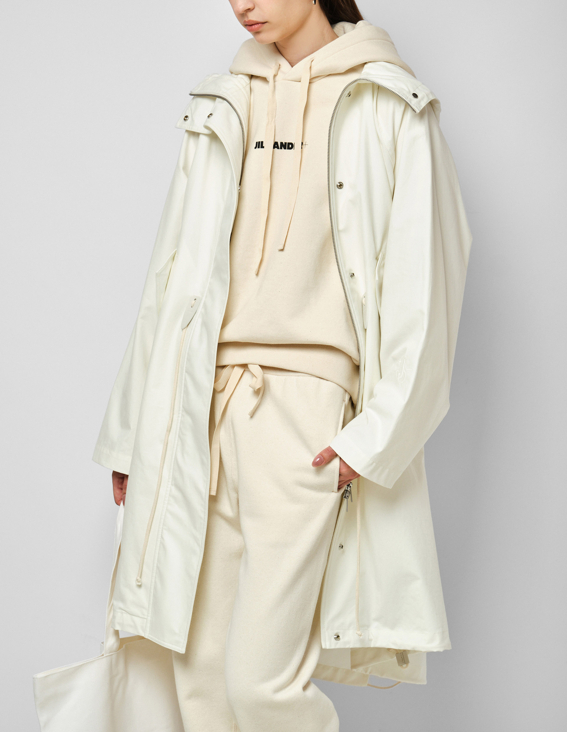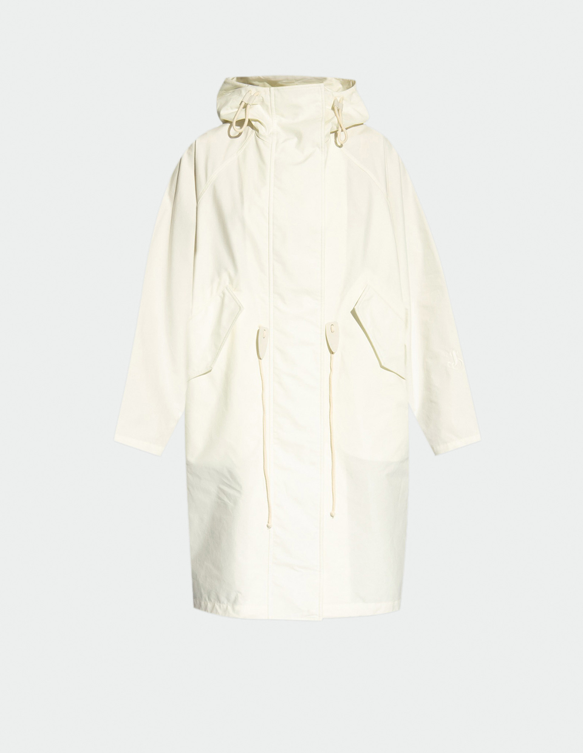 В исполнении культовым брендом Jil Sander даже практичный плащ приравнивается к роскошному и шикарному элементу гардероба современного человека. Модель с безупречно молочном оттенке выполнена из натуральной и гладкой кожи, а для максимального уровня комфорта, дополнена мягким и дышащим подкладом из органического хлопка. Функциональность оправдывается объемным свободным кроем, двусторонней молнией, а также эластичным кулискам на капюшоне и талии, которые не только призваны защитить в непогоду, но стильно акцентировать внимание к тонкой талии.