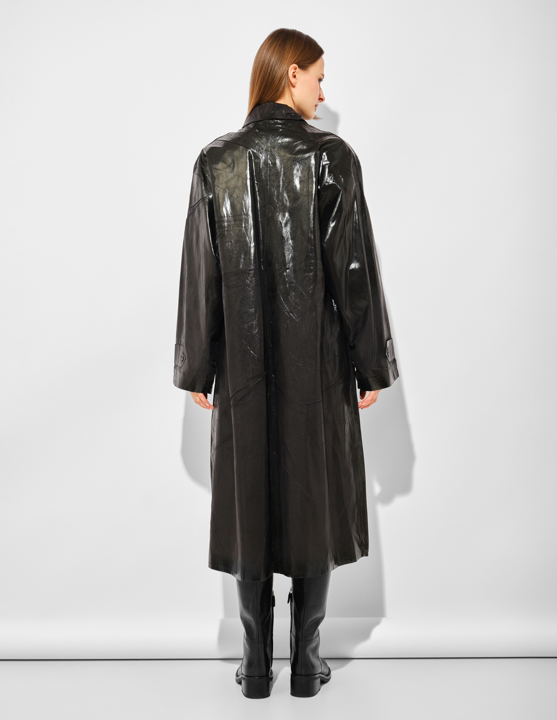 Модель тренча из последней коллекции Джона Гальяно переосмыслена через радикальную призму: её поверхность создана с помощью многослойного процесса аэрографии, нанесения металлизированной фольги и прессования для усиления контраста. Каждое пальто вручную доводится до уникального результата, рождающего глянцевую, потрескавшуюся фактуру, которая мерцает и меняется с каждым движением. Этот лаково-металлический камуфляж разбивает узнаваемый силуэт тренча на тысячи отражений, превращая его в живой, дышащий объект. На спинке, как печать подлинности в этом цифровом пейзаже, — четыре белых стежка, анонимная подпись Дома.