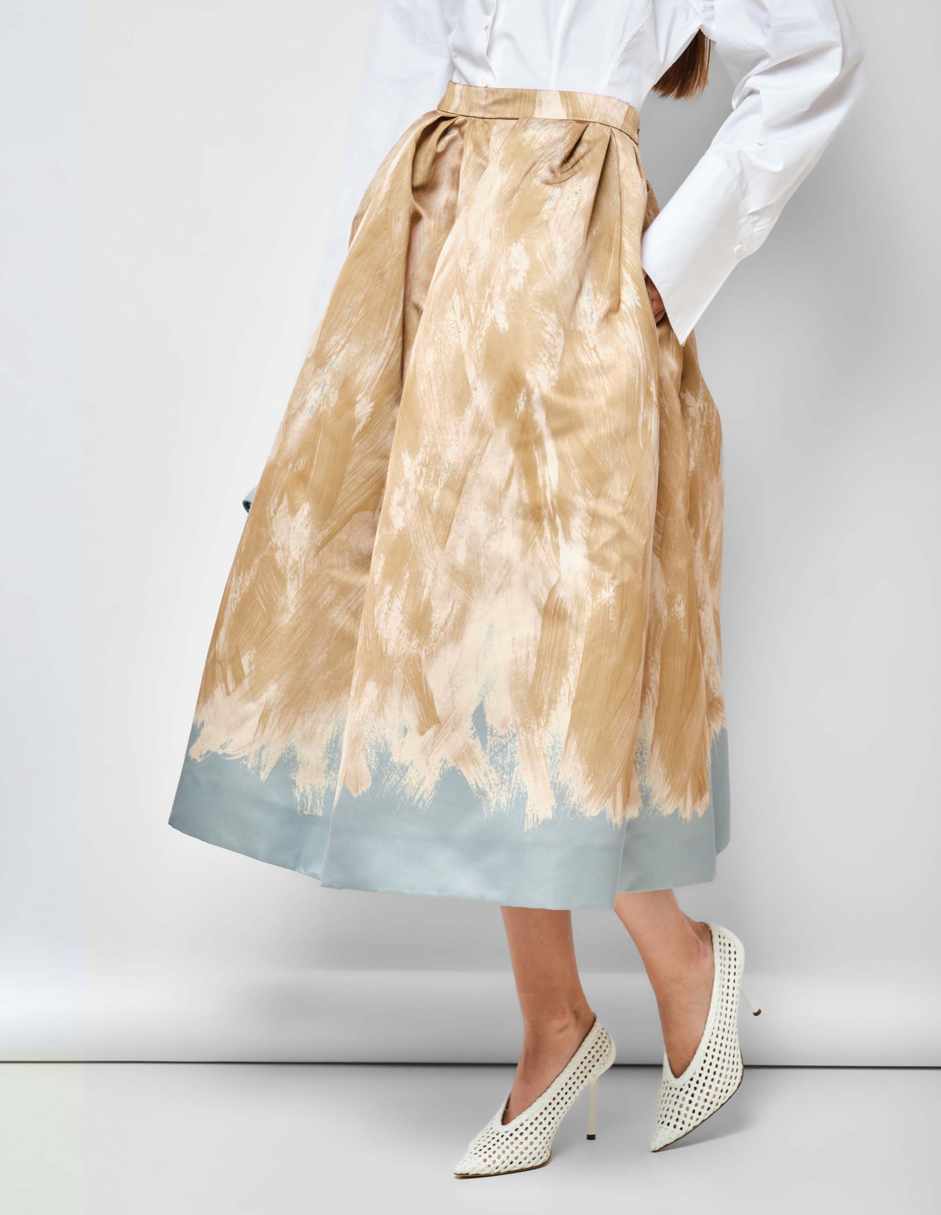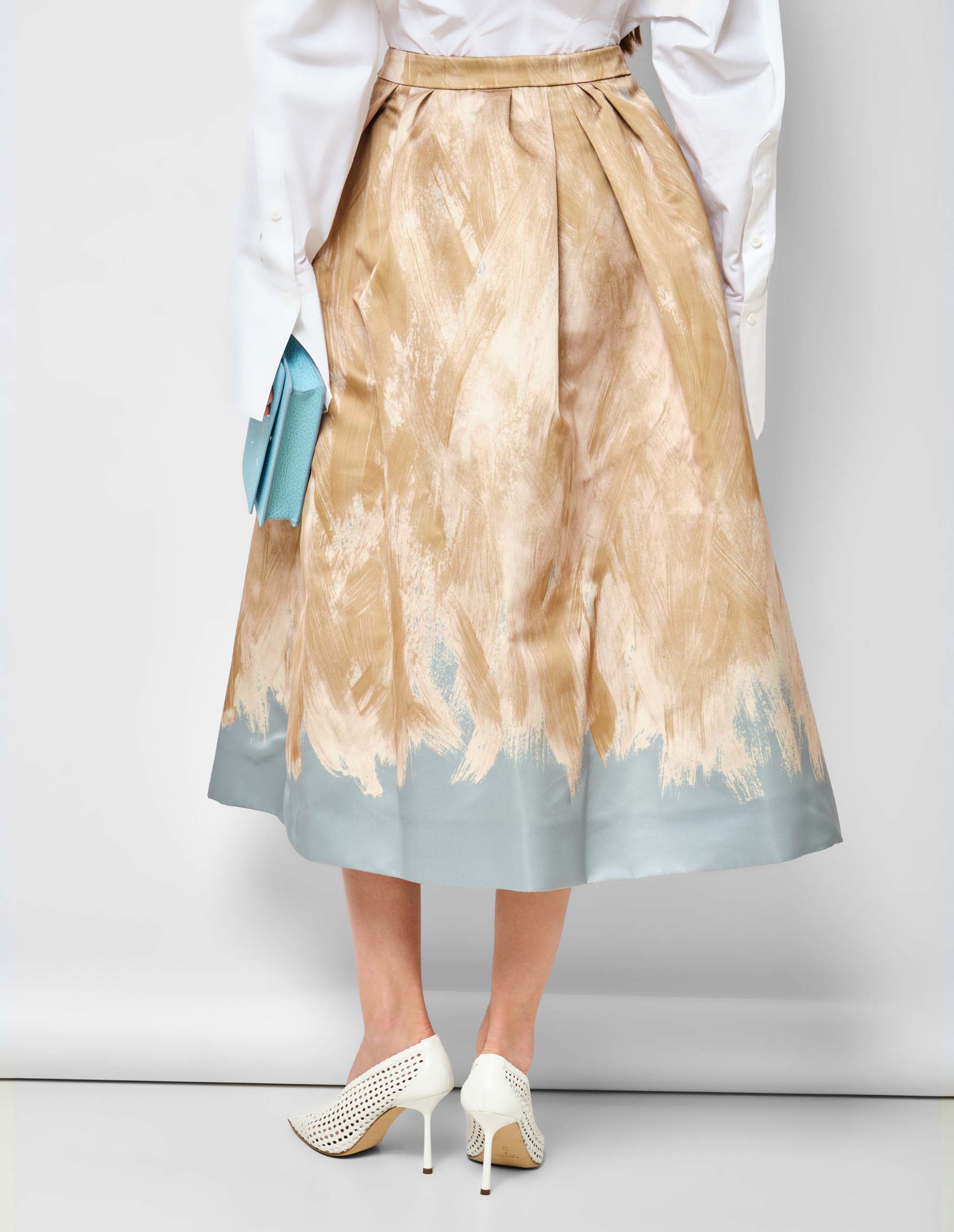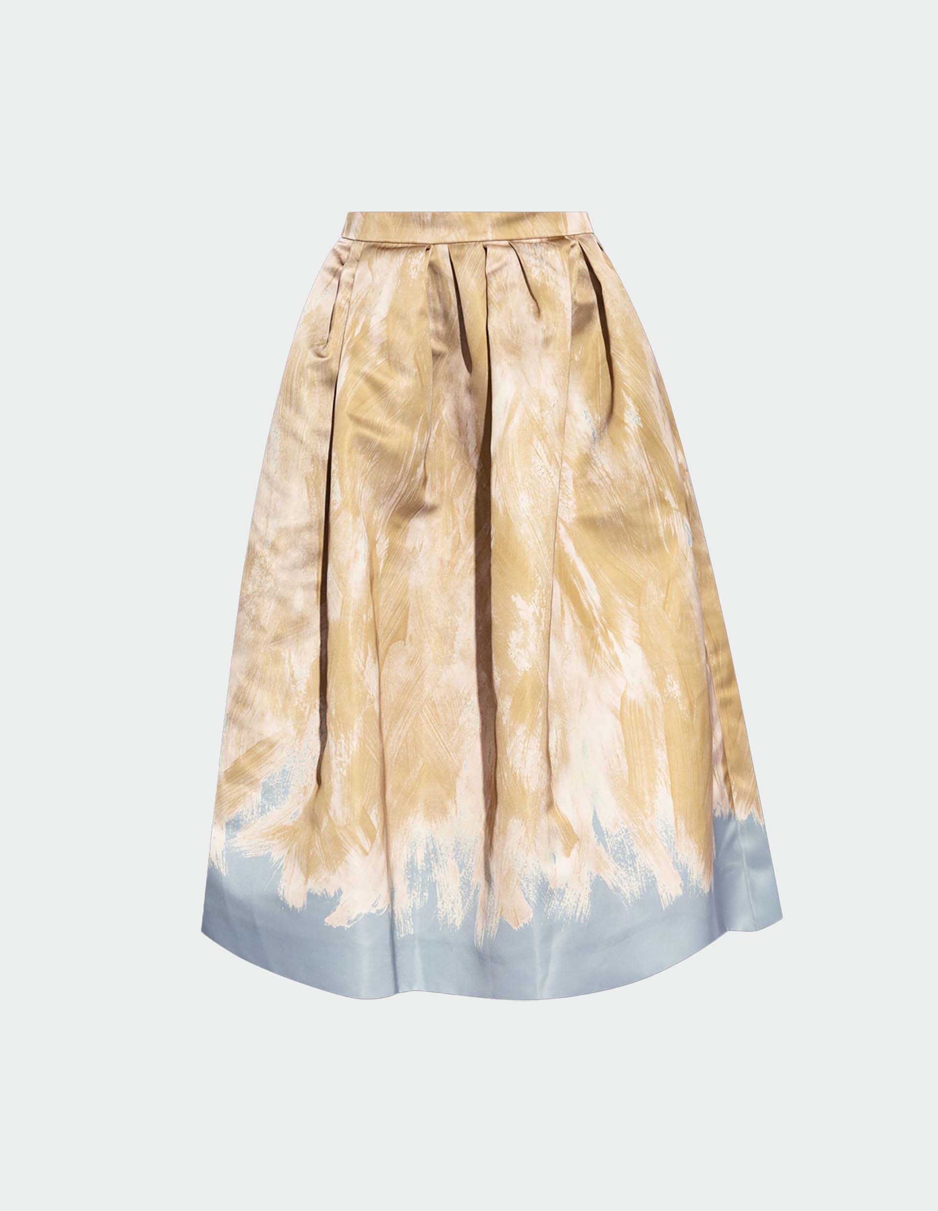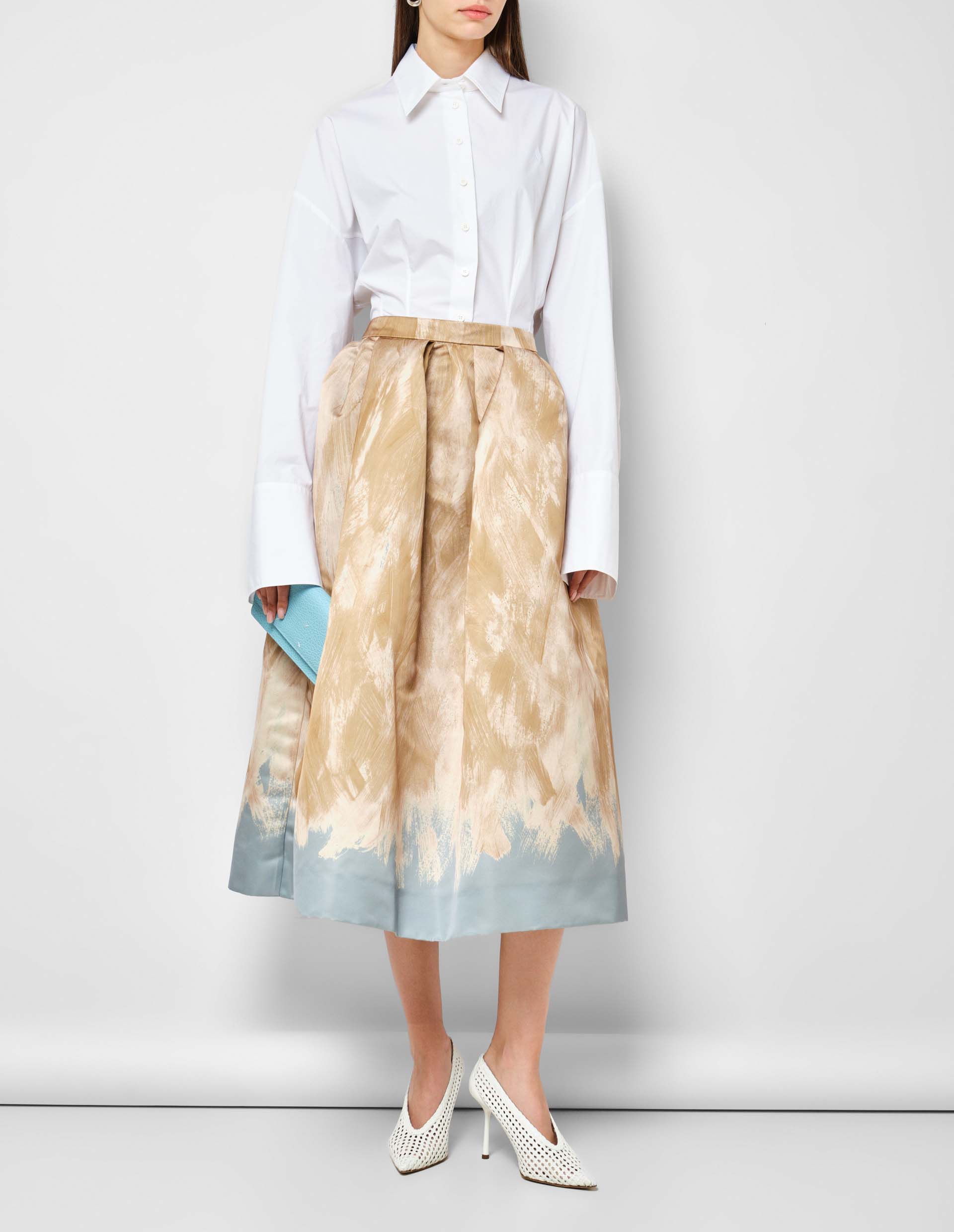 Женственность, одновременно нежная и сильная, вдохновила великого Dries Van Noten на создание этой великолепной юбки с объёмным А-силуэтом. На голубой фон, практически полностью его перекрывая, вручную нанесен рисунок, напоминающий хаотичные мазки кисти. Такой аутентичный принт стал визитной карточкой интеллектуального дизайнера. Для практичности, но не нарушая целостность конструкции, добавлены боковые карманы и скрытая застежка.