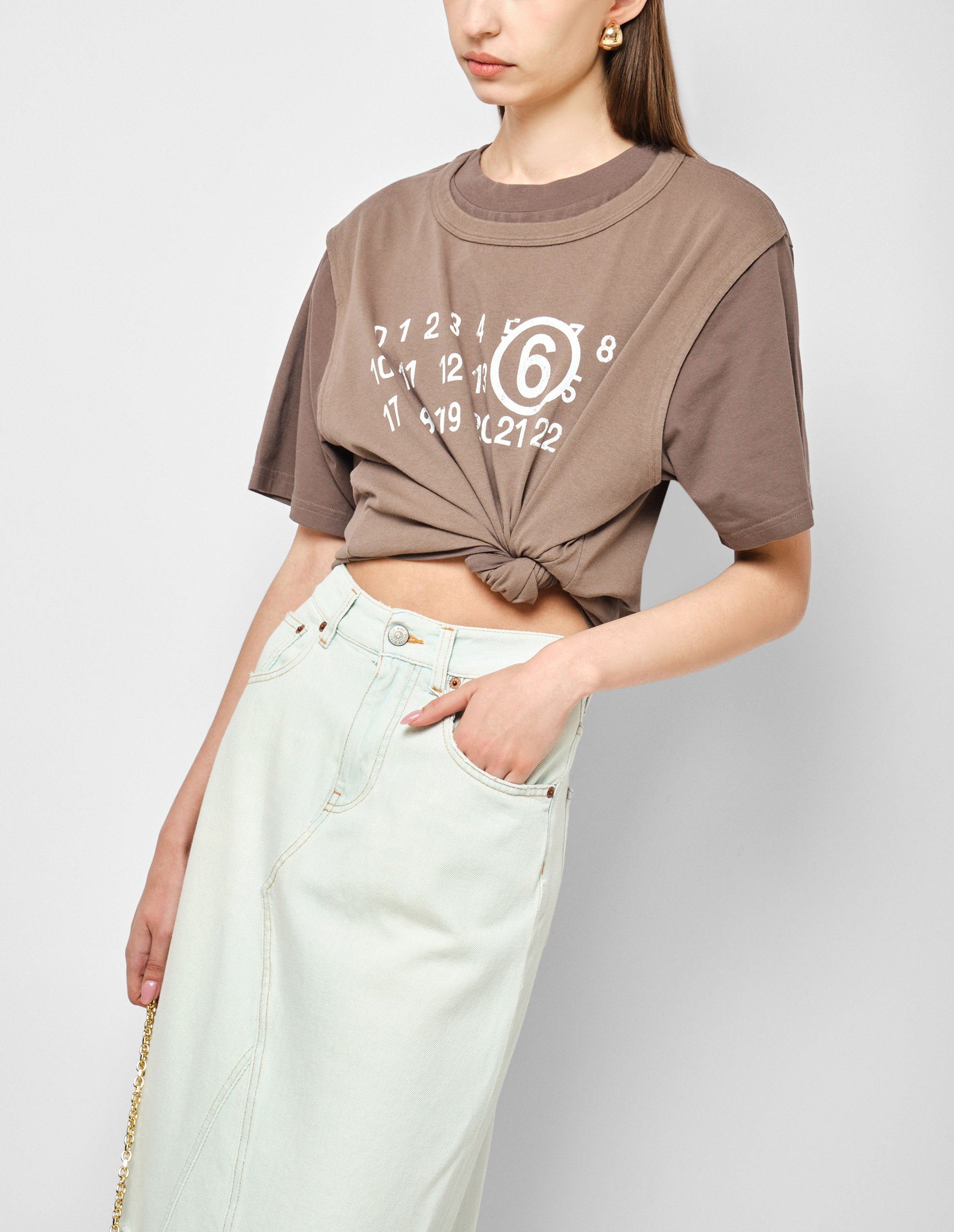 Джинсовая макси-юбка MM6 будто составлена из полосок стираного органического денима в выбеленном голубом оттенке с фактурными необработанными краями, карманами с клапанами и отличительными прорезями Maison Margiela в стиле модного дома. Слегка деконструированный дизайн поддерживается контрастной прострочкой в табачном цвете, а отличительный яркий патч акцентирует приверженность к культовому модному дому жакроновым логотипом с тиснеными цифрами.