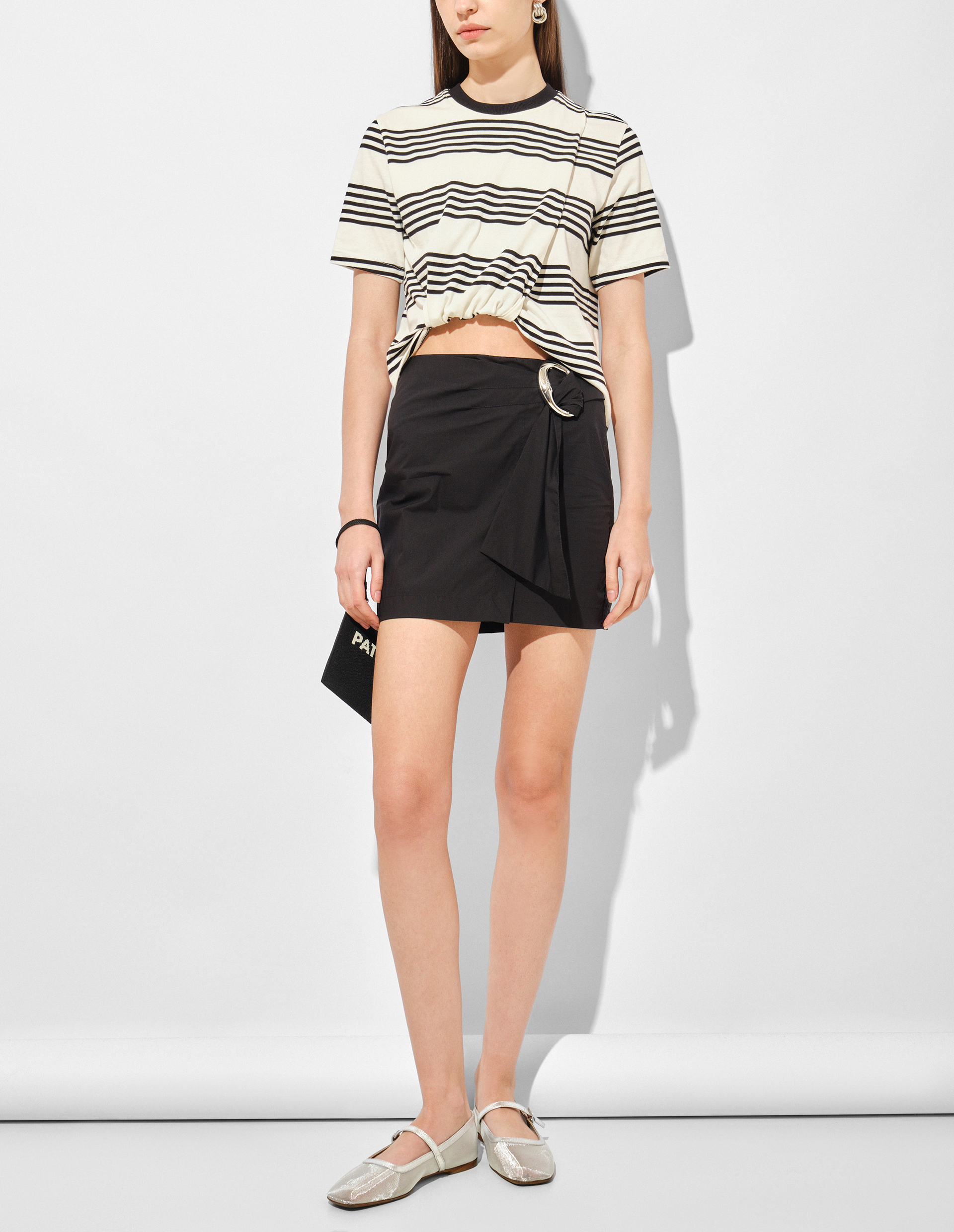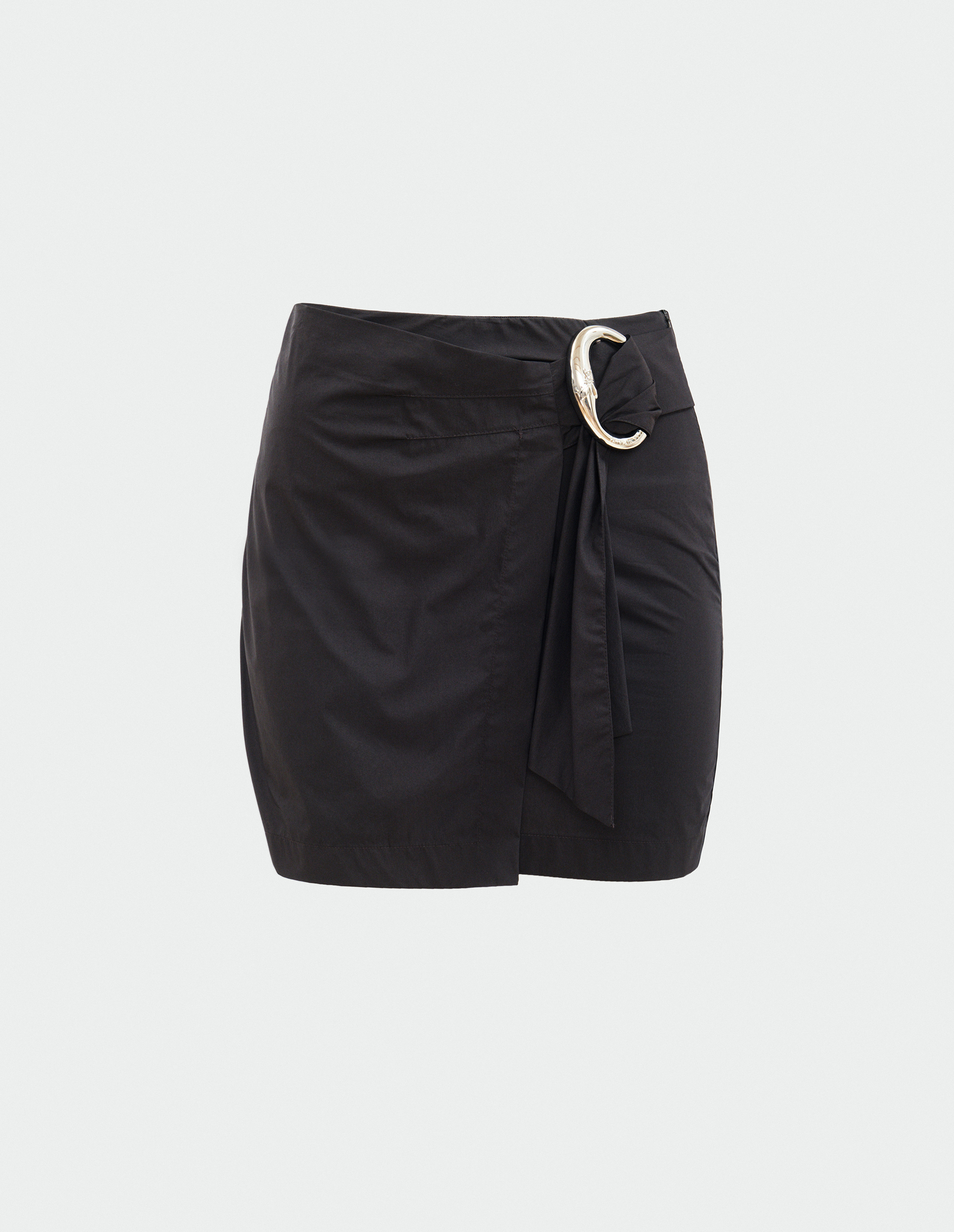 Союз комфорта и стиля. Гламурная модель выполнена из практичного креп-жоржета с высоким содержанием хлопка (65%). Благодаря натуральному составу юбка не электризуется и не нарушает воздухообмен, сохраняя легкость и свободу движений. Эластичный пояс обеспечивает идеальную посадку. Стильный дизайн с запахом и крупным кольцом, украшенным мушкой Fly, вносит оригинальность в повседневные образы. Универсальный черный приглашает экспериментировать с цветом. Прямой крой и длина мини как основа для креативных комбинаций.