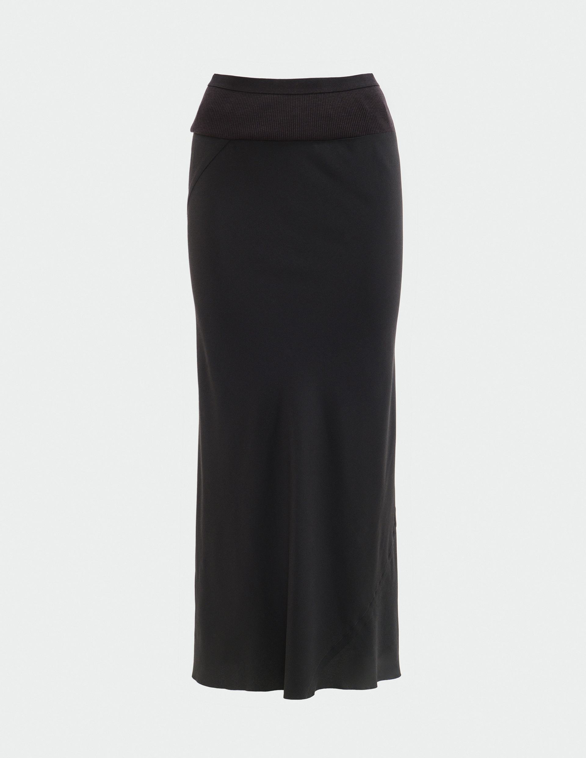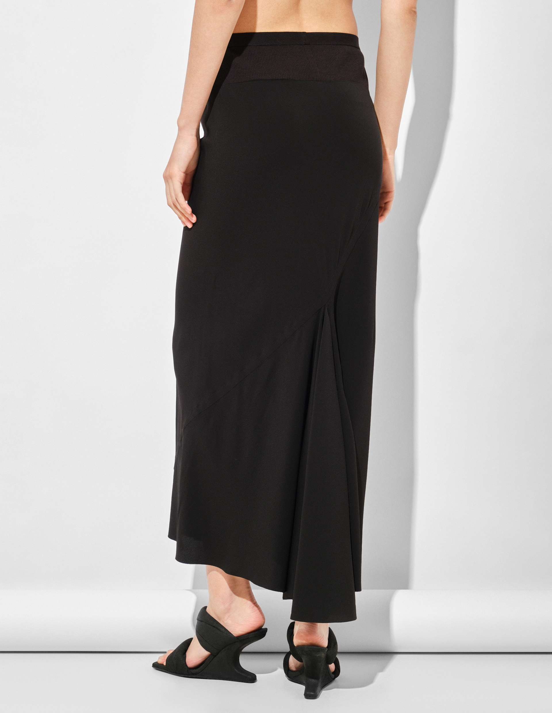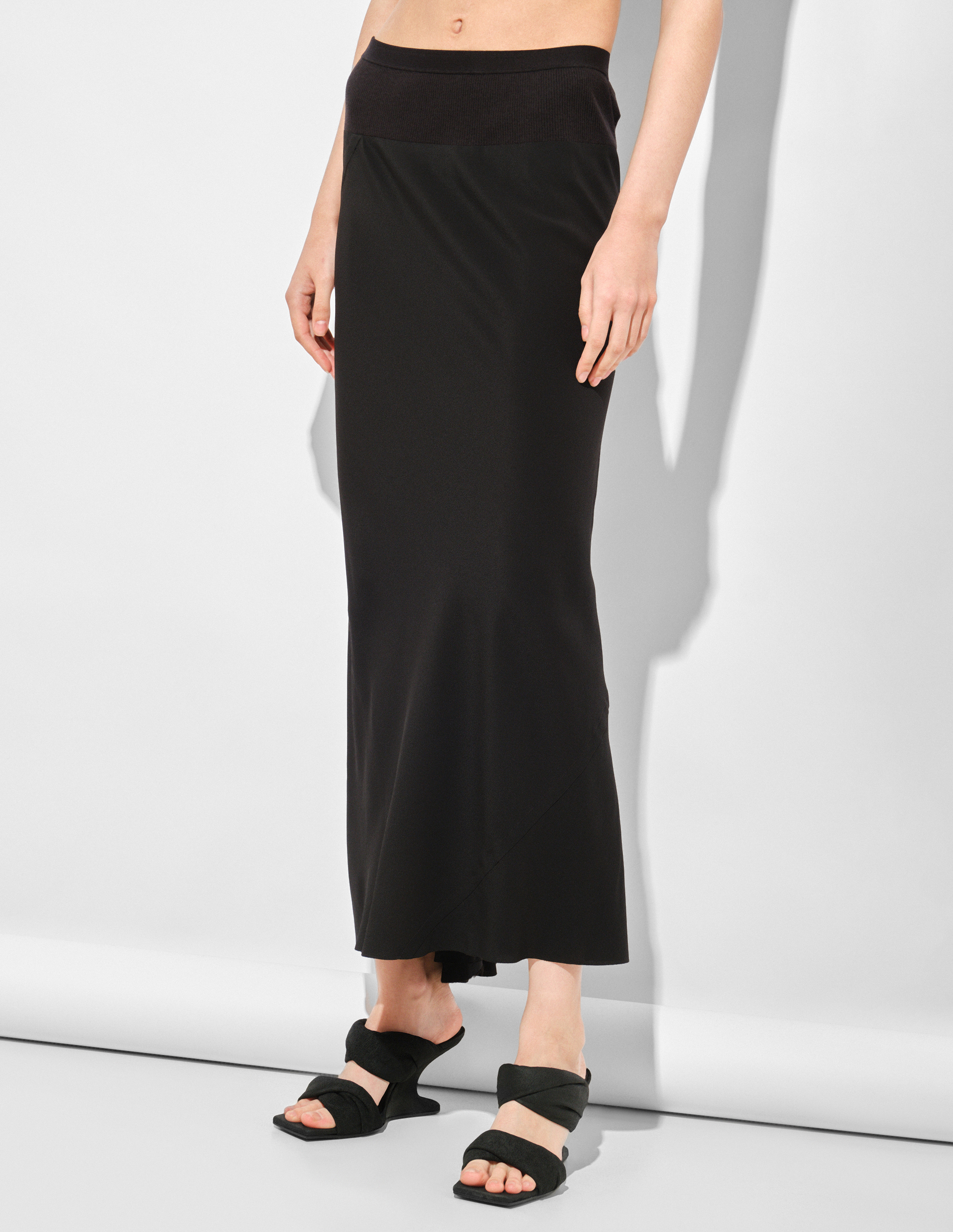 Юбка от RICK OWENS, ниспадающая до икр с архитектурной точностью. Широкая резинка на поясе мягко охватывает талию, создавая контраст между структурной верхней частью и расклешенным низом, который начинает свой разлет от колена. Диагональный крой по косой с драпированной вставкой сзади вносит диссонанс в симметрию — фирменный жест Owens, превращающий простую модель в скульптурный объект.